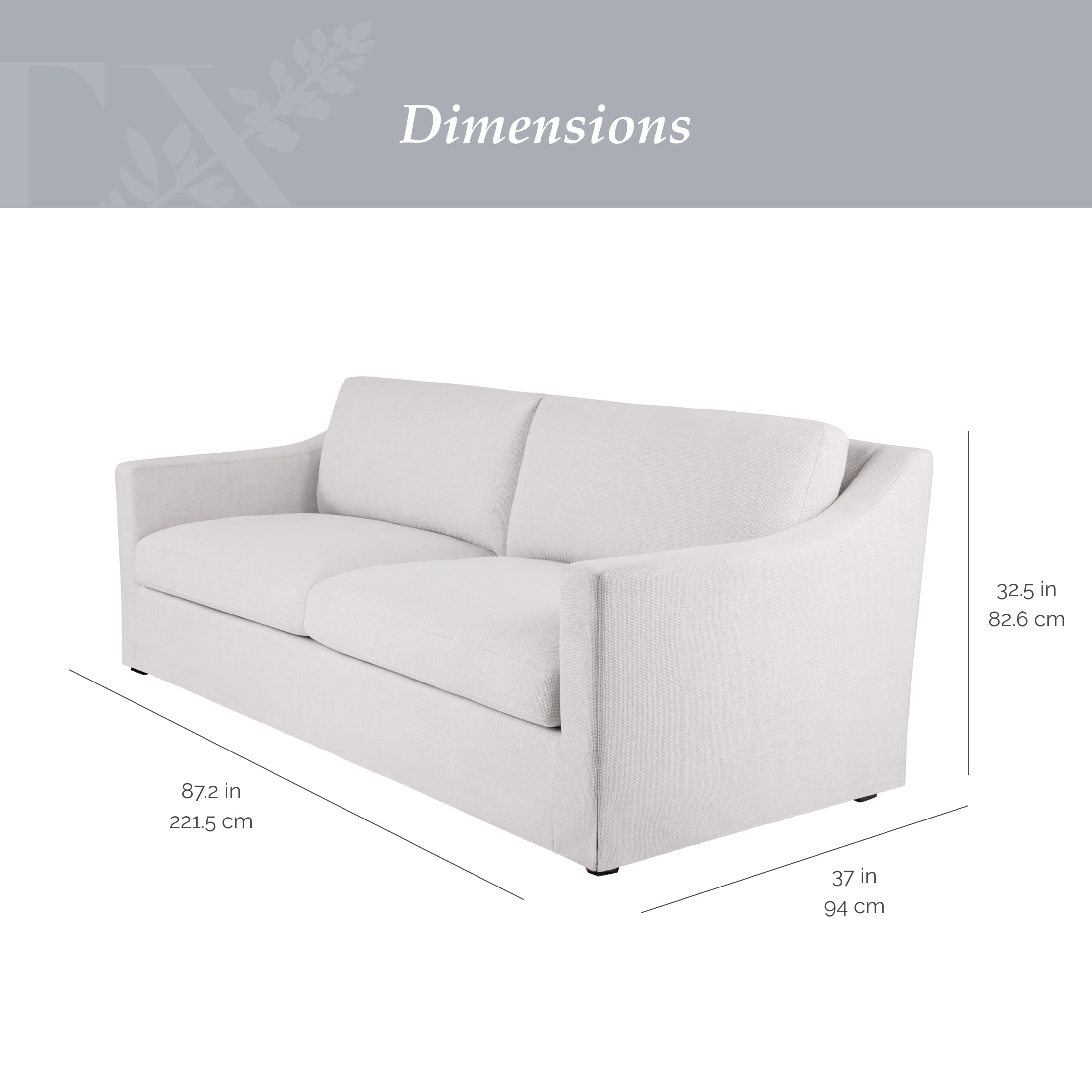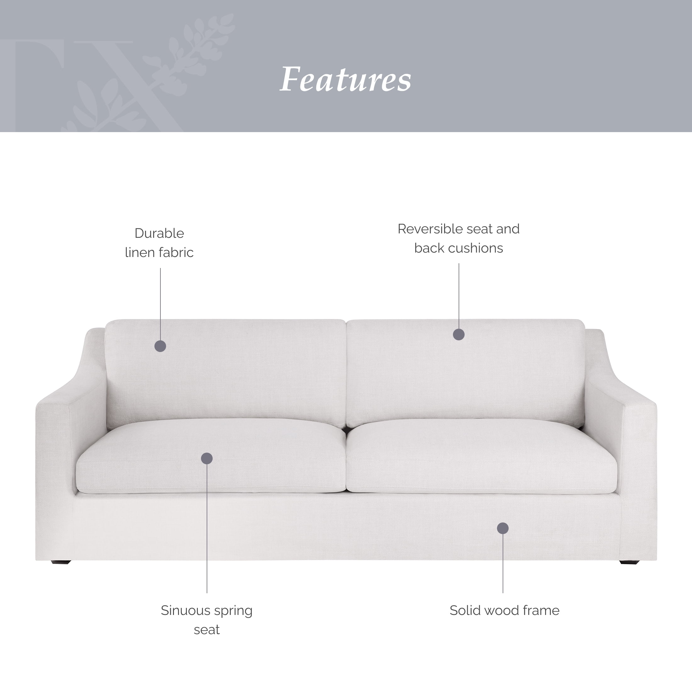 Spacious 87” Width: Ample room for family or guests Solid Wood Construction: Built to last, providing stability and durability for years to come Durable Linen Fabric: Cream linen upholstery adds a sophisticated look while being easy to maintain Sinuous Spring Seat Cushions: Ensure superior comfort and support Reversible Back Cushions: Versatile design for easy refresh and maintenance of your sofa’s appearance Contemporary Style: Elegant and modern style fits seamlessly into any living room or lounge area Product Dimensions: Product Dimensions: 87.2 in L x 37 in W x 32.5 in H (221.5 cm x 94 cm x 82.6 cm) Product Weight: 121 lb Packaging Dimensions: 88 in x 19 in x 28 in Model# MT432649B888501