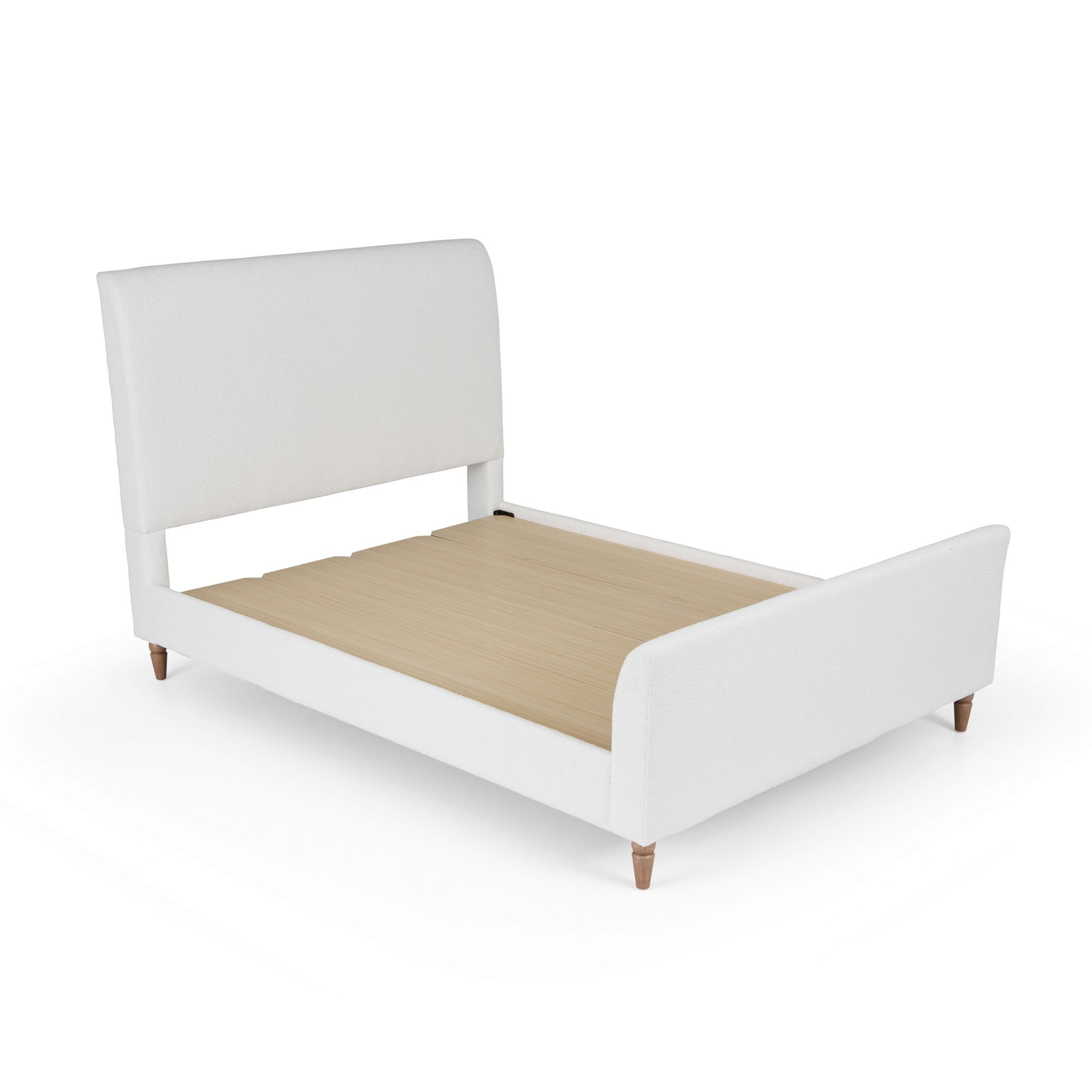 CHARMING BOUCLE FABRIC: Thoughtfully designed with charming boucle fabric in a cream color that is durable, beautiful, and naturally fade and stain resistant TIMELESS DETAILS: Rustic wood legs and a slightly curved headboard and footboard create a sophisticated feel that will never go out of style COMPATIBILITY: Full wood slats provide even support across the entire bed for use with all mattress types, no box spring required, and it is adjustable bed base compatible RELIABLE CONSTRUCTION: Made with solid oak wood and the highest quality materials, this bed is built to last through years of use and love SIMPLE ASSEMBLY: All hardware is included for simple partner assembly, just grab a screwdriver and have it ready to use in no time CONVENIENT SHIPPING: This bed in a box ships in two boxes right to your front door making it easy to bring larger quality items into your home THOUGHTFULLY DESIGNED BY ERIN: Each piece of the My Texas House furniture collection is thoughtfully designed by Erin to bring elevated style and function to your home *Item pictured is a queen size