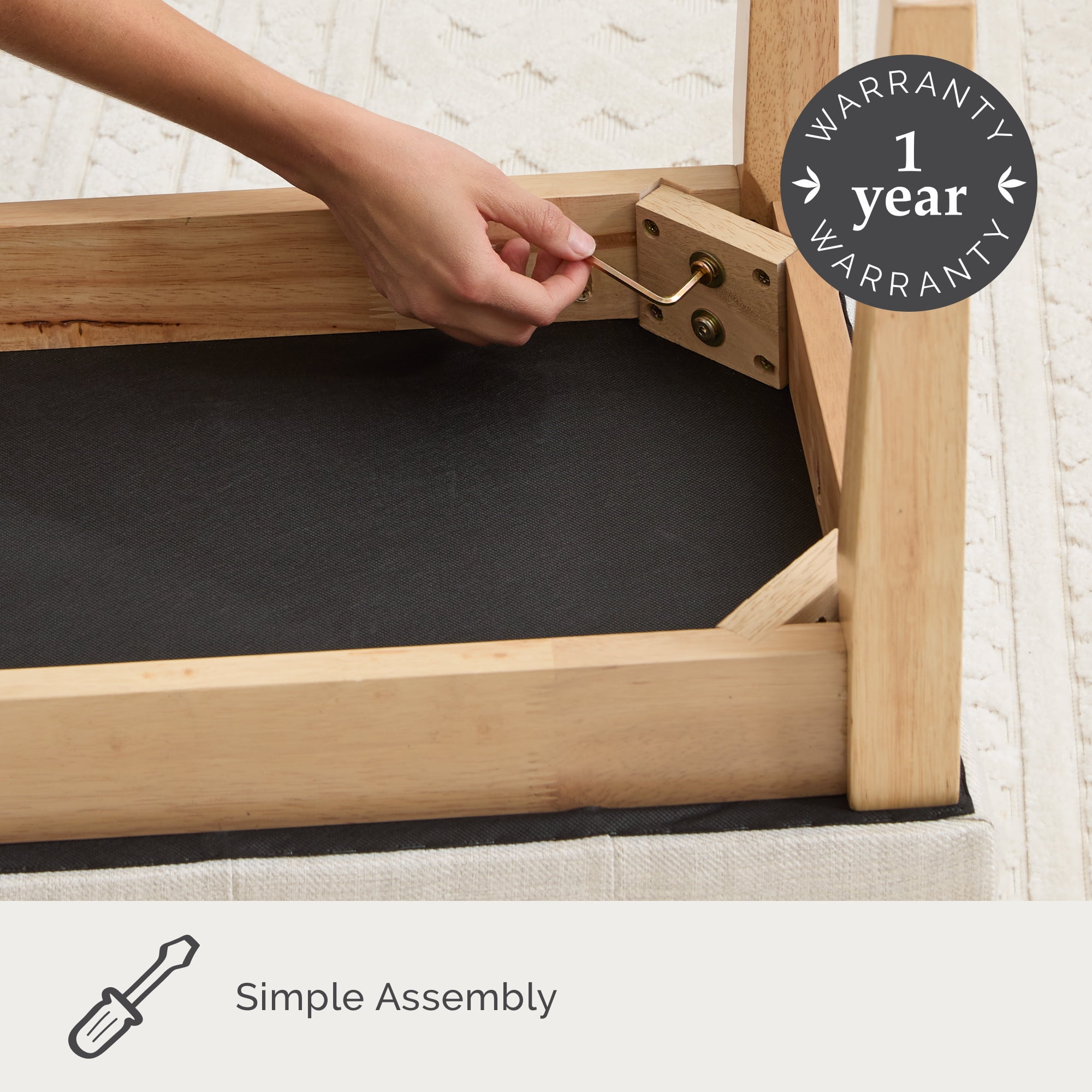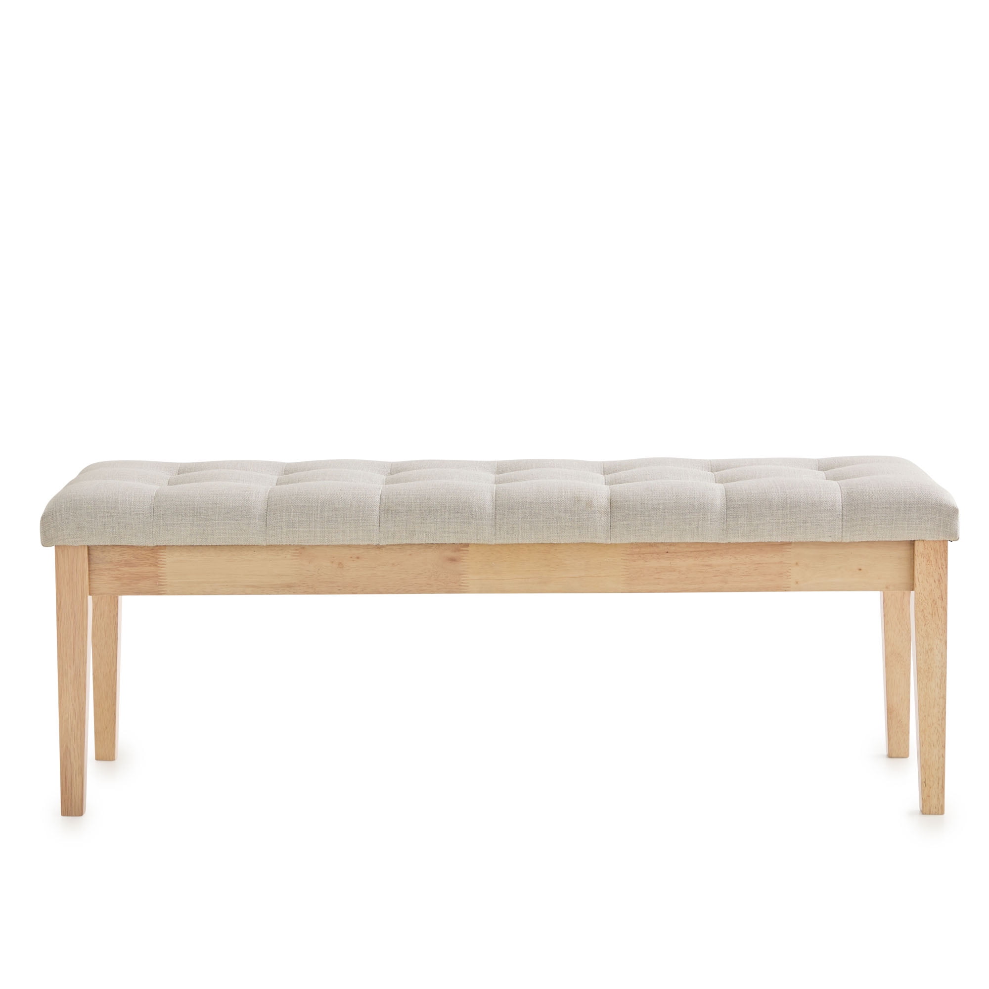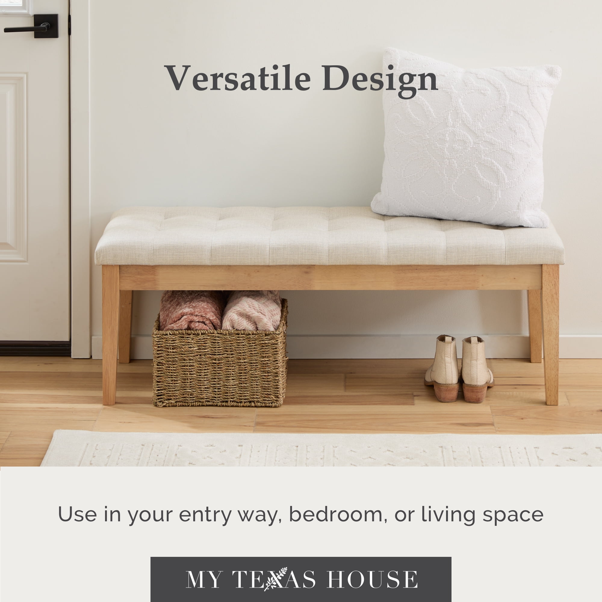 My Texas House Melissa Upholstered Bench, Oat: THOUGHTFUL DETAILS: Square tufted top and natural oak legs finish off this timeless bench DESIGN OPTIONS: Use as an entryway bench, dining room bench, or bedroom bench COLOR OPTIONS: Upholstered in Oat or Light Gray fabric to match various design styles PRODUCT DIMENSIONS: Bench seat measures 49 (L) x 17.5 (W) x 18 (H) inches QUALITY MATERIALS: Made of a linen-inspired fabric finish with durable, solid oak legs PACKAGE DIMENSIONS: Arrives in one box measuring 50.5 (L) x 19 (W) x 6.5 (H) inches SIMPLE ASSEMBLY: All hardware is included for simple assembly, just grab a screwdriver WARRANTY GUARANTEE: Complimentary one-year warranty