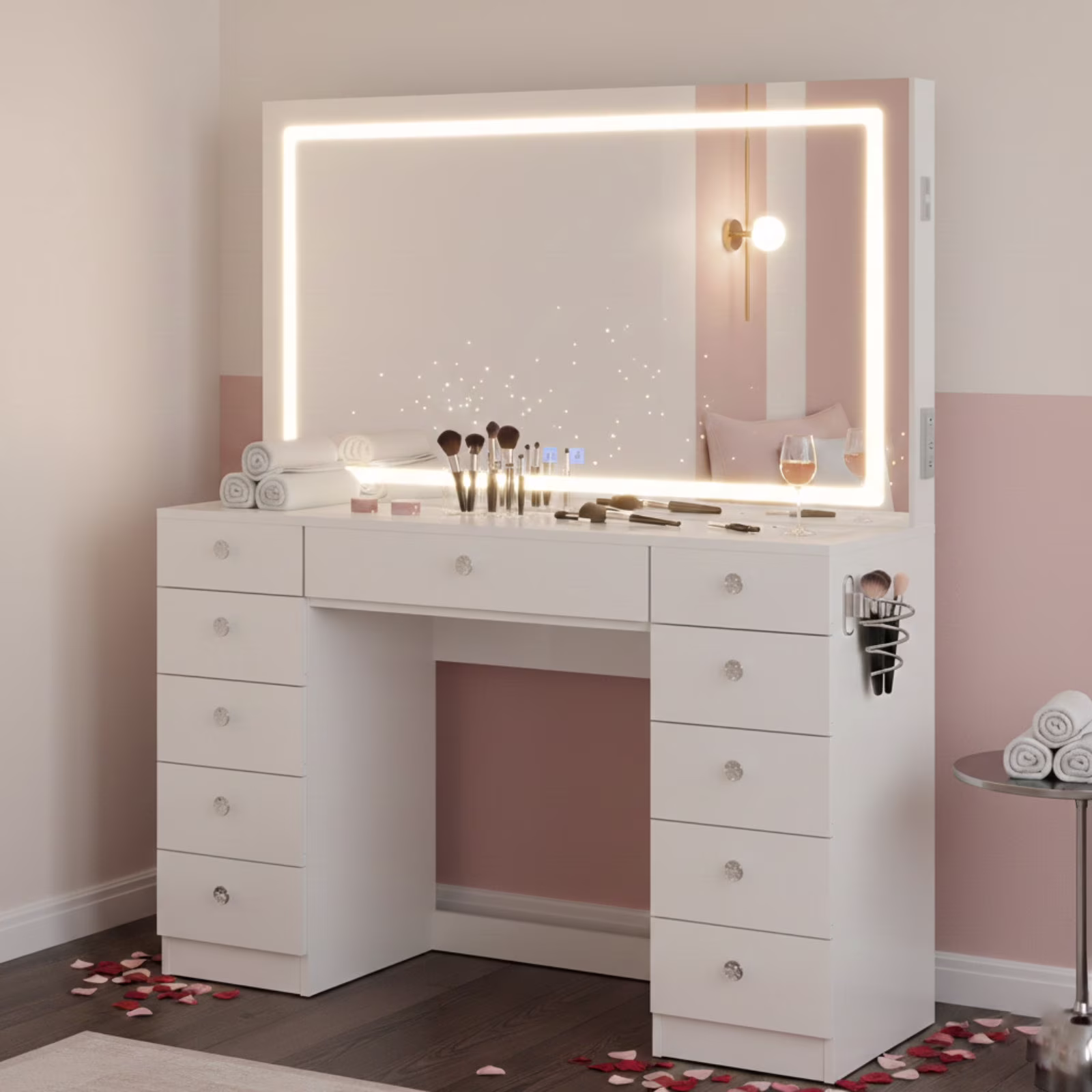 Introducing My Texas House Monroe collection, a blend of elegance and functionality inspired by Erin Vogelpohl’s signature style. This rustic bedroom chest combines Erin’s love for chic, budget-friendly decor with practical features designed for everyday living. Crafted with the natural wood tones of Brushed Oak® finish, this 5-drawer chest features five spacious drawers equipped with metal runners and safety stops, ensuring smooth operation and longevity. The lower three drawers of this transitional-style chest of drawers are extra deep, providing ample storage space for larger items. This rustic dresser comes with pre-assembled moldings on the end panels and pre-attached drawer slides on uprights and drawer parts to make the assembly process streamlined and hassle-free. An interlocking safety mechanism allows only one drawer to open at a time, enhancing safety and stability. Additionally, this farmhouse-style dresser includes a tip restraint safety strap, adding an extra layer of security. Bring home this collection of farmhouse-inspired bedroom furniture that embodies the essence of affordable and stylish home décor.