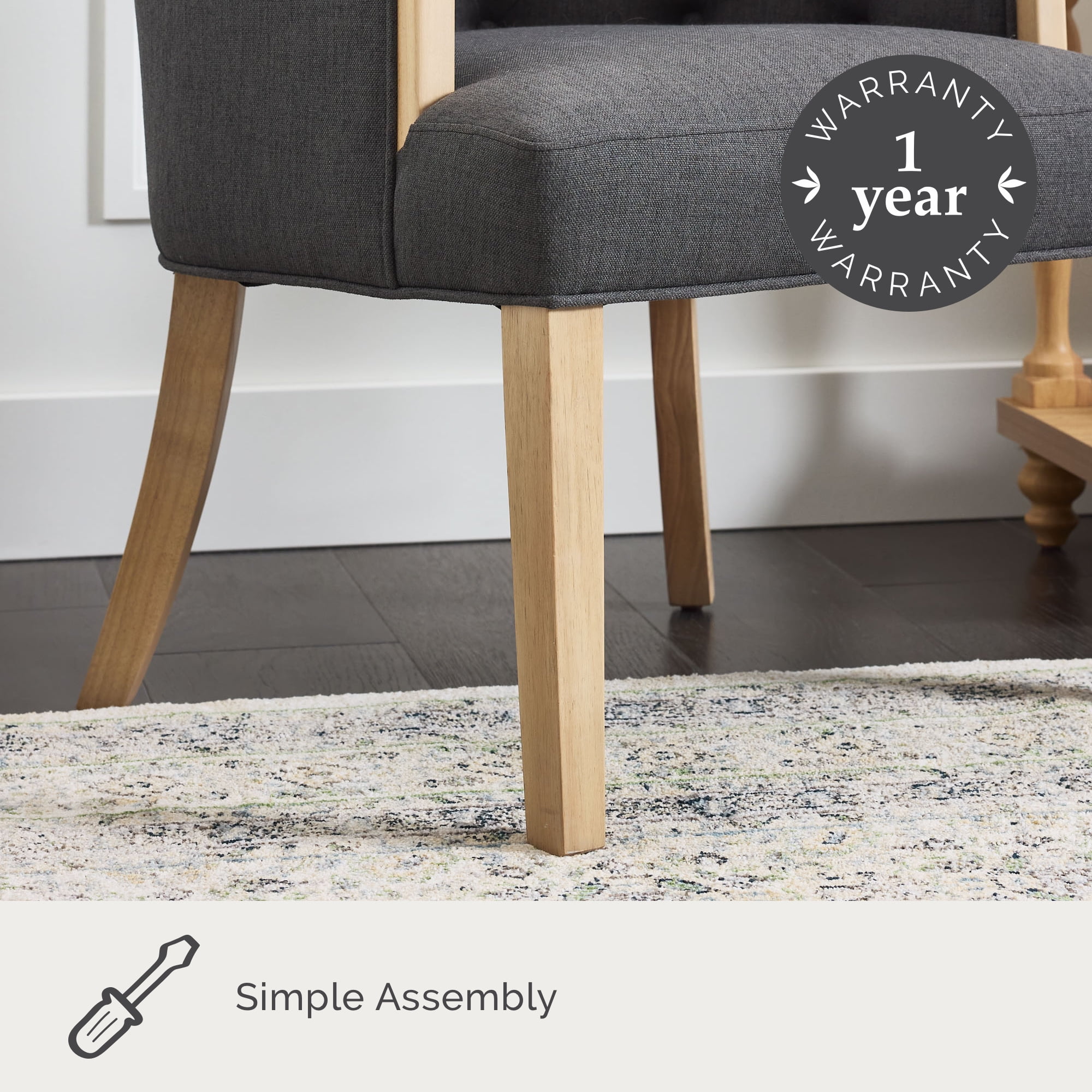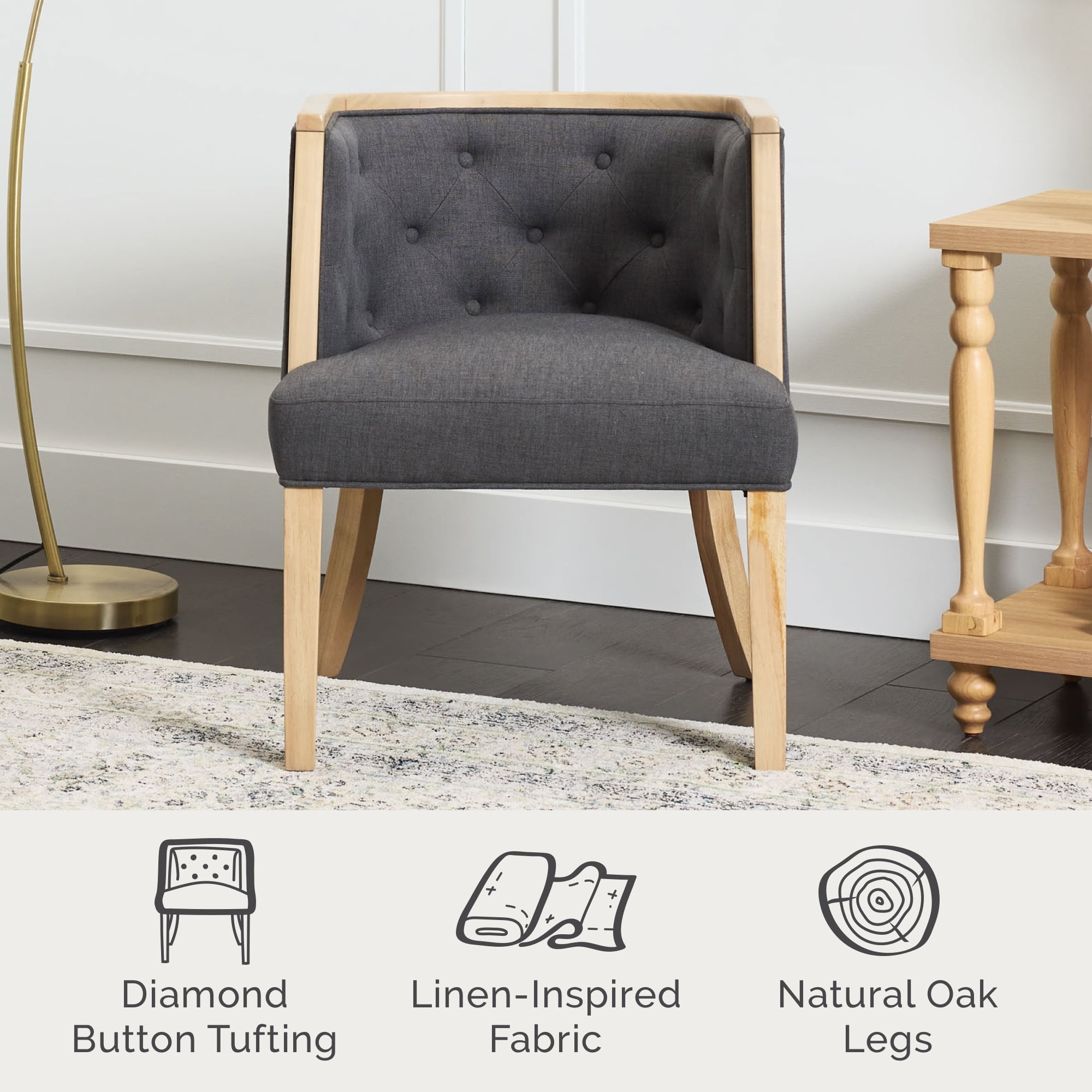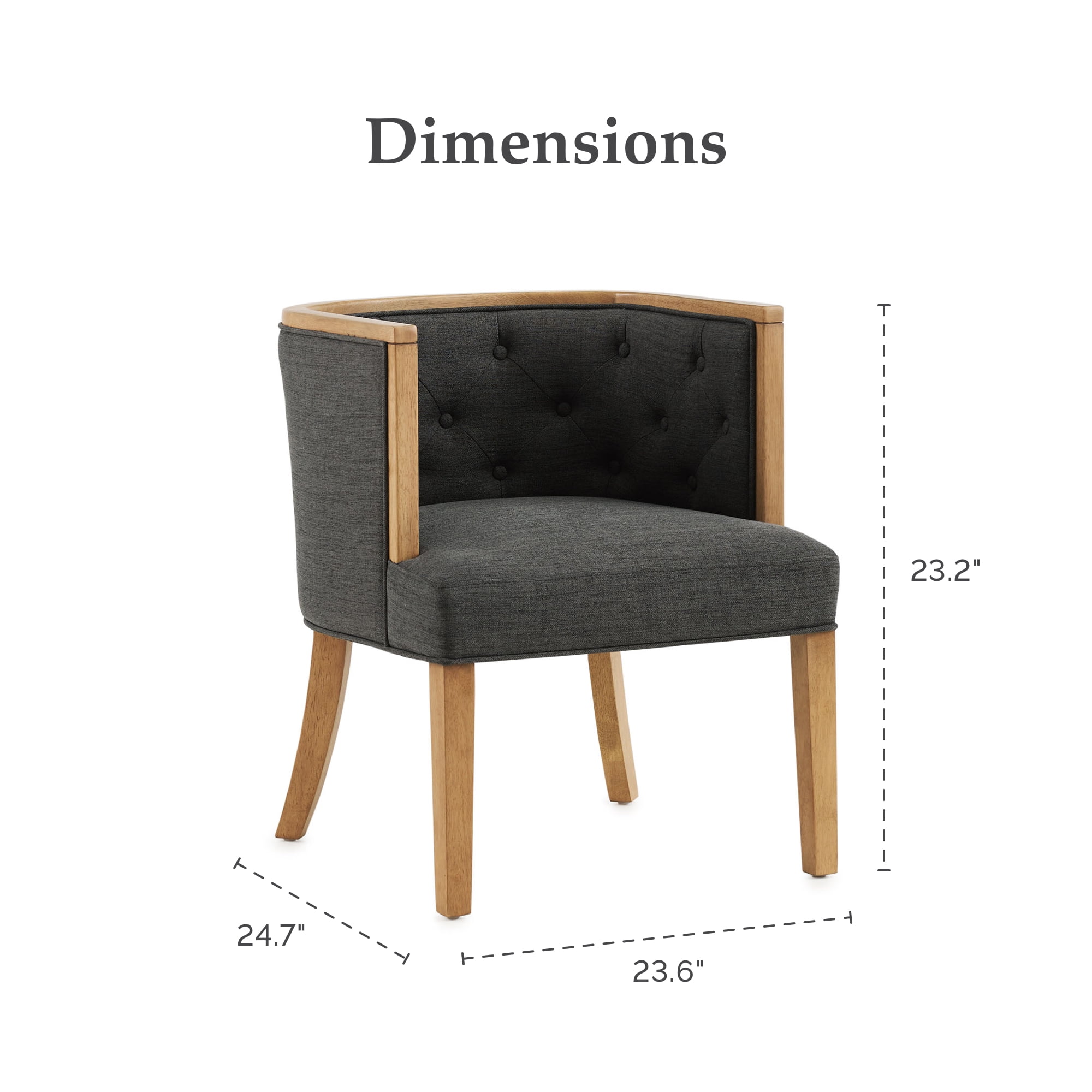 THOUGHTFUL DETAILS: Diamond button tufting and a curved back come together in a seamless design STYLING OPTIONS: Use as a living room chair, a bedroom chair, or place in your favorite nook RELIABLE MATERIALS: The oak construction and linen-inspired fabric make this a quality chair COLOR OPTIONS: Chair is available in Oat or Charcoal to match your design style PRODUCT DIMENSIONS: Armchair measures 23.6 (L) x 24.7 (W) x 23.2 (H) inches PACKAGE DIMENSIONS: Arrives in one box measuring 26.8 (L) x 26 (W) x 18.9 (H) inches SIMPLE ASSEMBLY: All hardware is included for simple assembly, just grab a screwdriver