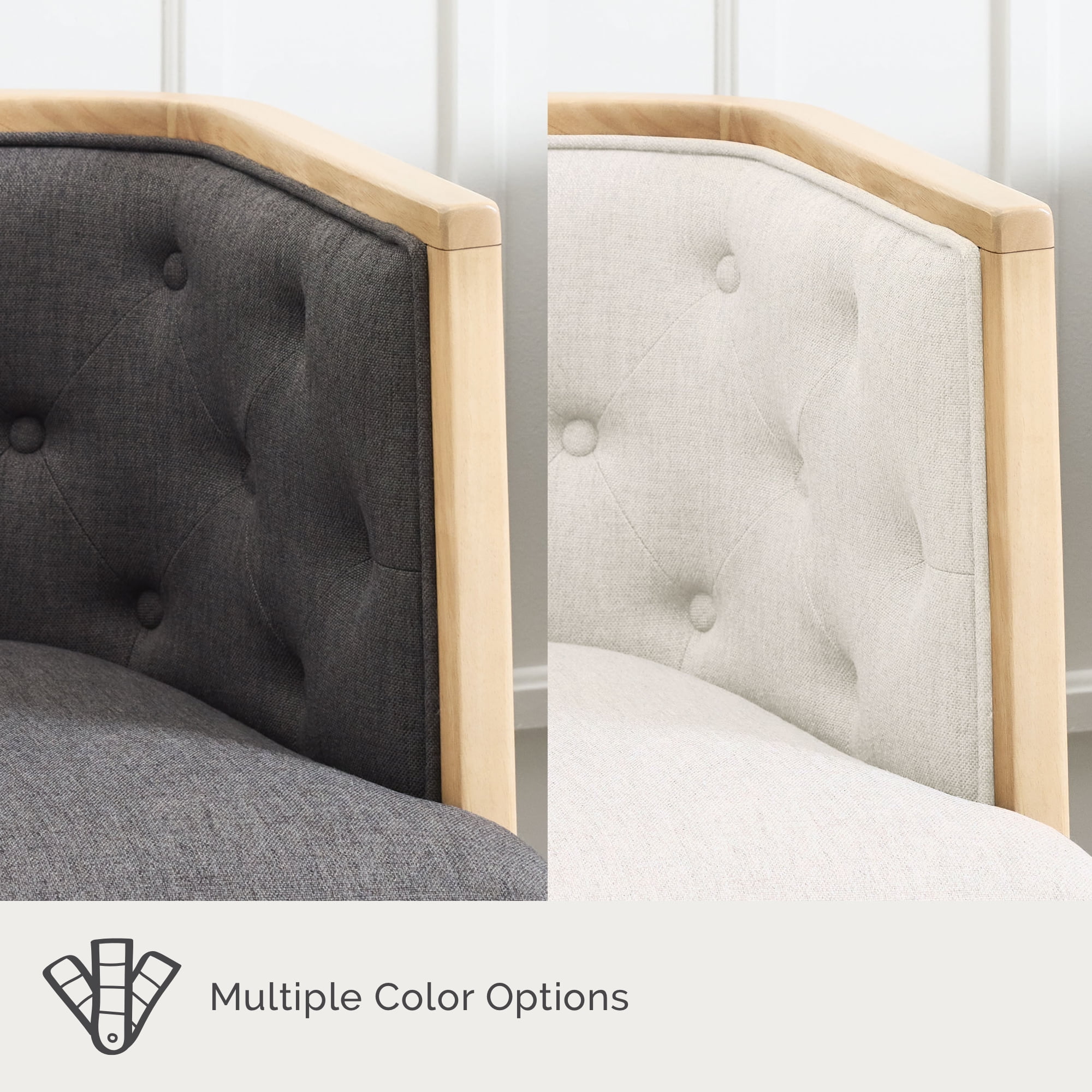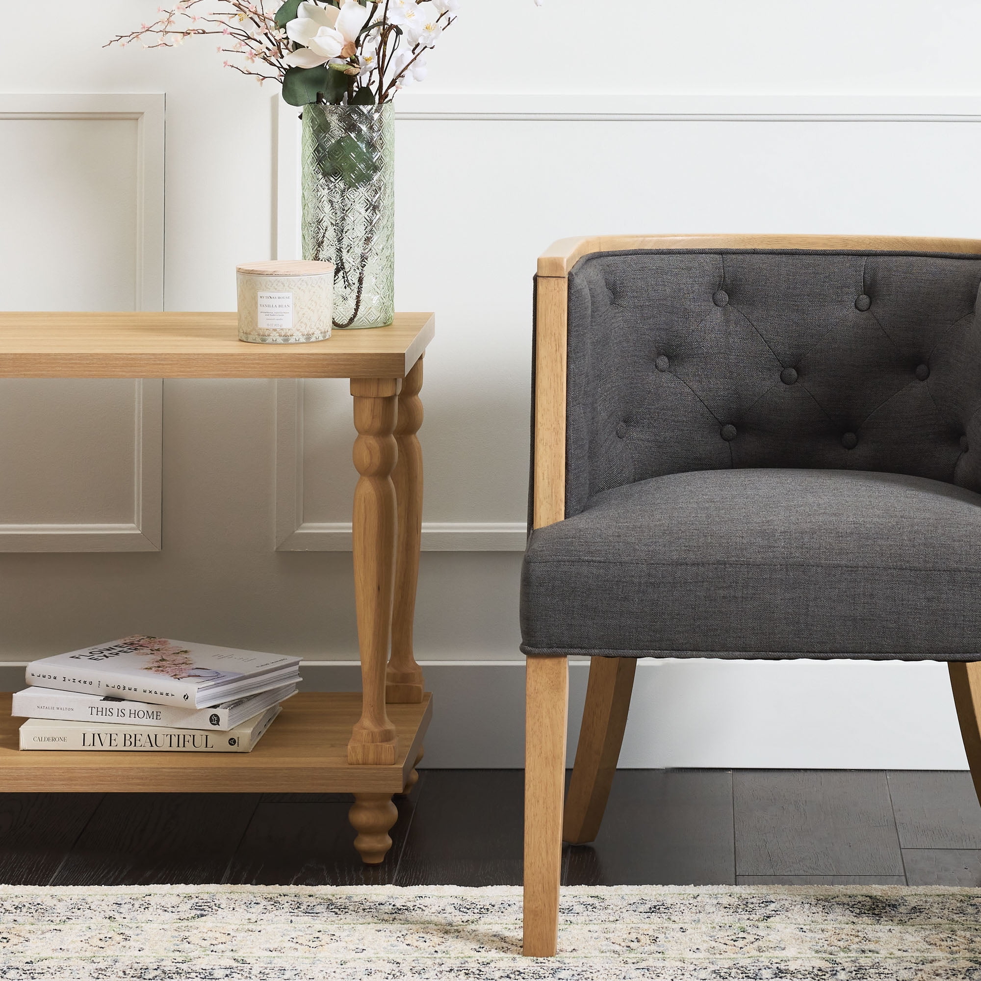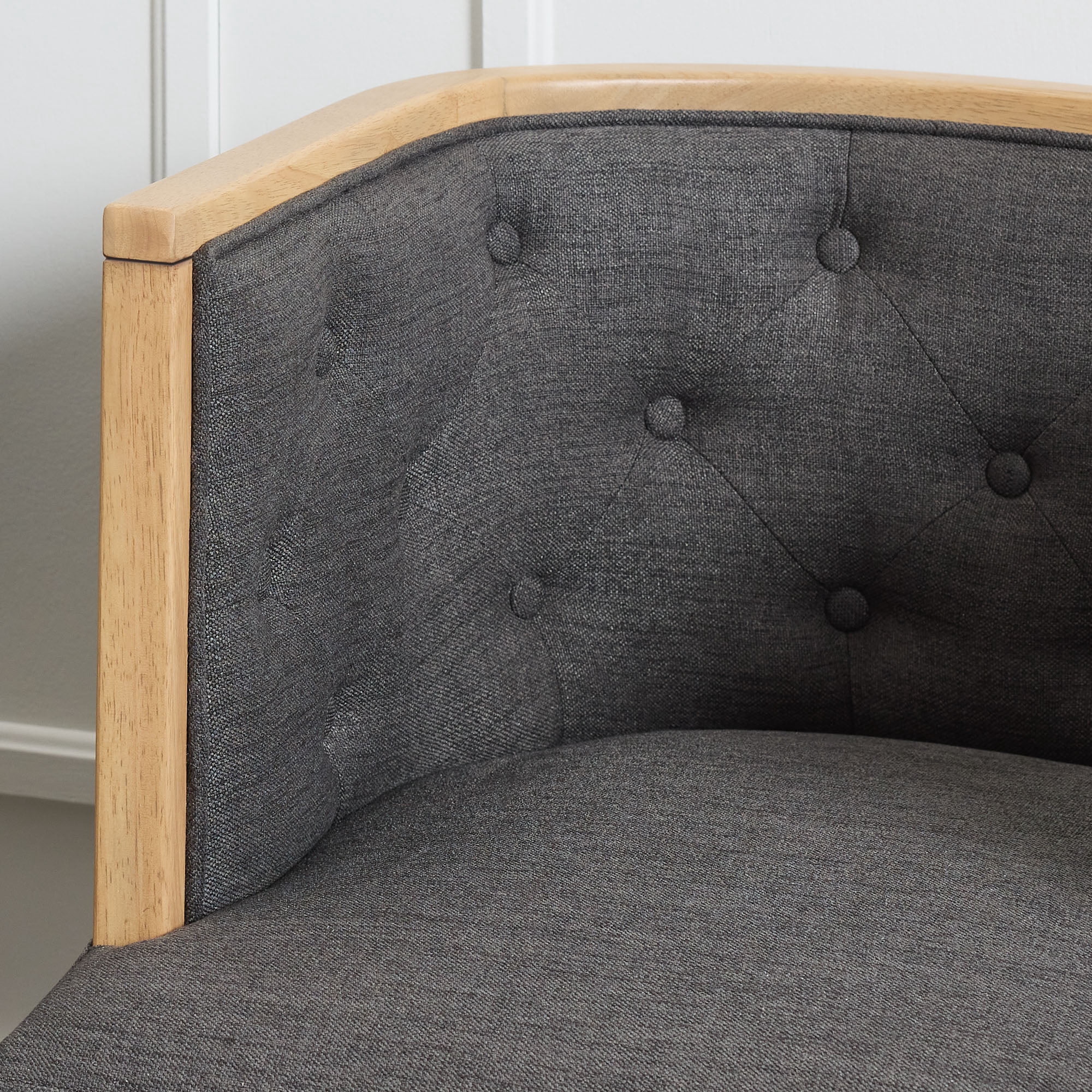 THOUGHTFUL DETAILS: Diamond button tufting and a curved back come together in a seamless design STYLING OPTIONS: Use as a living room chair, a bedroom chair, or place in your favorite nook RELIABLE MATERIALS: The oak construction and linen-inspired fabric make this a quality chair COLOR OPTIONS: Chair is available in Oat or Charcoal to match your design style PRODUCT DIMENSIONS: Armchair measures 23.6 (L) x 24.7 (W) x 23.2 (H) inches PACKAGE DIMENSIONS: Arrives in one box measuring 26.8 (L) x 26 (W) x 18.9 (H) inches SIMPLE ASSEMBLY: All hardware is included for simple assembly, just grab a screwdriver