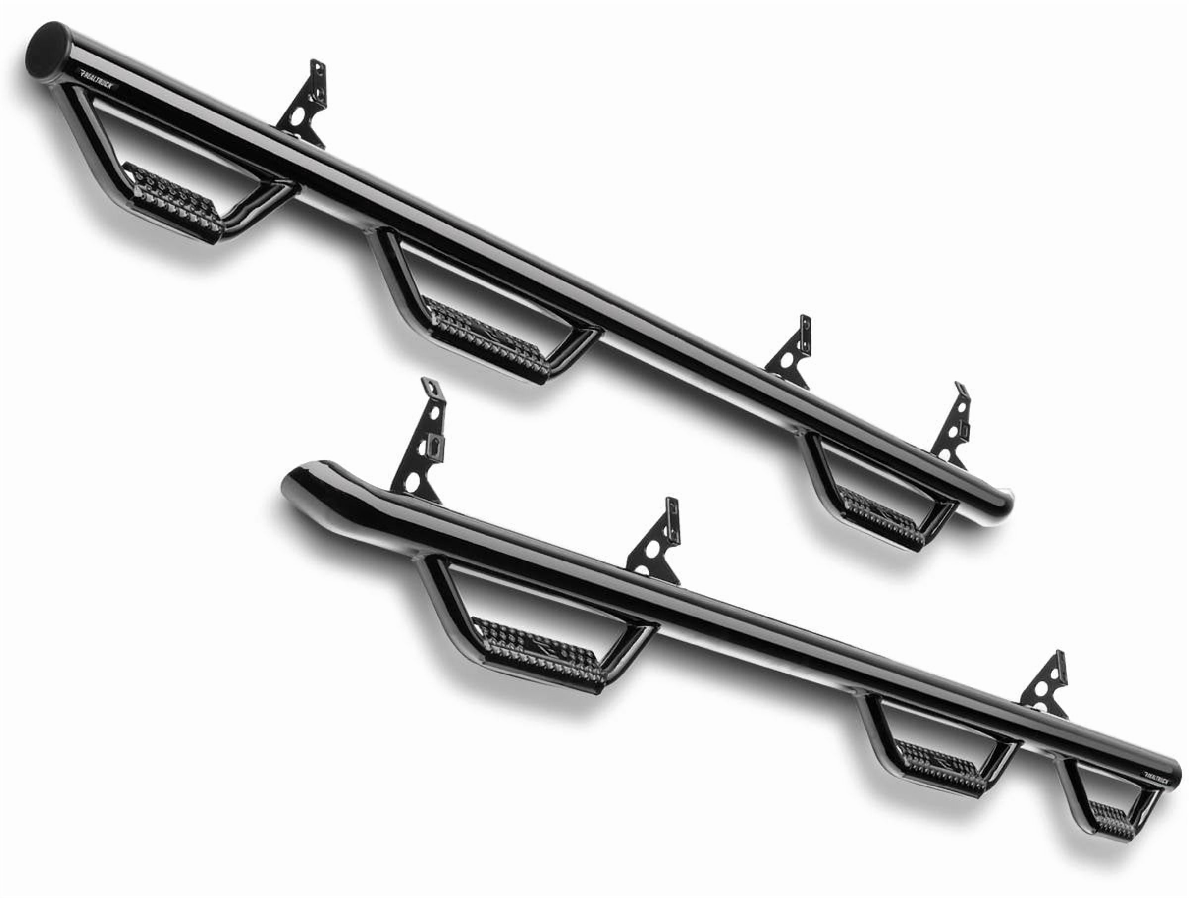 Heavy-duty carbon steel construction Patented drop-step design 3-in. diameter main tube Tubular drop steps with 3-in. wide perforated tread Simple no-drill installation Includes all required hardware and instructions Sold in pairs