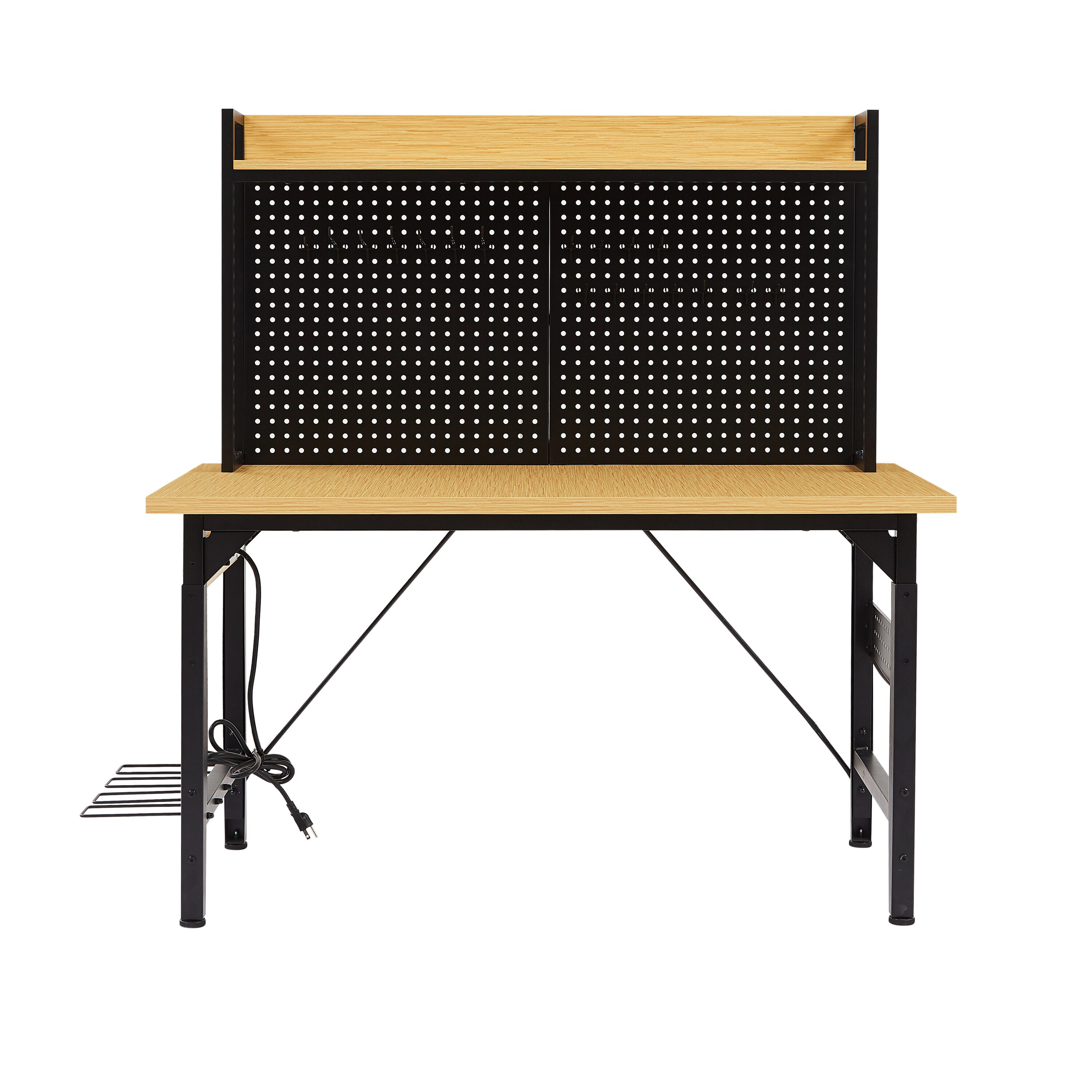 This heavy-duty adjustable workbench is designed for serious performance and everyday convenience. With a 2000 lbs weight capacity, built-in power outlets, and ample storage including a pegboard and hooks, it keeps your tools organized and your workspace efficient. Whether in your garage, workshop, or home office, this mobile and ergonomic workstation adapts to your needs with height adjustability and effortless mobility.