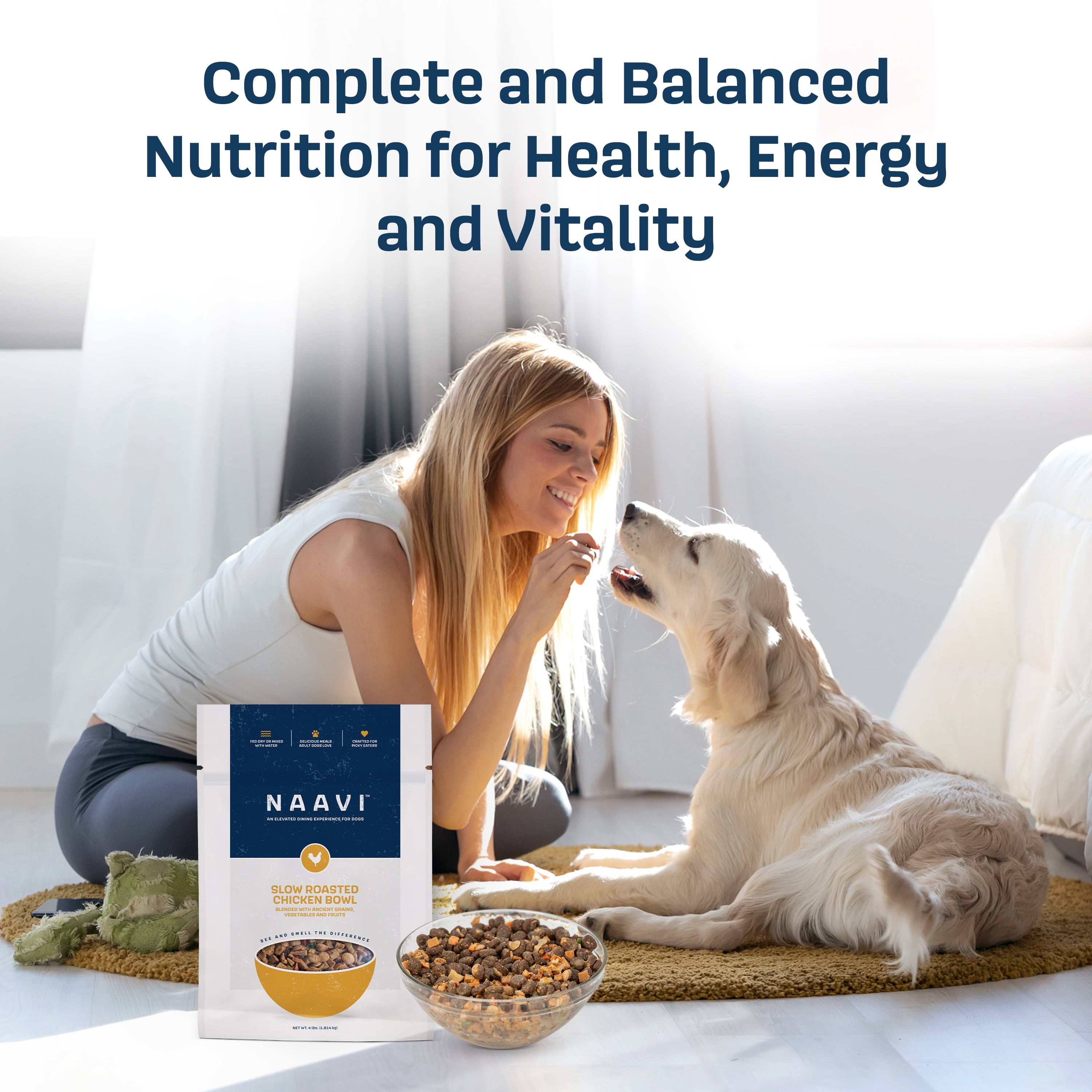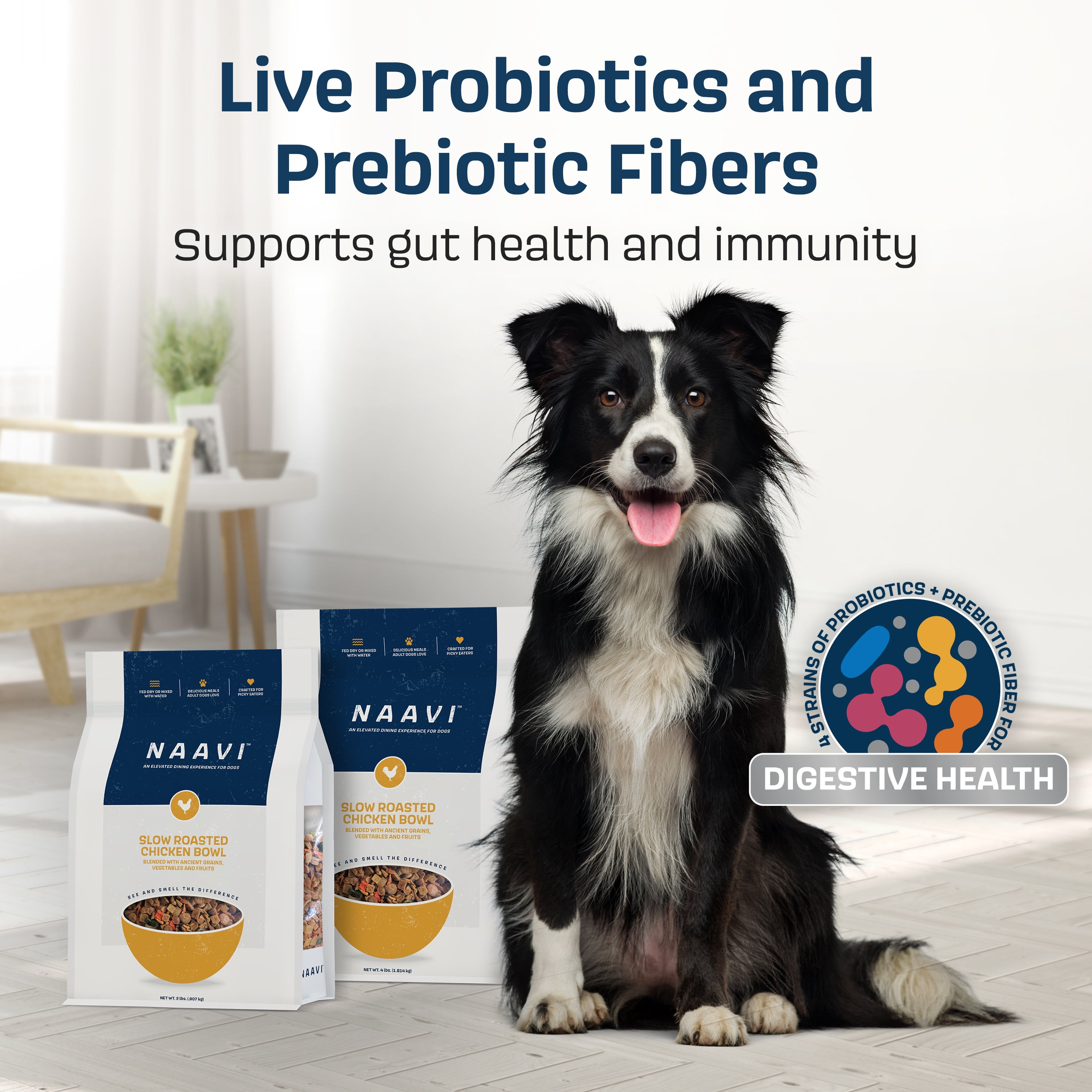 Naavi is a nutritionally balanced dog food that satisfies the pickiest eaters, and you can serve it wet or dry as a complete meal, a flavorful topper, or a standalone treat… the slow-smoked aroma and variety of textures make it unlike any other pet food Naavi’s tender proteins are slow-smoked to lock in flavor and nutrition, and free from bone meal, byproducts, or artificial flavors to deliver wholesome, quality protein in every scoop Made with live probiotics and prebiotic fibers to support your dog’s gut health and immunity with every bite Nutritious, gently air-dried fruits and vegetables provide essential vitamins and minerals to support overall wellness, including skin, coat, and immune health Formulated by a board-certified nutritionist to provide complete and balanced nutrition for your dog’s health, energy, and vitality