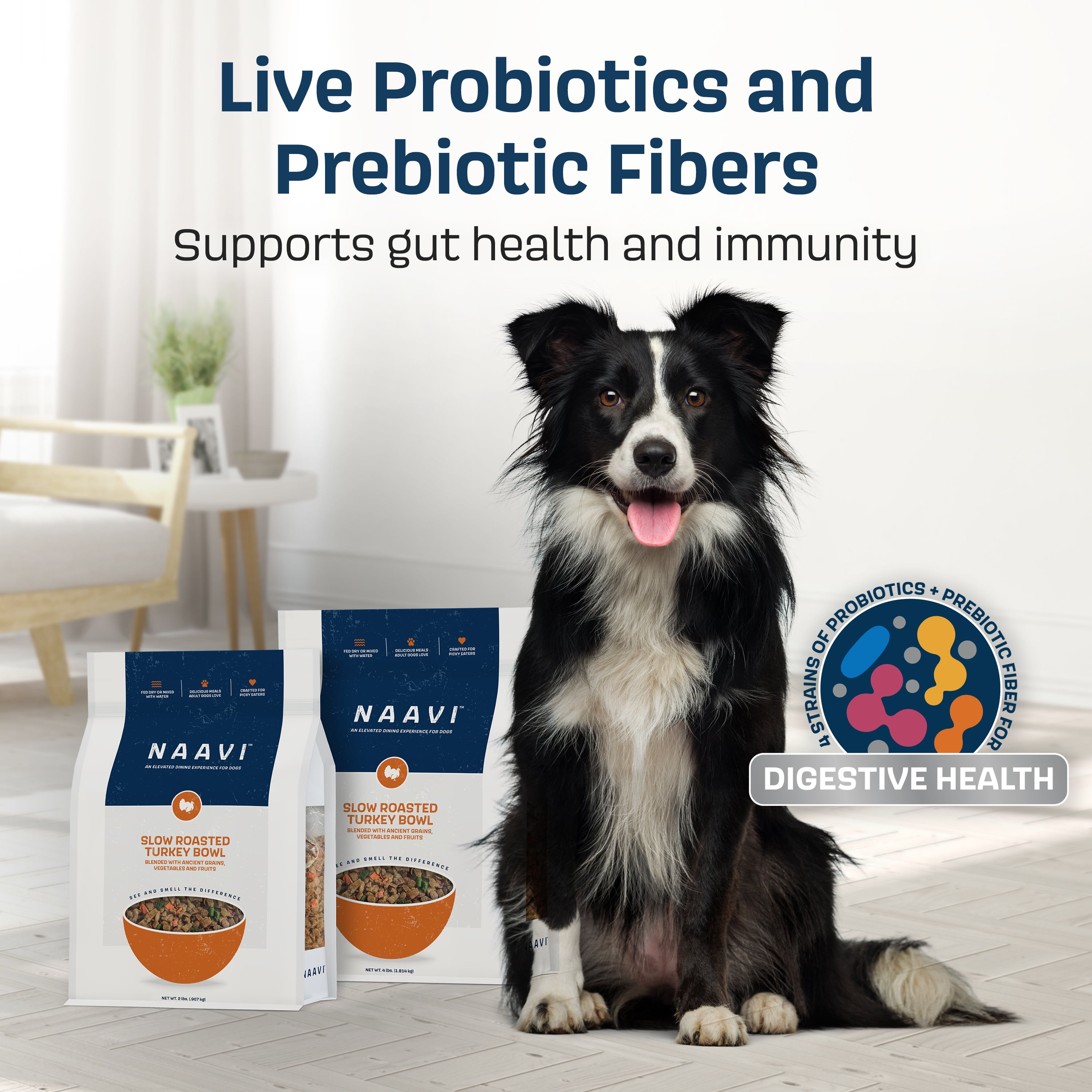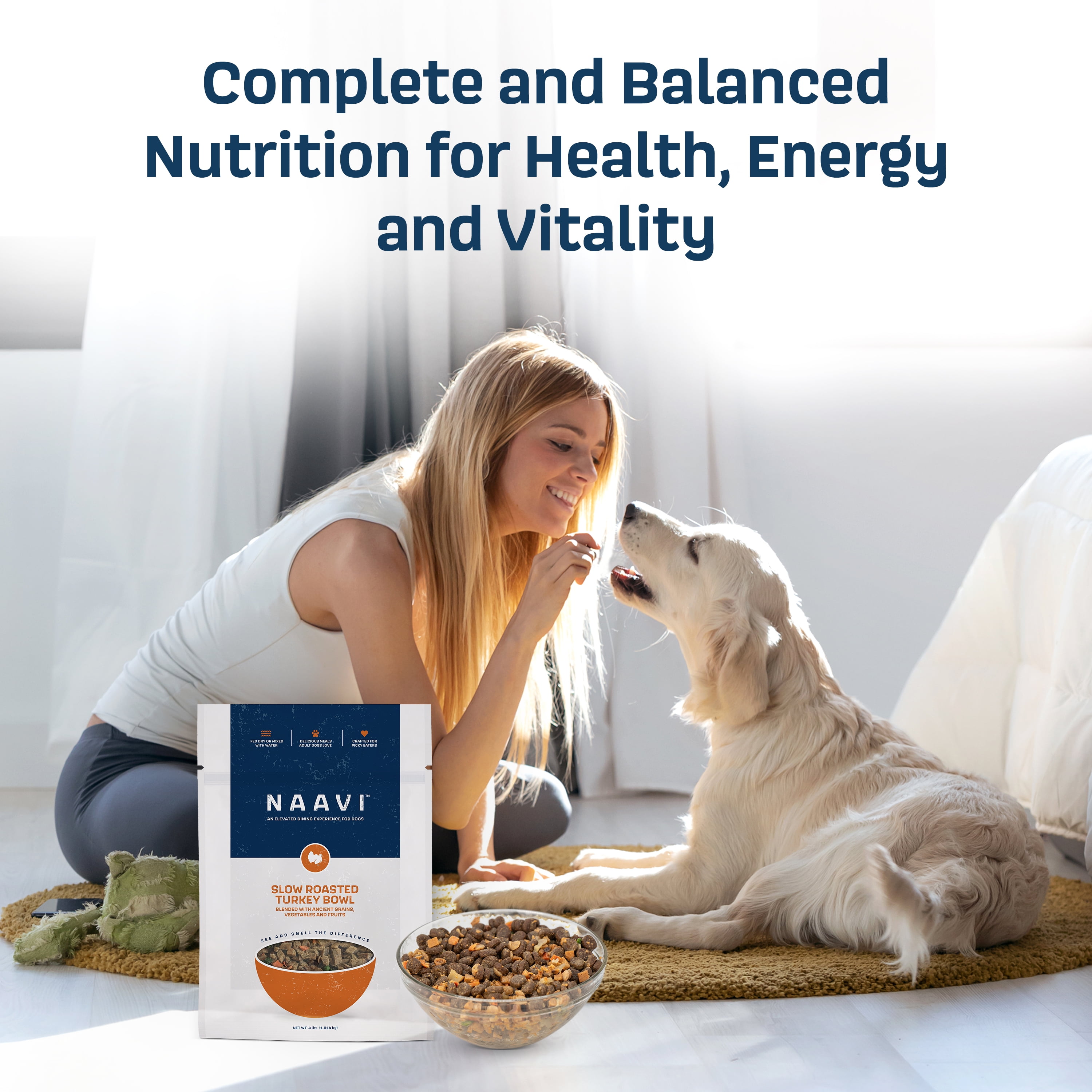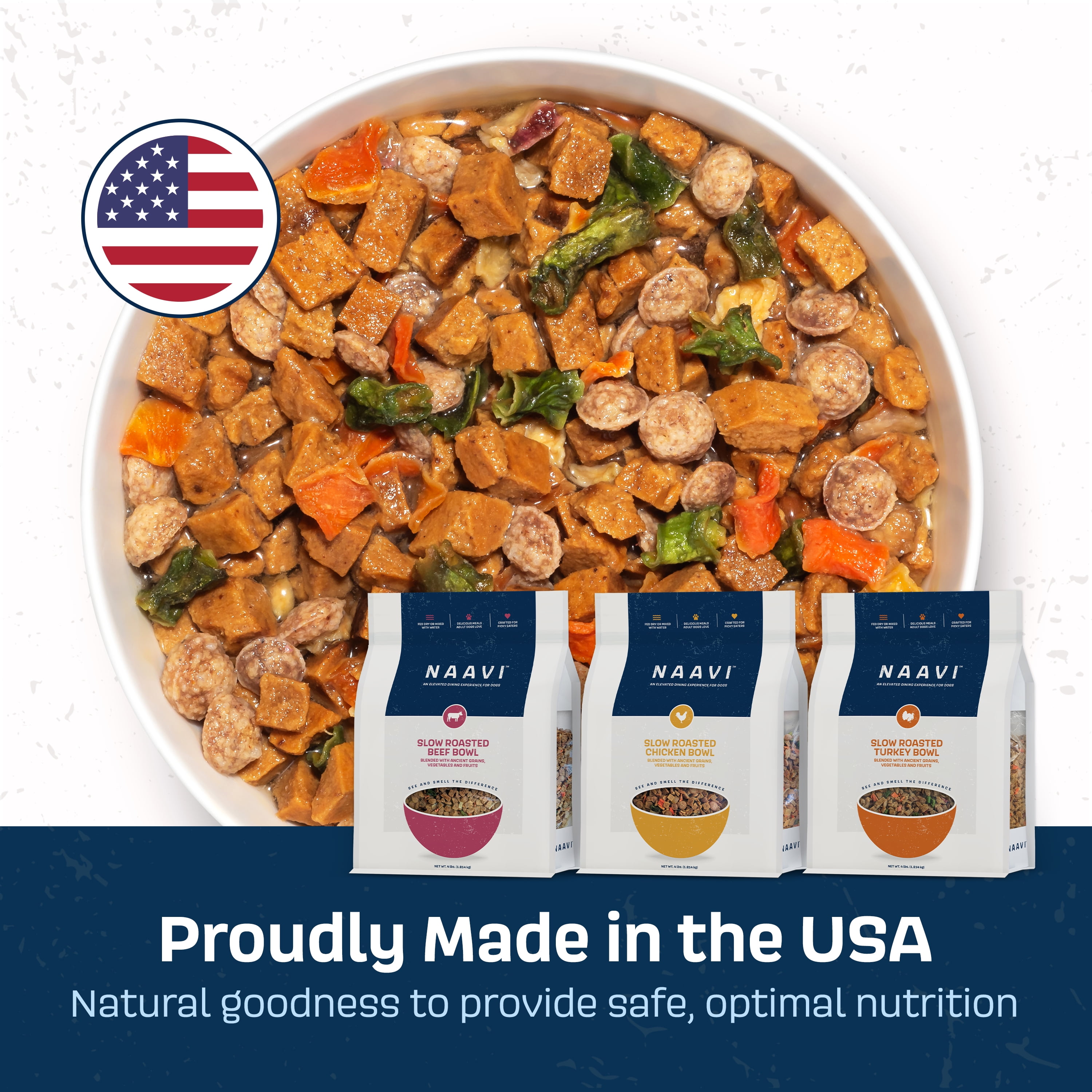 Naavi is a nutritionally balanced dog food that satisfies the pickiest eaters, and you can serve it wet or dry as a complete meal, a flavorful topper, or a standalone treat… the slow-smoked aroma and variety of textures make it unlike any other pet food Naavi’s tender proteins are slow-smoked to lock in flavor and nutrition, and free from bone meal, byproducts, or artificial flavors to deliver wholesome, quality protein in every scoop Made with live probiotics and prebiotic fibers to support your dog’s gut health and immunity with every bite Nutritious, gently air-dried fruits and vegetables provide essential vitamins and minerals to support overall wellness, including skin, coat, and immune health Formulated by a board-certified nutritionist to provide complete and balanced nutrition for your dog’s health, energy, and vitality