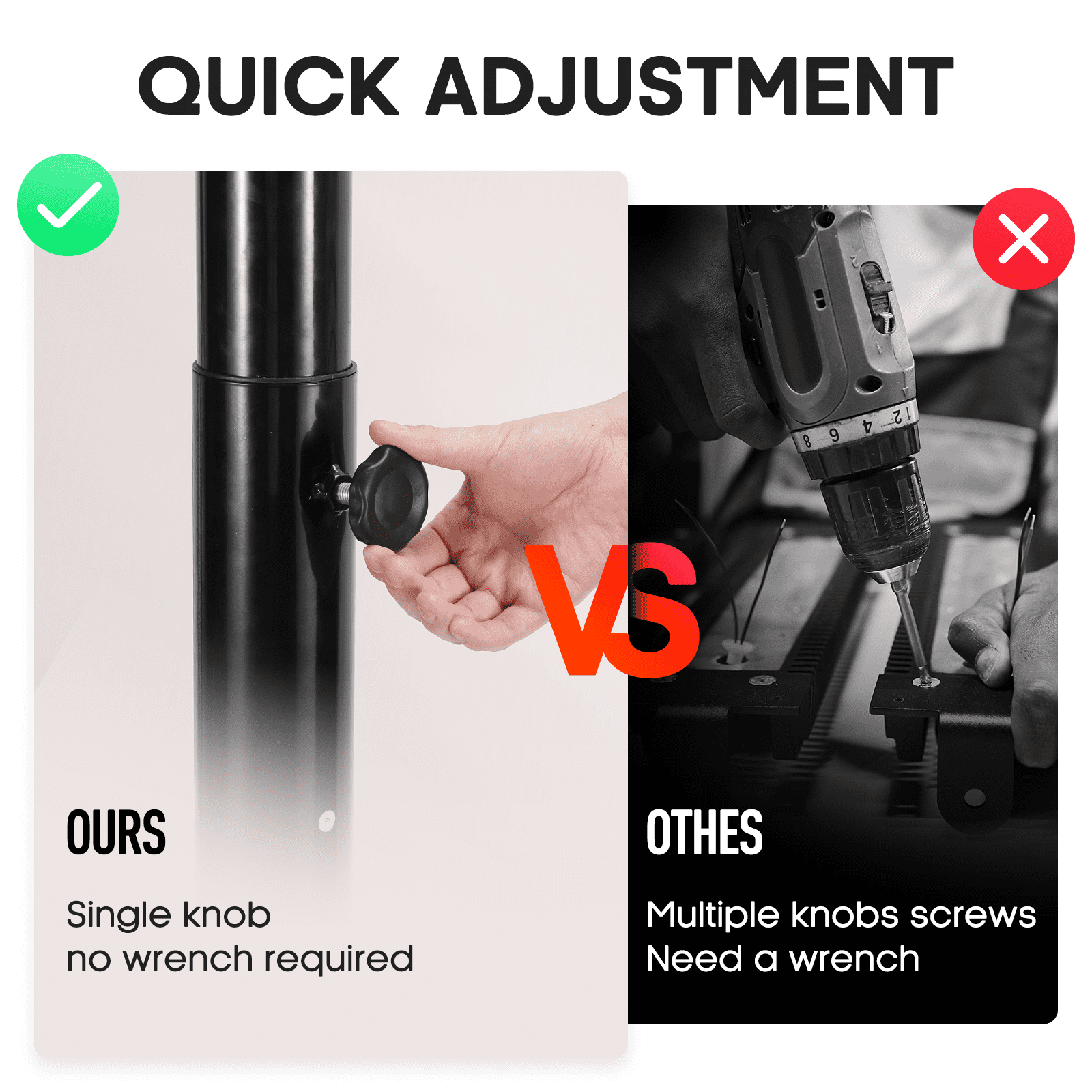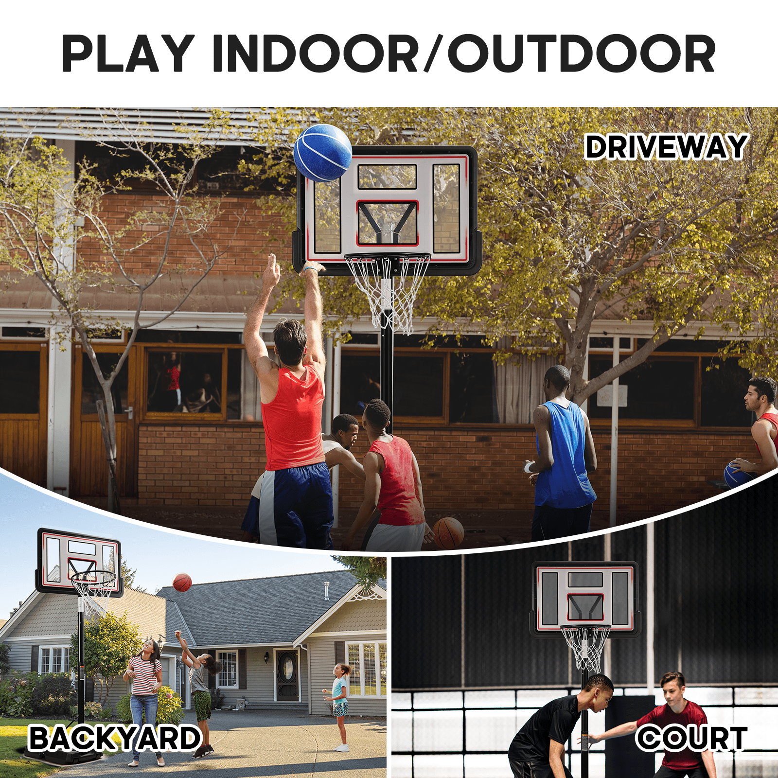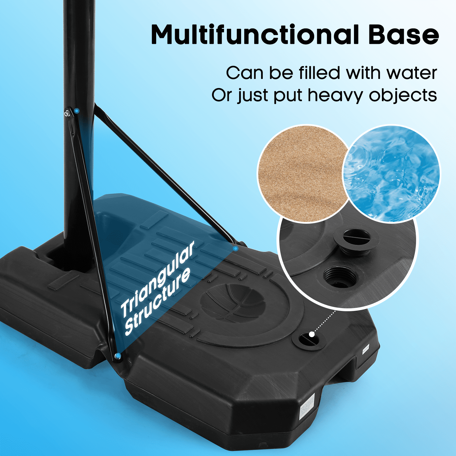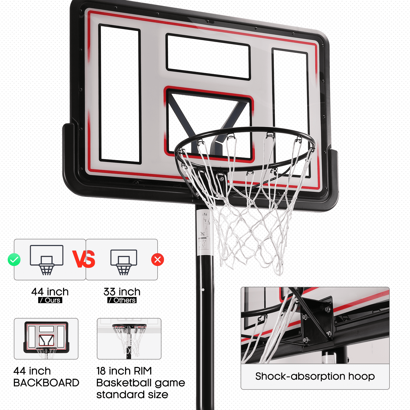 Built-in Wheels The basketball hoop comes with its own wheels, making basketball hoop easy to carry and move around, so you can find the perfect spot to play basketball goal in the park, backyard, or on the court. It is also convenient for you to move the basketball hoop to a safer location if there is bad weather. Adjustable Height Design high height basketball hoopThe adjustable height basketball hoop height can be flexibly adjusted between 6.56 ft and 10 ft. Easily adjust the height to suit individual height and skill level, this basketball hoop is suitable for users of all ages and abilities. Whether you’re tall, short, a beginner or a pro, you’ll be able to find the perfect shooting height on our basketball goal to ensure the best playing experience. Wide Basketball HoopWith a 44-inch wide basketball backboard and basket, this basketball hoop reduces the difficulty of shooting, whether it is a beginner practicing basic moves or a professional player training skills, the basketball hoop can significantly improve the hitting rate and reduce the mistakes caused by the small basketball basket. Reinforced Frame ConstructionOur basketball hoop are made with multiple screws and thickened pipes to enhance the sturdiness of the basketball hoop, and the main pole is treated with smooth plastic spraying, which prevents rust and oxidation, and is fearless of the wind, rain and sun. Distinguish from cheap products and eliminate paint flaking and fading. Whether indoors or outdoors, you can enjoy the fun of the basketball goal with your friends! Easy to InstallThis basketball hoop has a lot of accessories, but we come with clear illustrated instructions and an assembly video that makes the basketball hoop easy to assemble. If there is any problem, you can contact us at any time.