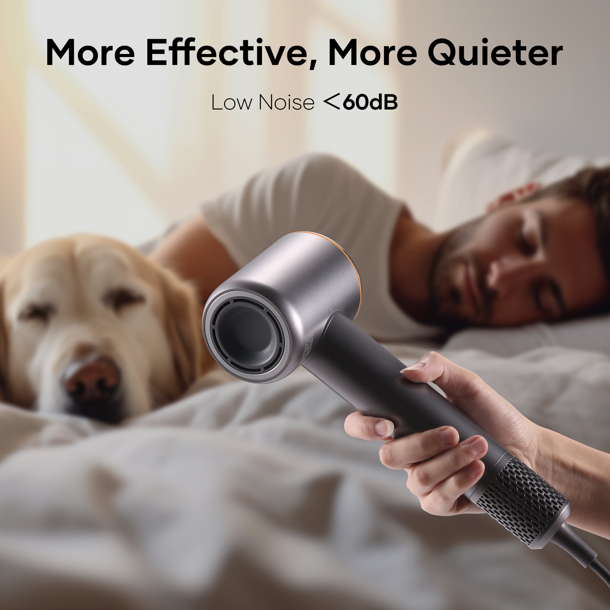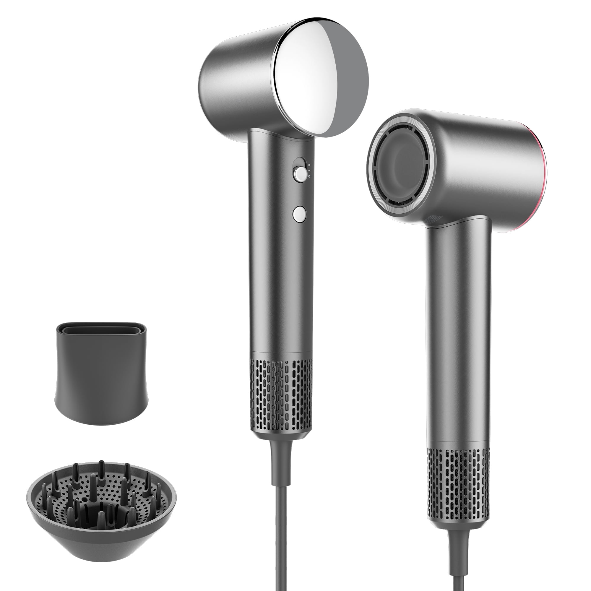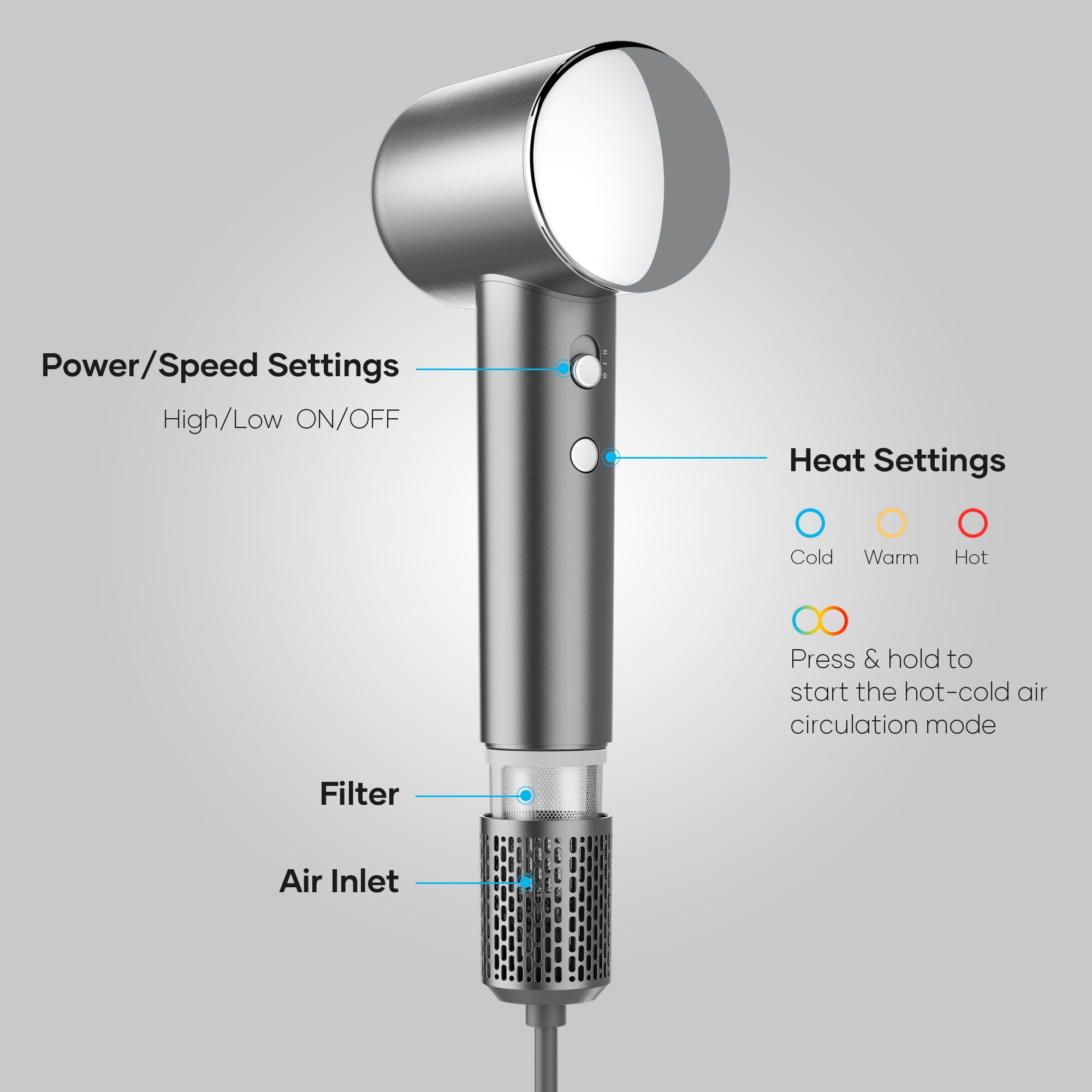 Powerful, Efficient Drying: Equipped with a state-of-the-art brushless motor spinning at an impressive 110,000 RPM, our hair dryer delivers a robust airflow with a wind speed of 22m/s. The high speed blow dries your hair in a fraction of the time, cutting drying time to just 3-5 minutes. Say goodbye to long, tedious hair drying sessions. Intelligent Temperature Regulation: With over 100 temperature checks per second, our hair dryer intelligently adjusts the heat to prevent damage from excessive heat. The alternating hot and cold airstream feature ensures your hair is not only dried efficiently but also protected. Advanced Negative Ionic Technology: Our dryer releases a generous 200 million negative ions during the drying process. These ions neutralize static electricity, leaving your hair smooth and frizz-free. They also lock in moisture, nourish your hair, and add a soft, fluffy texture, resulting in a naturally radiant and healthy look. 3-Color LED Ring Light & Low Noise Operation: The LED ring on our hair dryer indicates the current temperature setting with different colors: red for hot, yellow for warm, and blue for cold. Activate the circulating mode by pressing and holding for 1 second to alternate between hot and cold air every few seconds. The hair dryer operates at a quiet 70dB, ensuring a peaceful environment for you and your family. Safe and Portable Design: Weighing a mere 1.6 lb (740g), our hair dryer is compact and easy to carry, making it perfect for both home and travel. The ergonomic design, user-friendly buttons, and a 360° rotating magnetic nozzle with a fine filter ensure a comfortable and safe experience. The filter is designed to prevent hair from being sucked in, and the hair dryer is safe for use by children and pregnant women.