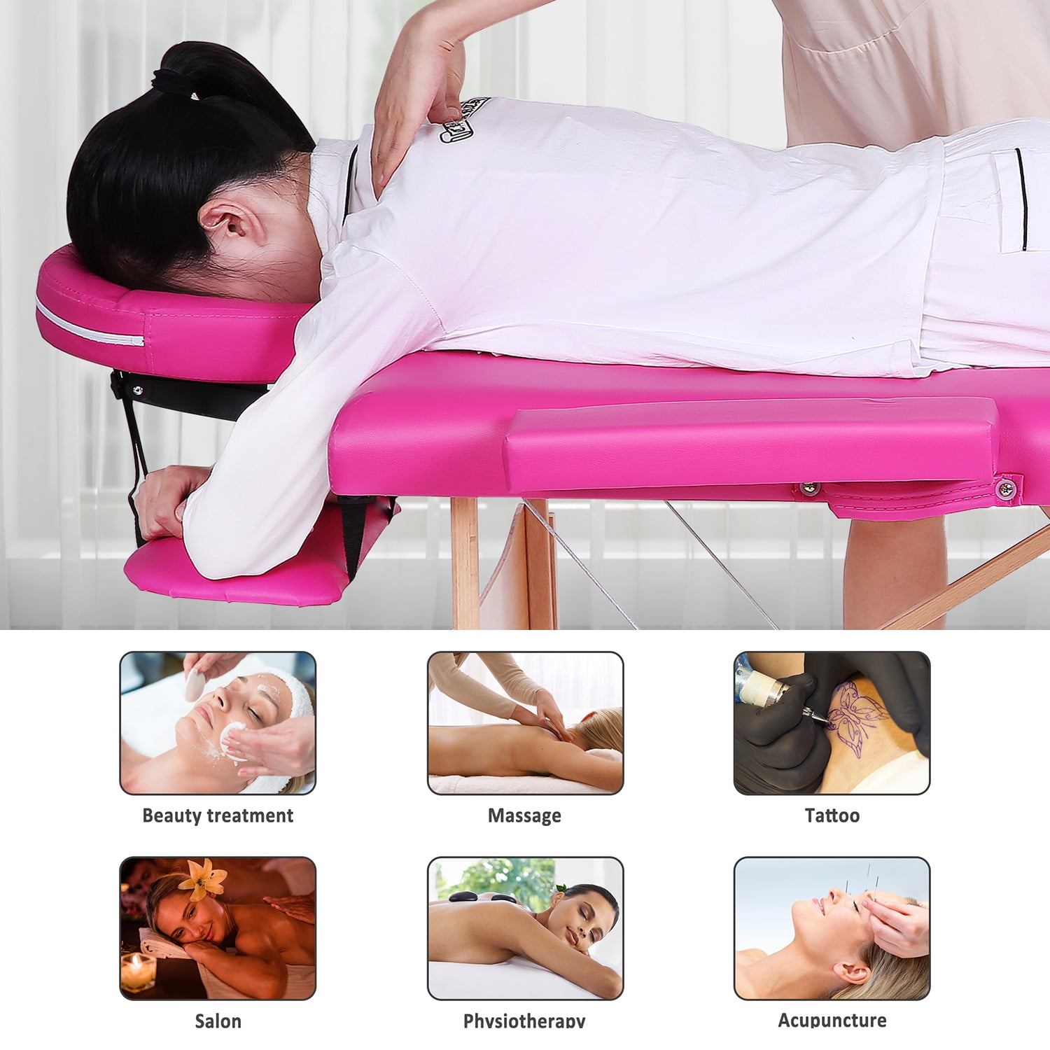 ????????♀️【Sturdy Frame & Spongy Cushion】The massage table is made of high-quality beech, reinforced hardwood corner blocks for superior strength to bear up to 496lbs on the lash bed. And the massage table portable has a 2-inch-thick sponge, give you a soft and comfortable experience. ????????♀️【Portable & Foldable & Light Weight】With foldable design and security lock, the massage table can be unfolded easily within 30 seconds, no tools needed. The portable massage table can be folded up to a carrying case, convenient for you to take to office, home, or any place you want. It can save space when not in use. ????????♀️【Height Adjustment of Lash Bed】The massage table has 9 levels of adjustable heights, ranging from 24 inches to 35 inches with easy adjustment. The massage bed with 9 levels adjustable heights are suitable for therapists of different heights, who provide customers with excellent service. ????????♀️【Easy to Clean & Health Friendly Materials】 The surface of the massage table is covered with water-proof and oil-proof leather, which is extremely soft, elastic and easy to clean. And it has no offensive smell like other synthetic materials, which is absolutely health-friendly. ????????♀️【Full Accessories Included】 This massage table includes adjustable headrest, 2 armrests, humanized hand pallet and a nylon carry case. And the headrest of this SPA bed can be adjusted up and down. The hand pallet ensures more comfortable arm and head position.