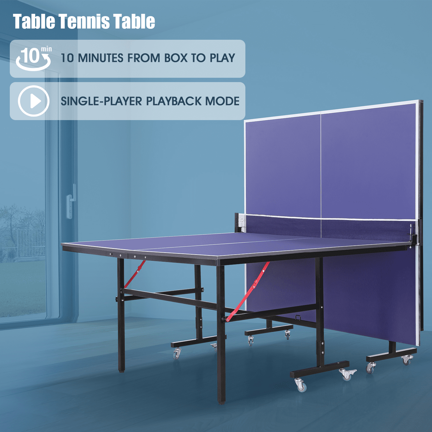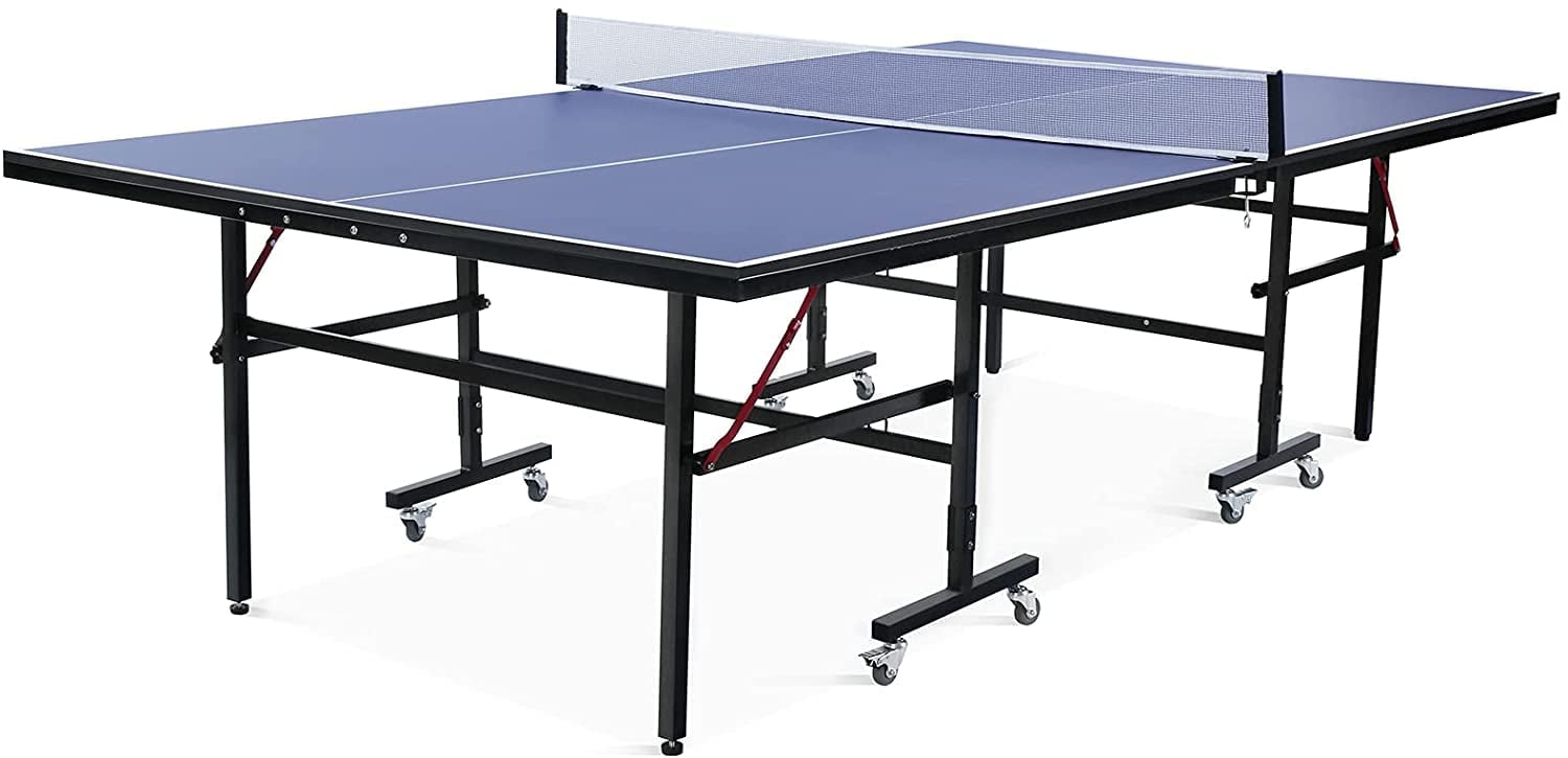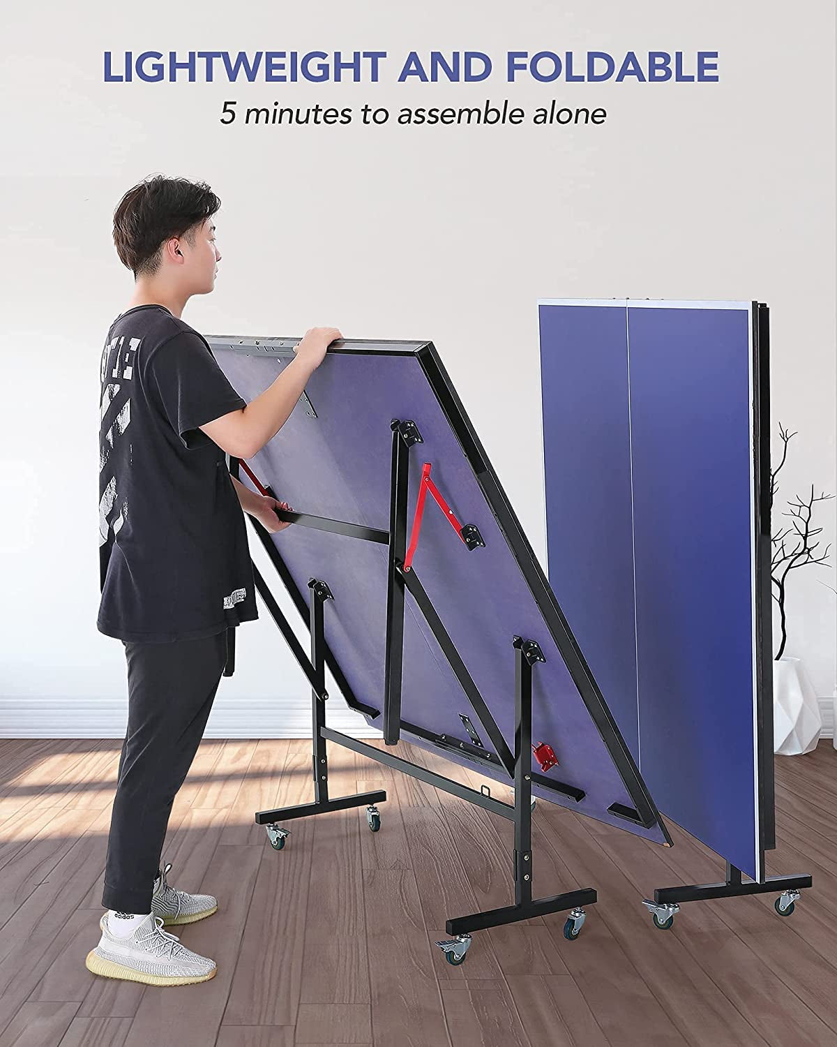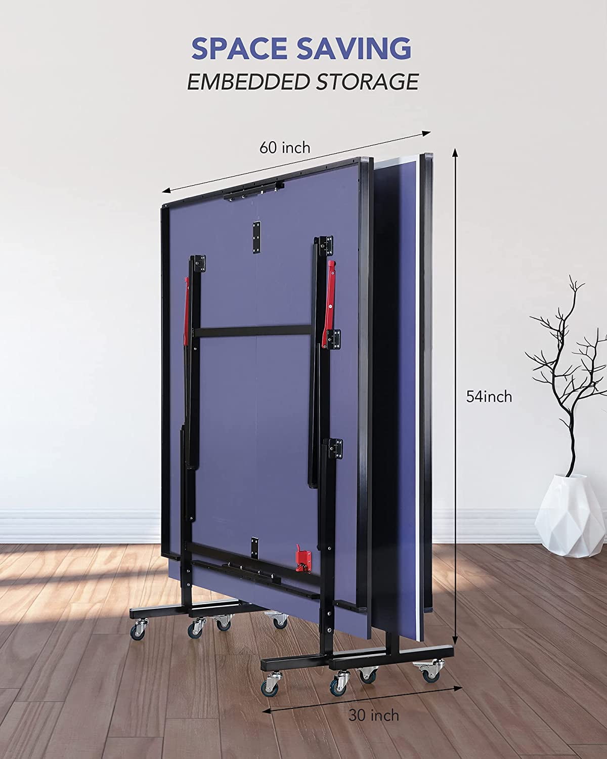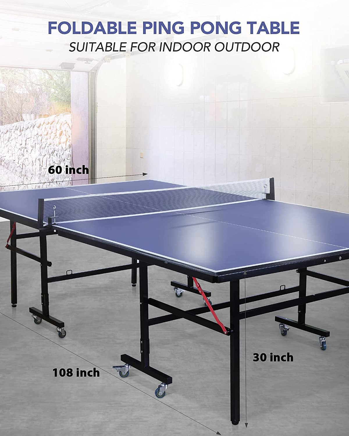 10 MINUTE ASSEMBLY: The table tennis table is made of high-quality high-density fiberboard. The surface of the ping-pong ball is composed of 4 high-quality MDF boards, which makes it easier to carry and move to various places to assemble. Quick assembly – Just attach the wheels and the ping pong net. Assembled product weight:119lb Safety Table Tennis Table: Our ping pong table comes with 4 lockable casters to ensure a secure ping pong table locking and prevent accidents during playing or storing. The thickened extra-large casters are sturdy and durable, no frictions or damages to floor, Keeps you safe all the time while you enjoy your ping pong game. 5/8 Inches MDF High-quality & Durable: Our ping pong table is made of high-density MDF to meet tournament standards and high-end industrial standard with good rebounding for ping pong, The quality of the panel determines the height of rebound, plays as given sized indoor ping pong table suitable for home, office, or entertainment center. Silver thickened circular tube features rust-resistant and sturdy with good appearance. Technical high-density nylon net is thicker and stable. Adjustable Height: The height of ping pong table legs are adjustable. Customized design to choose suitable height, available for both adults and kids. The adjustable table tennis table can be used on different ground, not limited to flat area only. The thickened steel legs sized 1.2 inches with fastened support braces provide a more stable and sturdy weight capacity. Space-Saving and Foldable: 108(L)*60(w)*30(H) inches table meets all your recreational needs. Our table tennis table can be folded in 90°, sized 54(L)*60(W)*3.7(H) inches after folding. Taking small space and suiting various house type to save. The bottom has eight castors easy to move and pull. Moreover, after folding single player playback mode can be applied on table tennis table as well, Let you improve your table tennis skills even when you are alone.