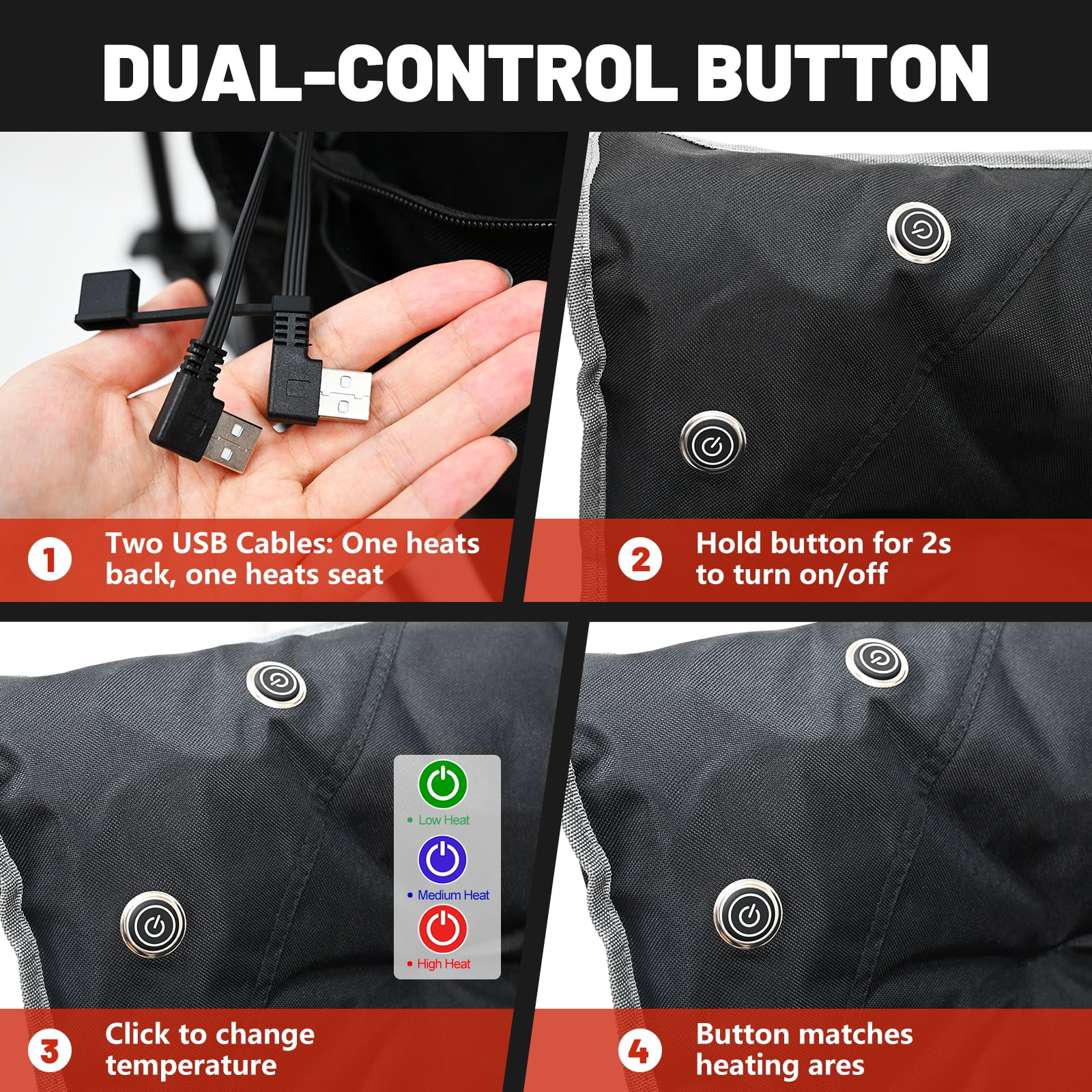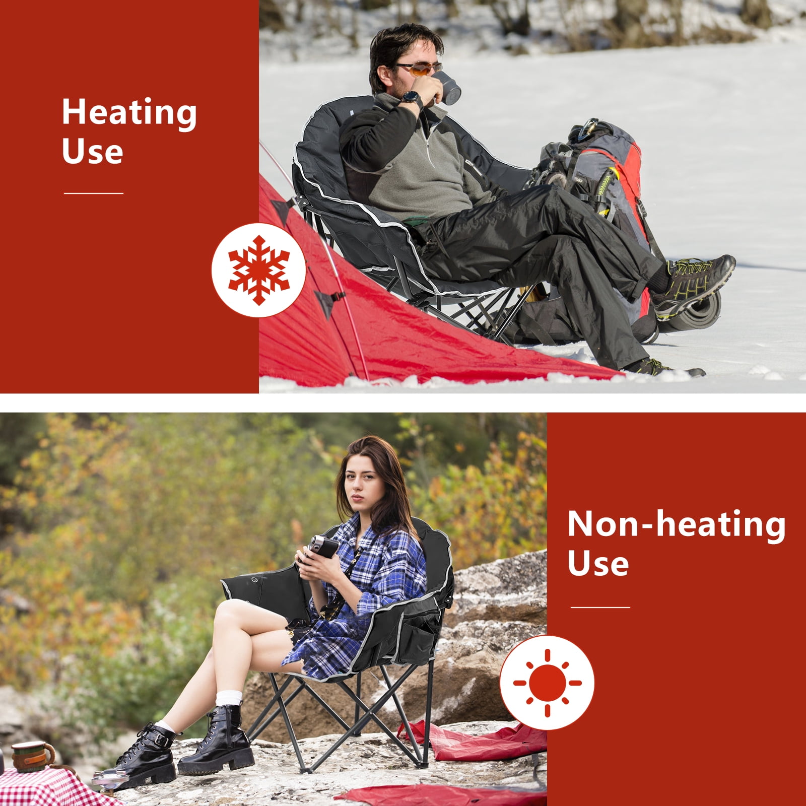 【Quality Material Selection】The Heated Camping Chair are made of high quality materials, durable and sturdy steel frame structure to ensure safety and quality. The heated camping lounge chair can withstand up to 500 pounds. The fabric is soft and comfortable and tear-resistant. 【HEATED CAMPING CHAIR】The Heated Camping Chair three when the temperature is adjustable, high, medium and low. Can be heated with any USB battery pack (batteries not included), providing you with ultimate warmth and comfort even in the cold winter. Suitable for camping, fishing, sporting events, lawn, garden, patio, backyard, outdoor activities and more. 【Dual Control Buttons】 The Heated Camping Chair has two control buttons. The lower button controls the seat heating and the upper button controls the back heating, turn on both buttons to heat at the same time. You can choose to heat the backrest or the seat, or both at the same time. 【Aesthetically Pleasing and Comfortable】The Heated Camping Chair is moon shaped and ergonomically designed with an extra large seat and backrest area. The full padding provides extra comfort and support. You can sit comfortably with your legs crossed or on your side, relax and enjoy your trip. 【Convenient and Easy to Carry】The Heated Camping Chair is easy to fold, no assembly required, lightweight and easy to carry. There are battery pack pockets and storage pockets for USB batteries, beverages and cell phones. Comes with a carry bag for easy carrying and storage.
