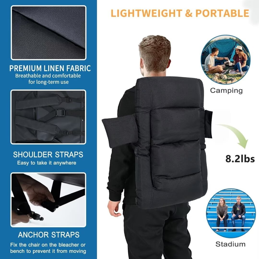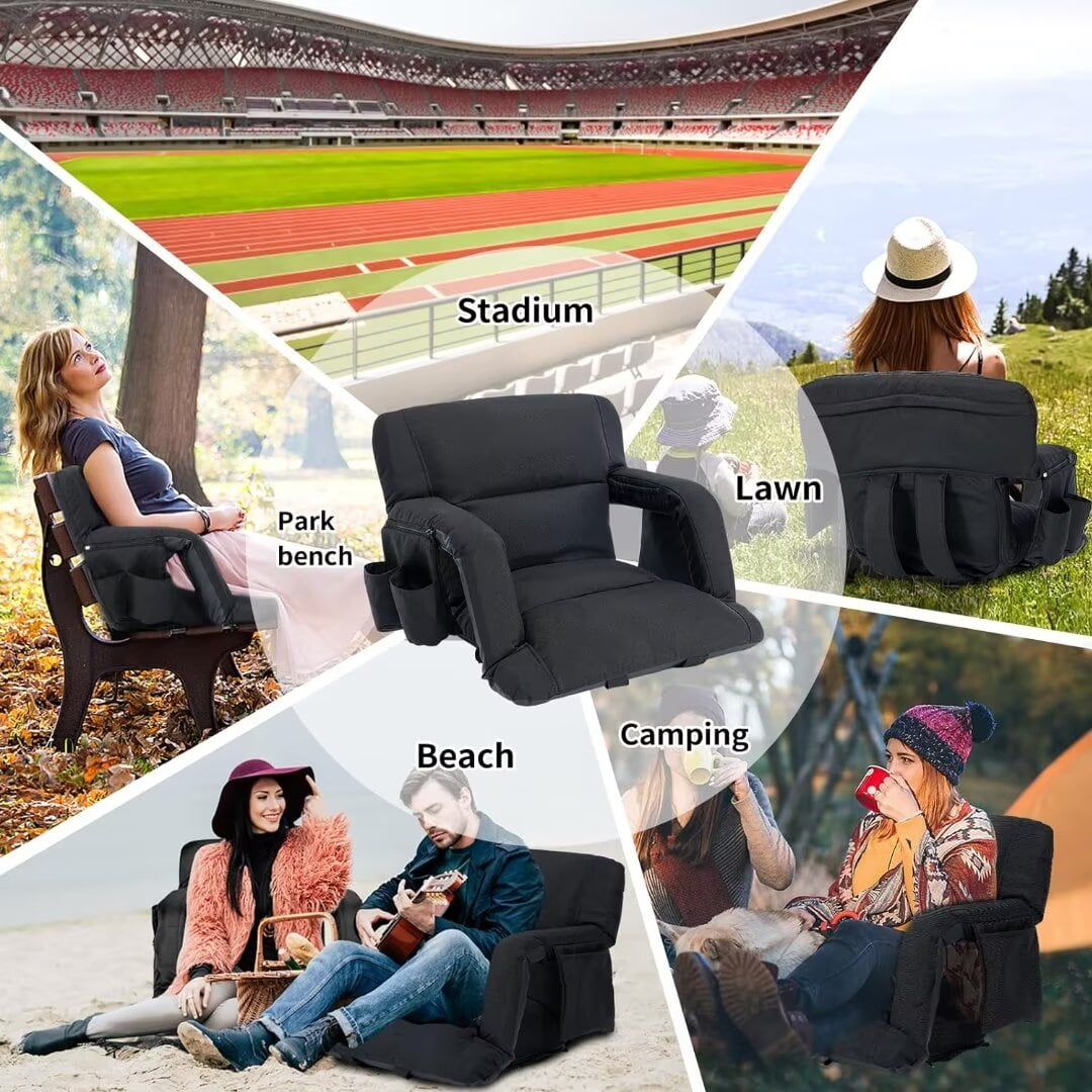 ãDurable and Waterproofã This bleacher seat is made of high quality Oxford fabric, high density foam padding soft cushion and steel tube, comfortable, durable and waterproof, which can be adapted to different needs in various weather conditions. ãSix positions can be reclinedãThis bleacher seat six positions can be reclined, with armrest support and adjustable width, you can avoid muscle soreness caused by sitting for a long time, you can choose the best posture to enjoy the game or life. ãFoldable Portable Bleacher ChairãThis bleacher seat can be folded and designed with shoulder straps, you can easily carry it to wherever you want. And there are two bench straps on the bottom of this bleacher seat, so you can fix it on the bleachers or benches to prevent it from moving. ãLarge Storage SpaceãThis bleacher seat has storage pockets and cup holders to store your hats, glasses, snacks, cell phones, magazines and other personal items, freeing your hands. The cup holders prevent spilling drinks. ãIdeal Equipment for Outdoor SportsãWith this bleacher seat, you can avoid muscle aches and pains caused by sitting for a long time, and you can focus more on the sports events. The bleacher chair with backrest and cushion is perfect for any outdoor activities, picnics, camping and fishing trips.