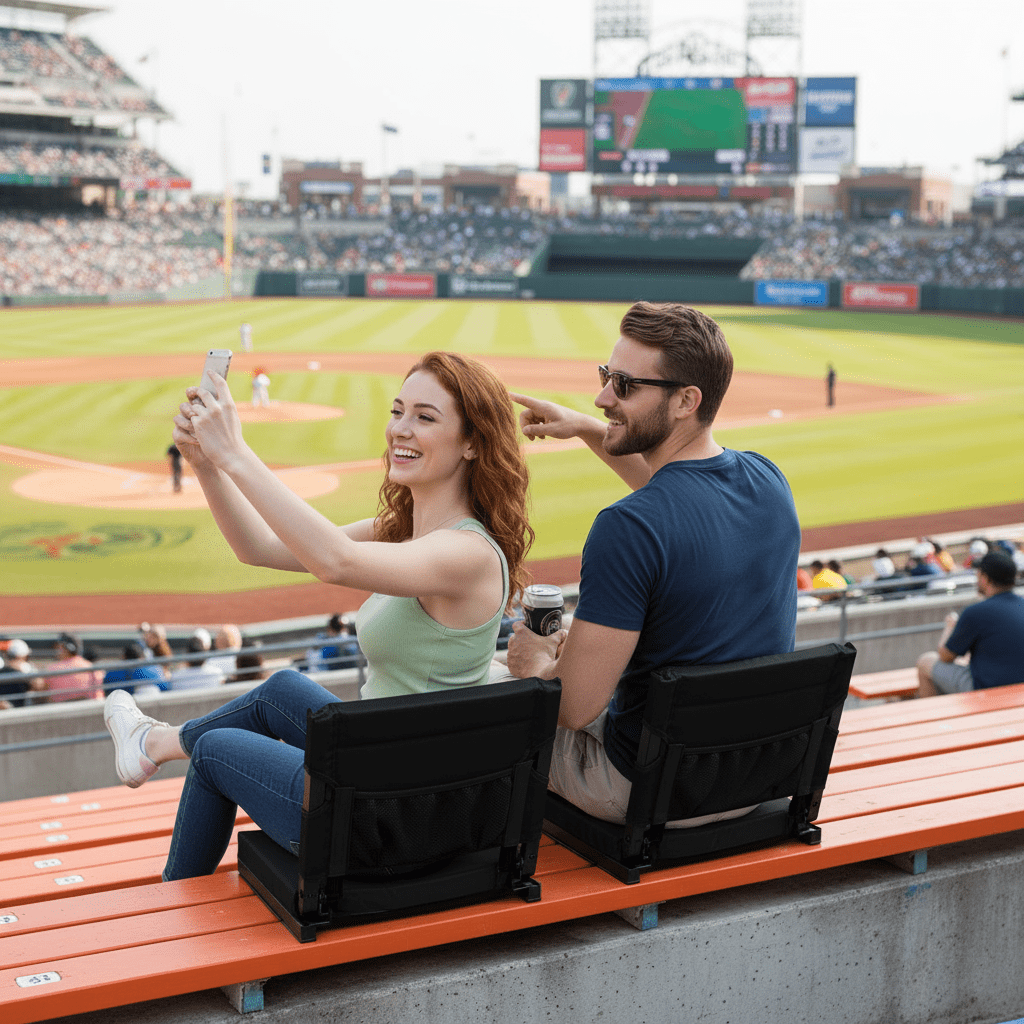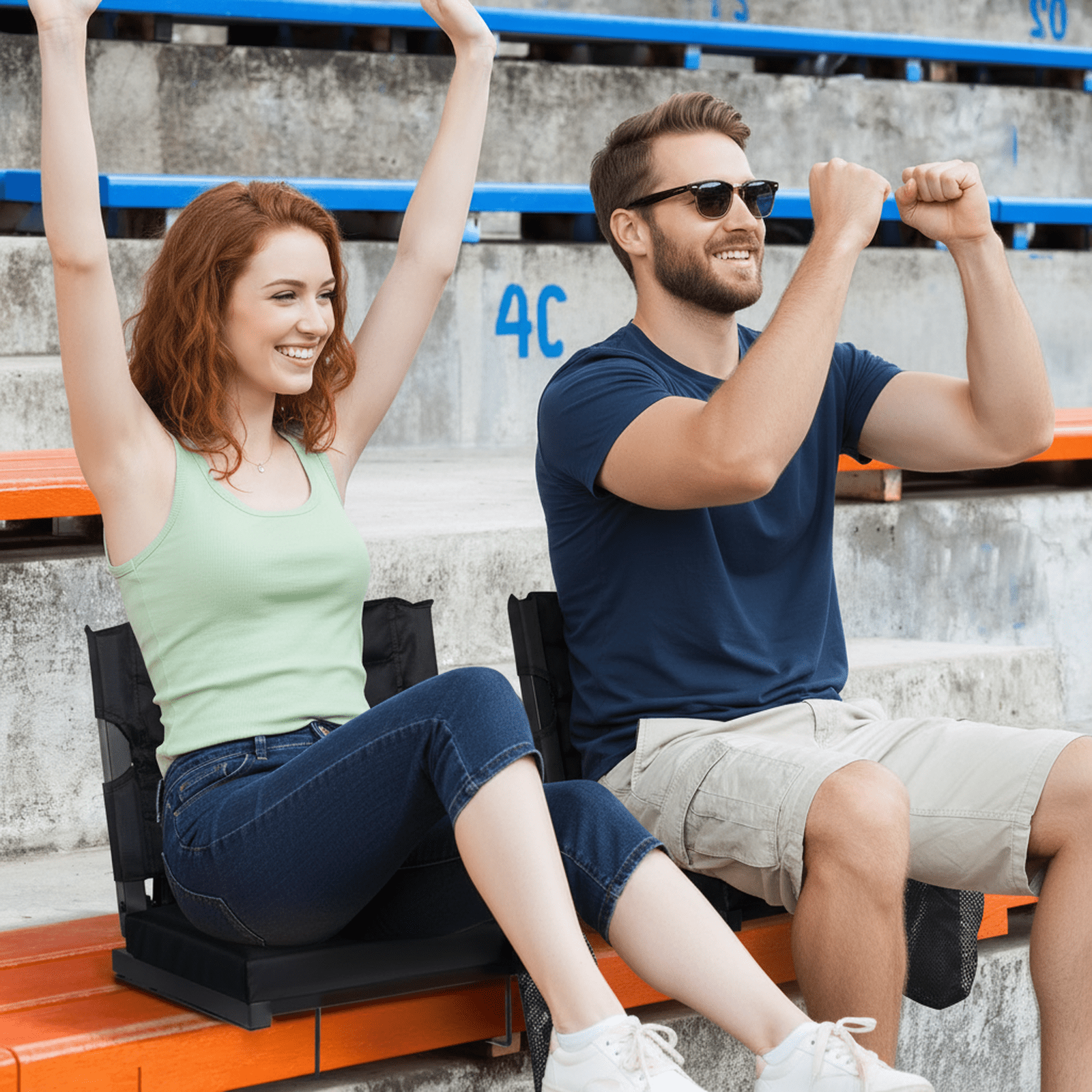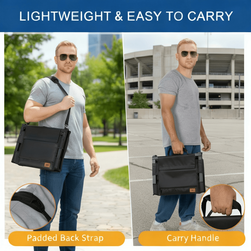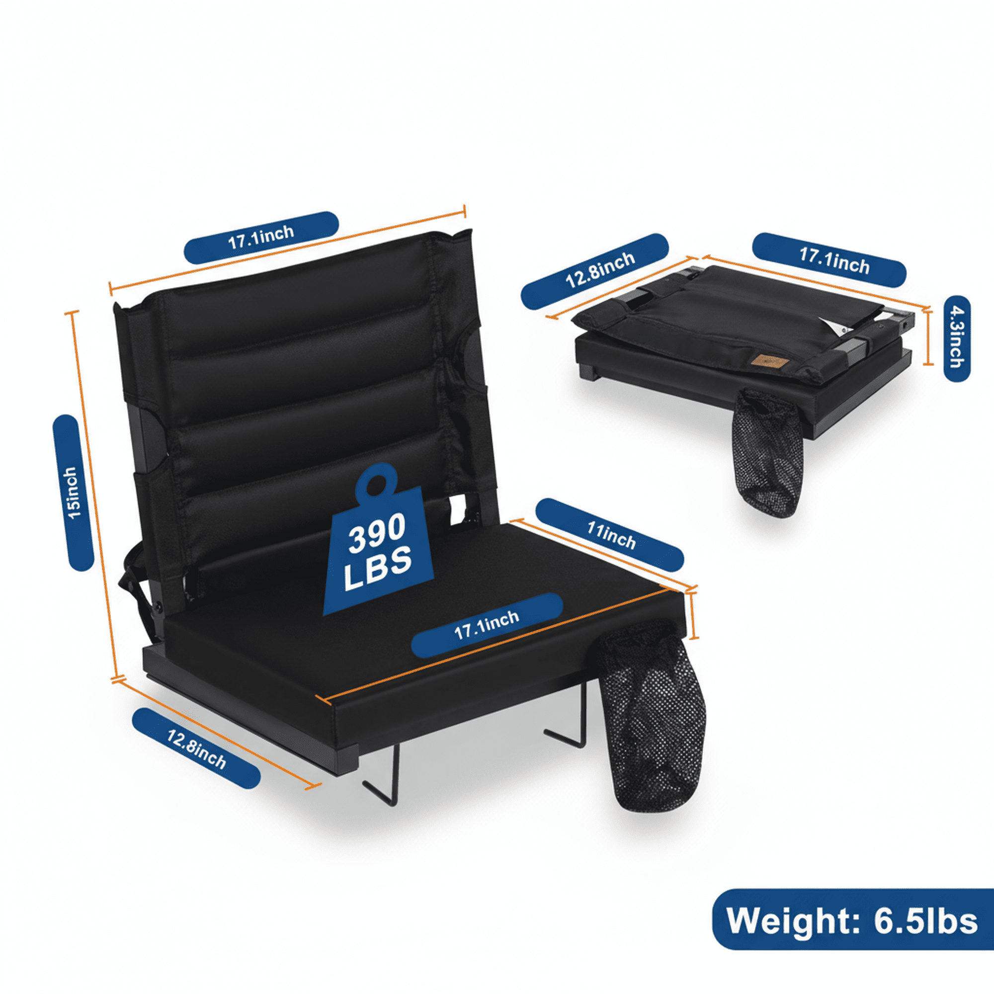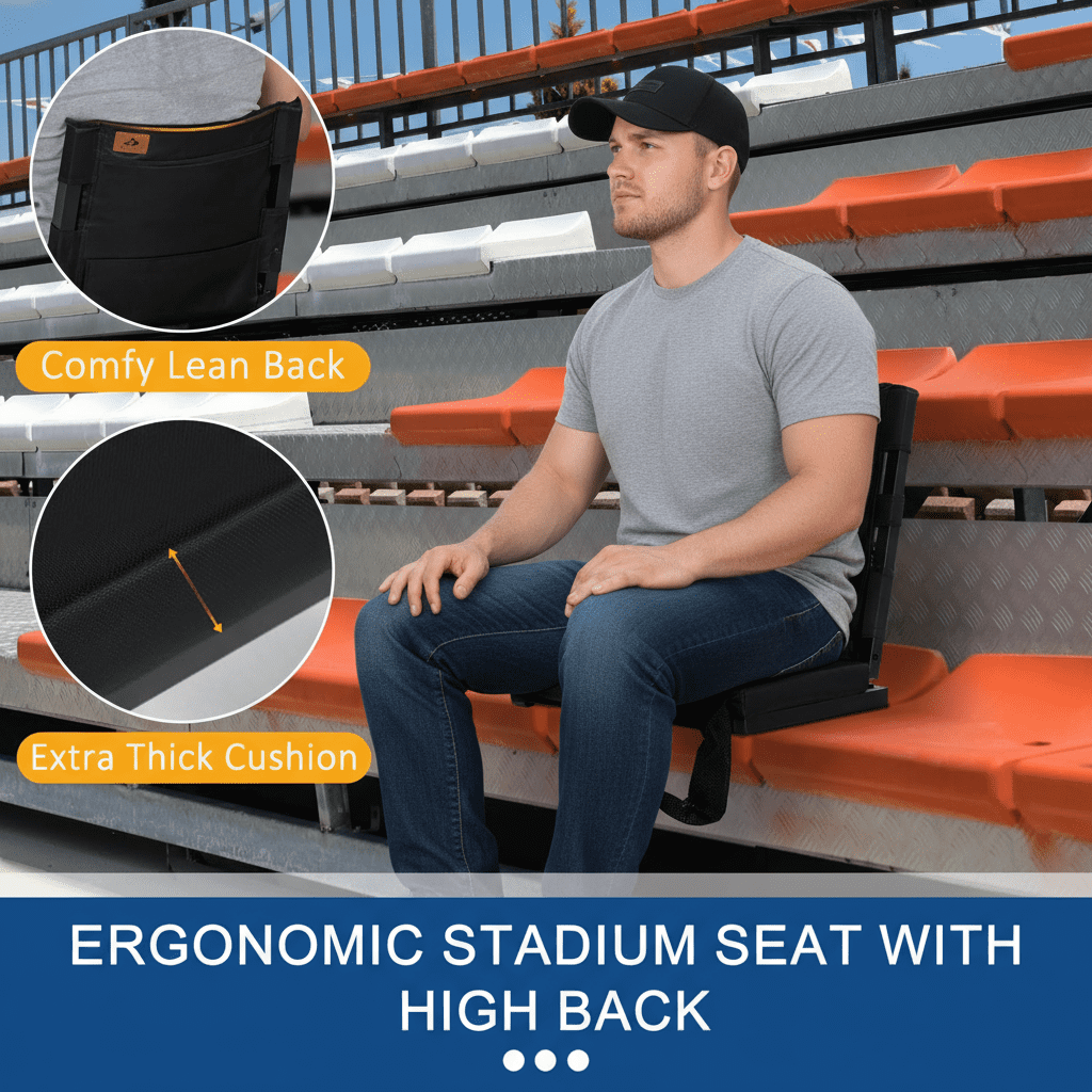 More Comfort and Durability: Our stadium seat with soft back support and a 600D polyester-covered padded cushion mounted on a sturdy steel frame. The seat is 4 inches thick providing more comfort. It allows you to sit on benches and bleachers for a whole afternoon without back pain. Lightweight & Easy to Carry: Weight: 7 pounds. This stadium seat is lightweight, portable, and convenient. Comes with a top carry handle and a padded back strap, carrying this like a backpack makes it easy to transport and you just pull it up to make it a seat. Cup Holder & Zipper Pocket: Our seat carries a cup holder and a side pocket. An elastic band is added above the water cup. When carrying the seat, it can provide support for the inverted cup and prevent it from falling. The side pocket has a zipper to protect your phones/snacks/keys and other stuff. Non-slip Design: The stadium seat is featured with 2 folding hooks at the bottom of the cushion. It can keep the seat in place without slipping off. When folding the hook, it has Velcro and will not get stuck. The bottom of the seat is also designed with a rubber anti-slip graphic layer, so you don’t have to worry about slipping even on a wet bench. Wild Usage: Our stadium chairs have great weight capacity and can easily accommodate people of all shapes and sizes. Perfect for stadiums, bleachers, sports games, beaches, camping, parks, and picnics.
