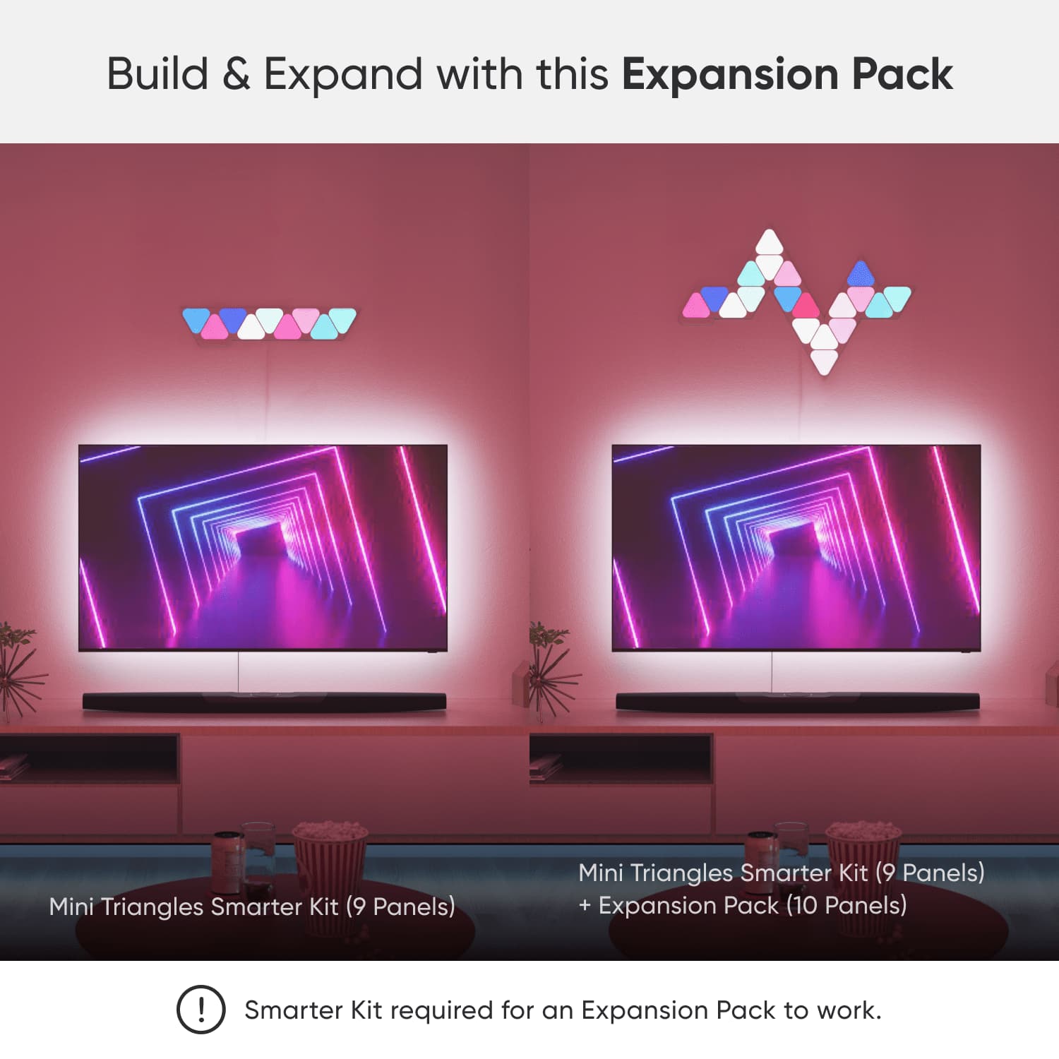 Unleash your creativity to the fullest and grow your setup with Expansion Packs. Each Pack includes 10 mini panels and mounting supplies. Each Mini Triangle is 0.54W. Power supply supports up to 42W. One Controller can support up to 500 panels. Please note, this kit requires the Controller and PSU included with any Nanoleaf Shapes Smarter Kit.