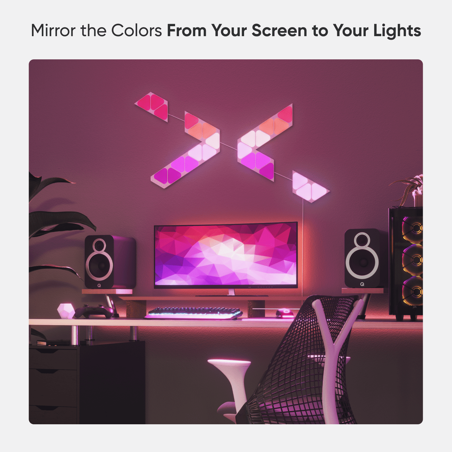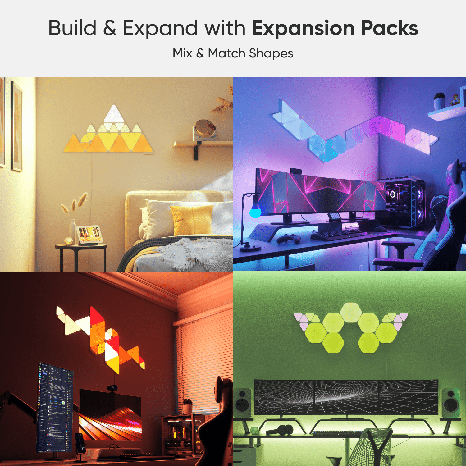 Smart modular color-changing light panels, with shapes you can mix-and-match for complete design freedom. Available in Hexagons, Triangles, and Mini Triangles, create your own custom layout and transform your space with color and light in minutes with their simple setup—no tools required. These ultra-thin panels are packed with innovative smart technology to deliver fun and functional features like Music Sync, Screen Mirroring, Schedules, Touch Reactivity, and more, which means you’ll never run out of new ways to experience your lighting your way.