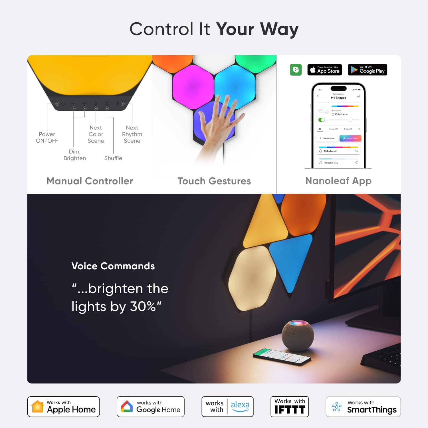 Customize your lights in the Nanoleaf App: create Scenes, Playlists, set schedules, or download/share your Scenes with the user community. Control with your touch, voice via Apple HomeKit, Amazon Alexa, Google Assistant, SmartThings or IFTTT, and more.