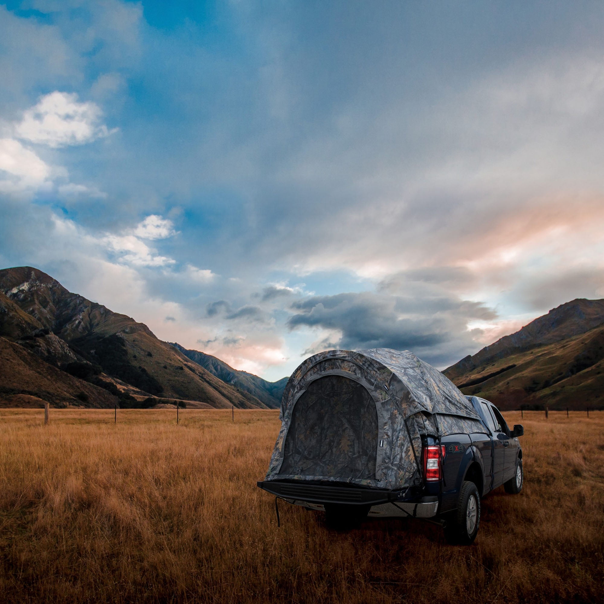 Camp out wherever your pickup can take you with this compact/short truck bed outdoor tent Spacious interior offers ample room for up to 2 adults to comfortably relax; Max center height is 62 inches tall Internal gear loft, gear pocket, and lantern holder keeps your personal items neatly organized Features full rainfly and storm flaps for increased privacy and protection from all the elements Works with specific vehicle types with a compact or short truck bed measuring 5 to 5.2 feet long Large entrance door and 2 mesh windows offer optimal ventilation inside the tent Easy 10-minute set-up with color-coded poles and sleeve assembly; Includes convenient carry bag Provides added safety and security camping inside bed of your truck Ideal for use in nearly any season including spring, summer, and fall Compatible with various Chevy, Dodge, Ford, GMC, Nissan, and Toyota makes and models; Full list available in images Sleeps: 2 people Windows: 2 Doors: 1 Center height: 58 to 62 inches Frame: Fiberglass poles Tent material: 68D polyester taffeta Floor material: Polyethylene Color: Camouflage Weight: 16 pounds