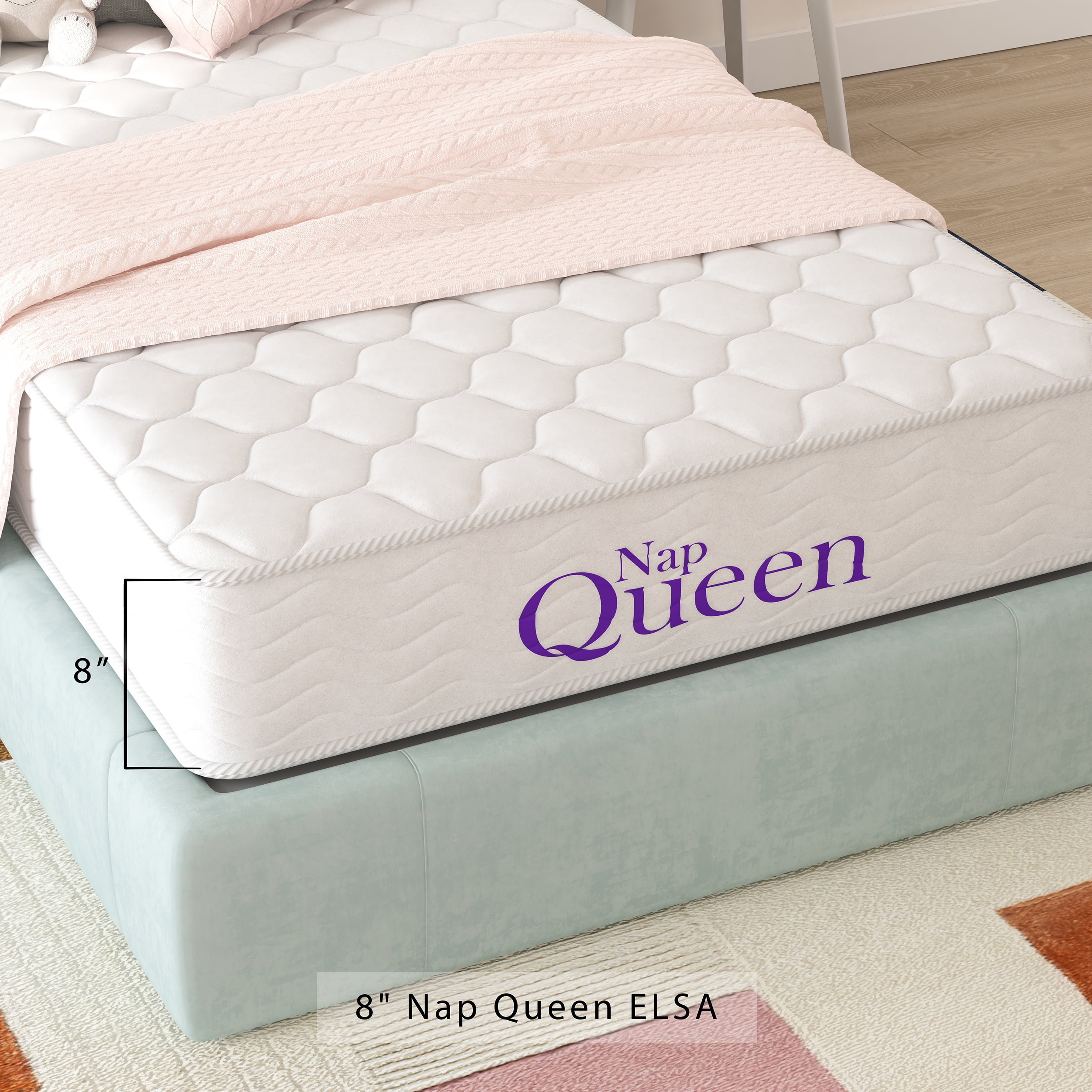 Sleep Is Power – Sleep deeper and wake up with more abundant energy. Your medium-firm queen size innerspring mattress ELSA from Nap Queen is here to support your progress toward a happier and healthier life. Multifaceted Mattress – Give your muscles and bones what they need with a layered approach. Your medium-firm memory foam mattress has a soft jacquard top, 2 in. of memory foam, and modern steel springs. Regal Comfort – Fall into bed face-first, stay comfy and cool all night, and wake up feeling great. Your medium-plush mattress is ideal for those who like to sleep on their stomachs. Your medium-plush mattress is ideal for those who like to sleep on their stomachs. 21st Century Bedding – Slumber in safety on an ergonomic mattress made of modern materials. We make our mattresses with no VOCs, heavy metals, formaldehyde, or other toxic substances. The Queen Is Listening – Count on us to deliver modern king, queen, full, and twin size mattresses that change the way you sleep. Your bed is backed by our commitment to your well-rested satisfaction. Age Group: Suitable for all age groups, from young children to adults.