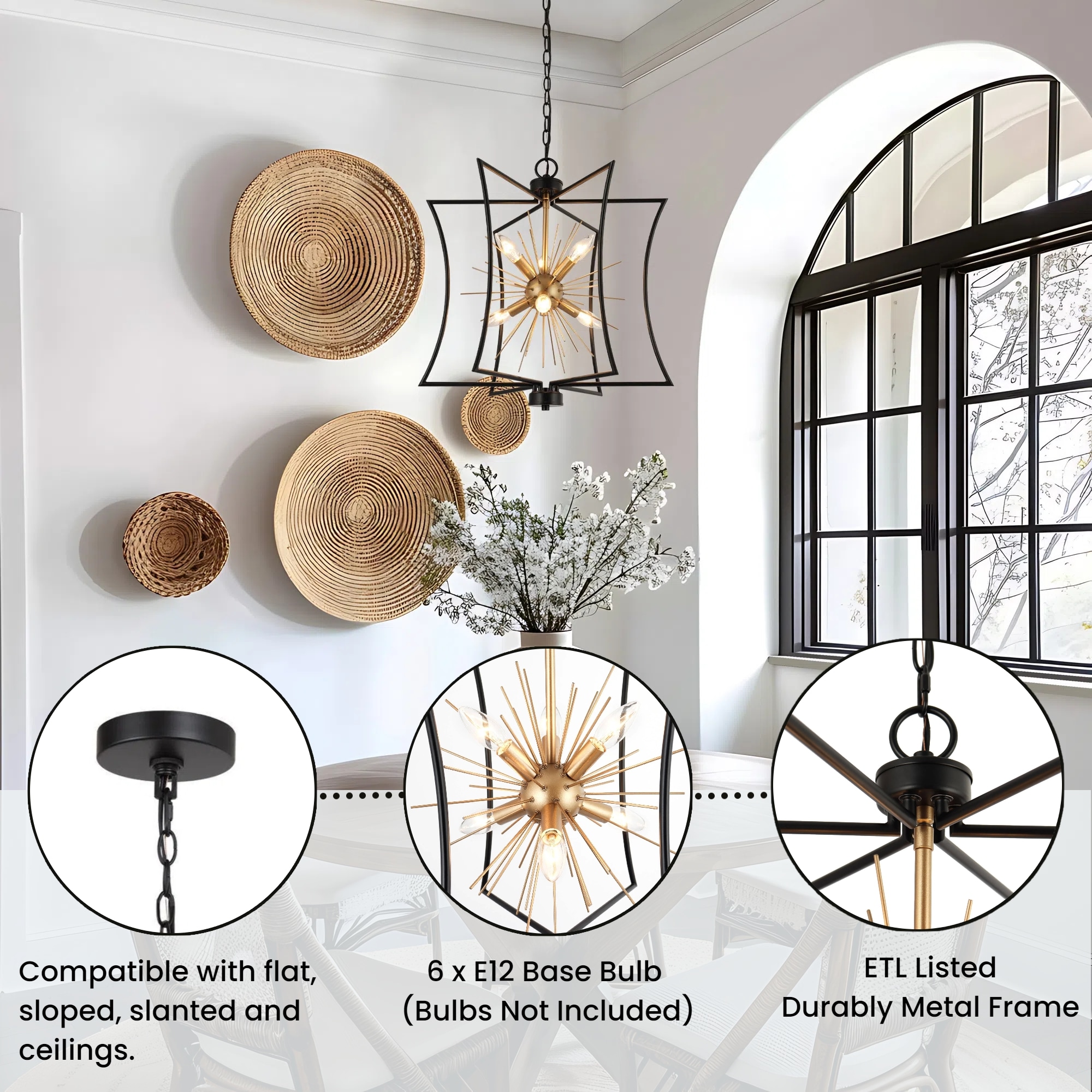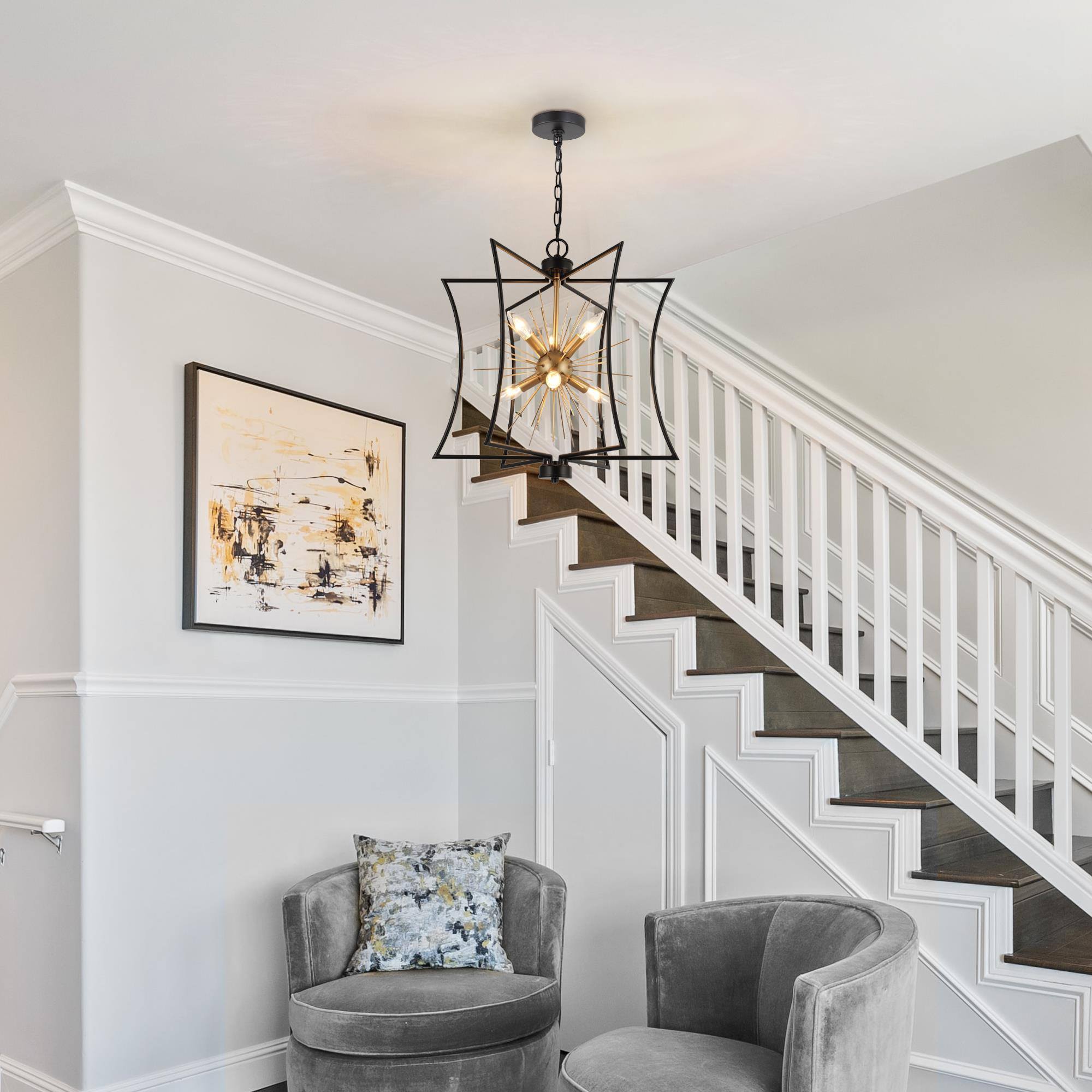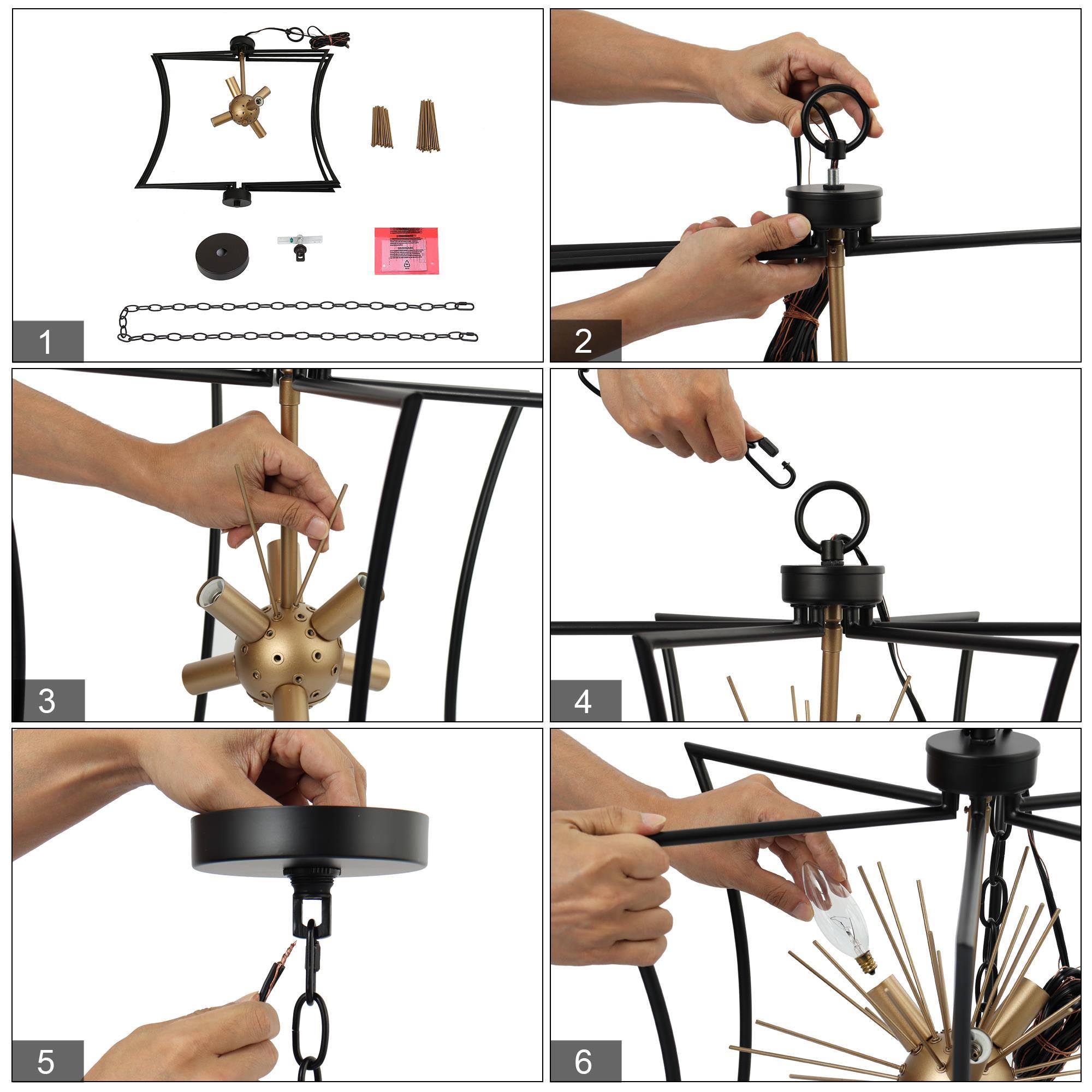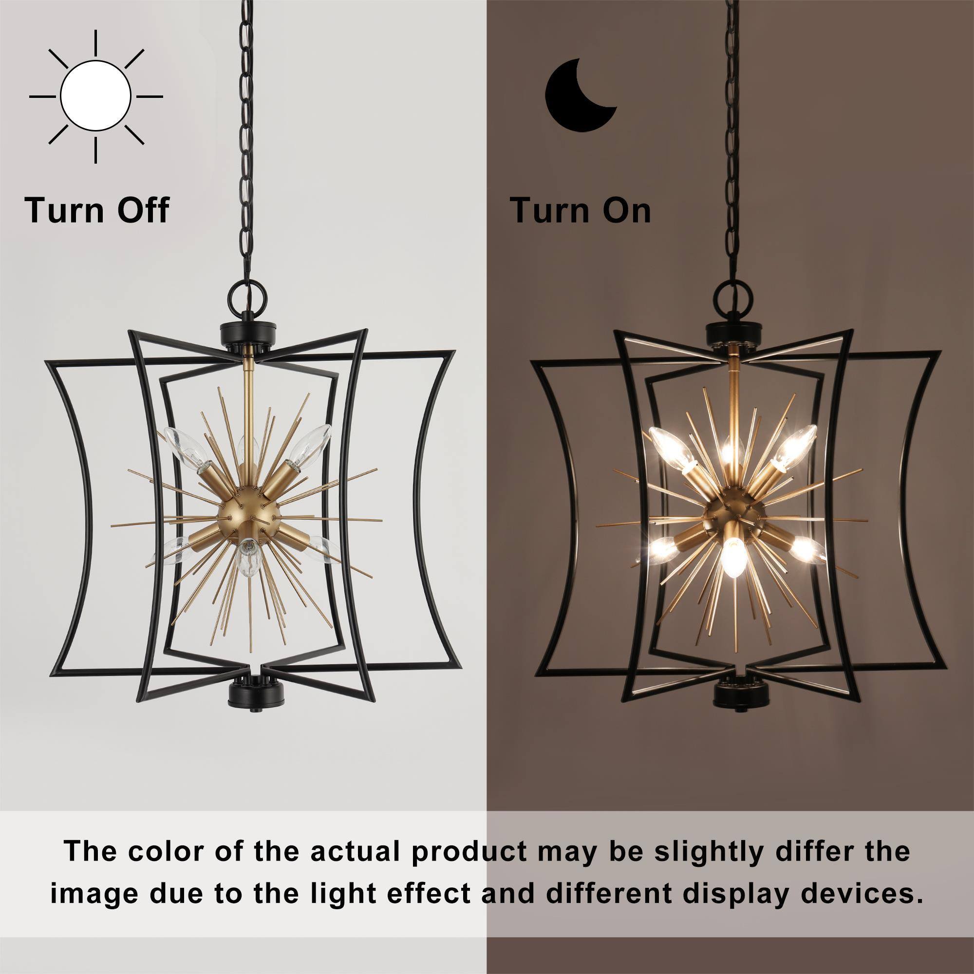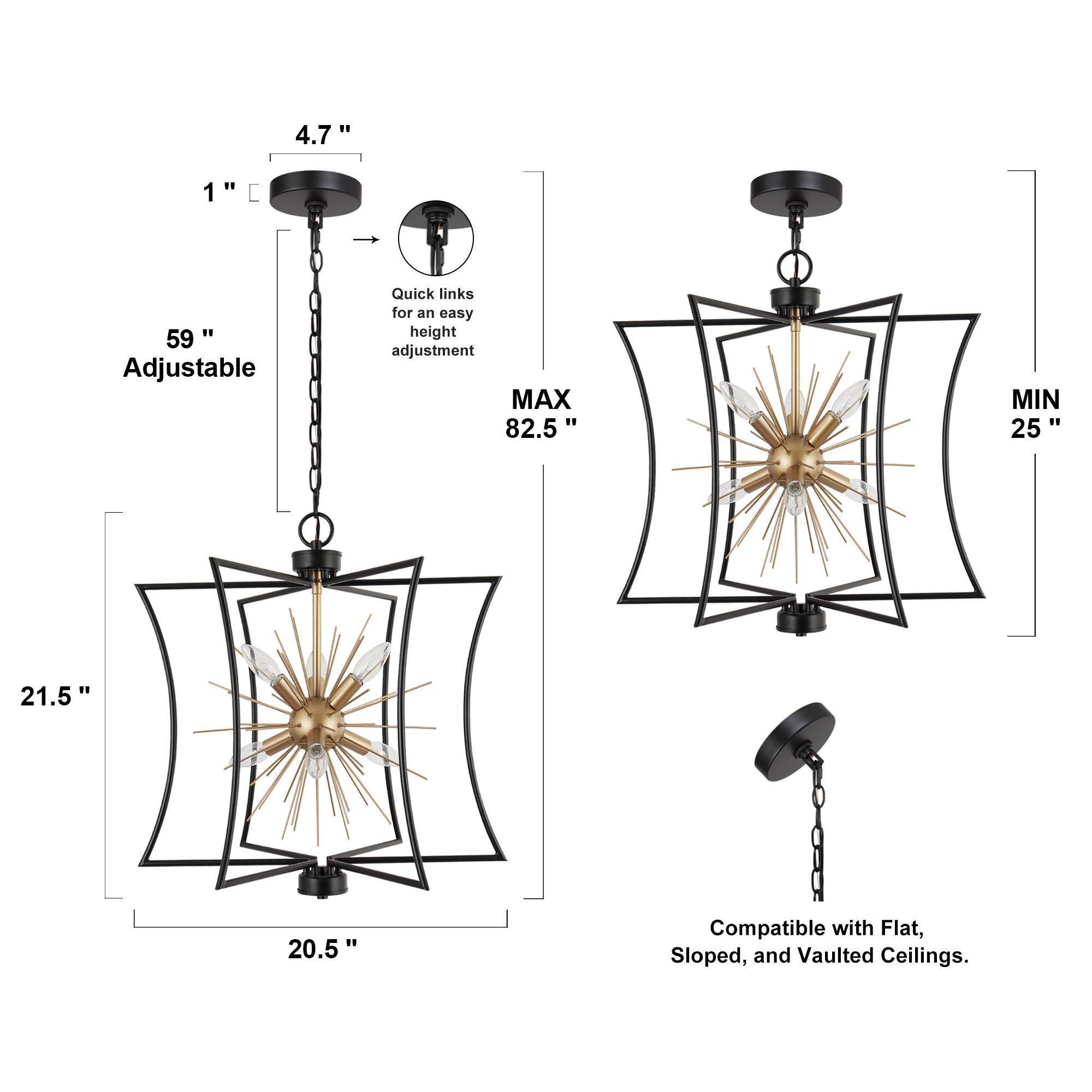 Illuminate your home with the epitome of style and function—the 6-light chandelier from . Designed with a unique geometric shape and a mesmerizing starburst pattern, this eye-catching piece isn’t just a chandelier; it’s an art form. Engineered with a chic matte black and gold finish, it perfectly blends modern sophistication with timeless elegance, making it ideal as a dining room chandelier over your table, a striking black and gold pendant light for your kitchen island, or even a stylish entryway chandelier for high ceilings. But it’s not just about the aesthetics. It features advanced dimmable functionality, working seamlessly with dimmers and dimming bulbs to give you the exact ambiance you desire—be it for cozy family dinners, or vibrant dinner parties. Have a space with variable ceiling heights? No problem. This marvel is height adjustable from 25″ to a dramatic 82.5″, catering to both compact apartments and sprawling estates. From farmhouse chandeliers for your dining room, modern chandeliers for your living spaces, or even bedroom chandeliers that add a touch of glamour, this versatile piece checks all the boxes. It’s more than just a light; it’s a centerpiece that commands attention. Whether you’re revamping your dining room lighting fixtures, seeking the perfect pendant lighting for your kitchen island, or simply desiring a black chandelier that is a modern masterpiece, this chandelier transcends its role as a mere light fixture to become a statement piece for any room. So why settle for ordinary when you can elevate your home with this one-of-a-kind piece? Switch on to timeless elegance, and illuminate your lifestyle today!