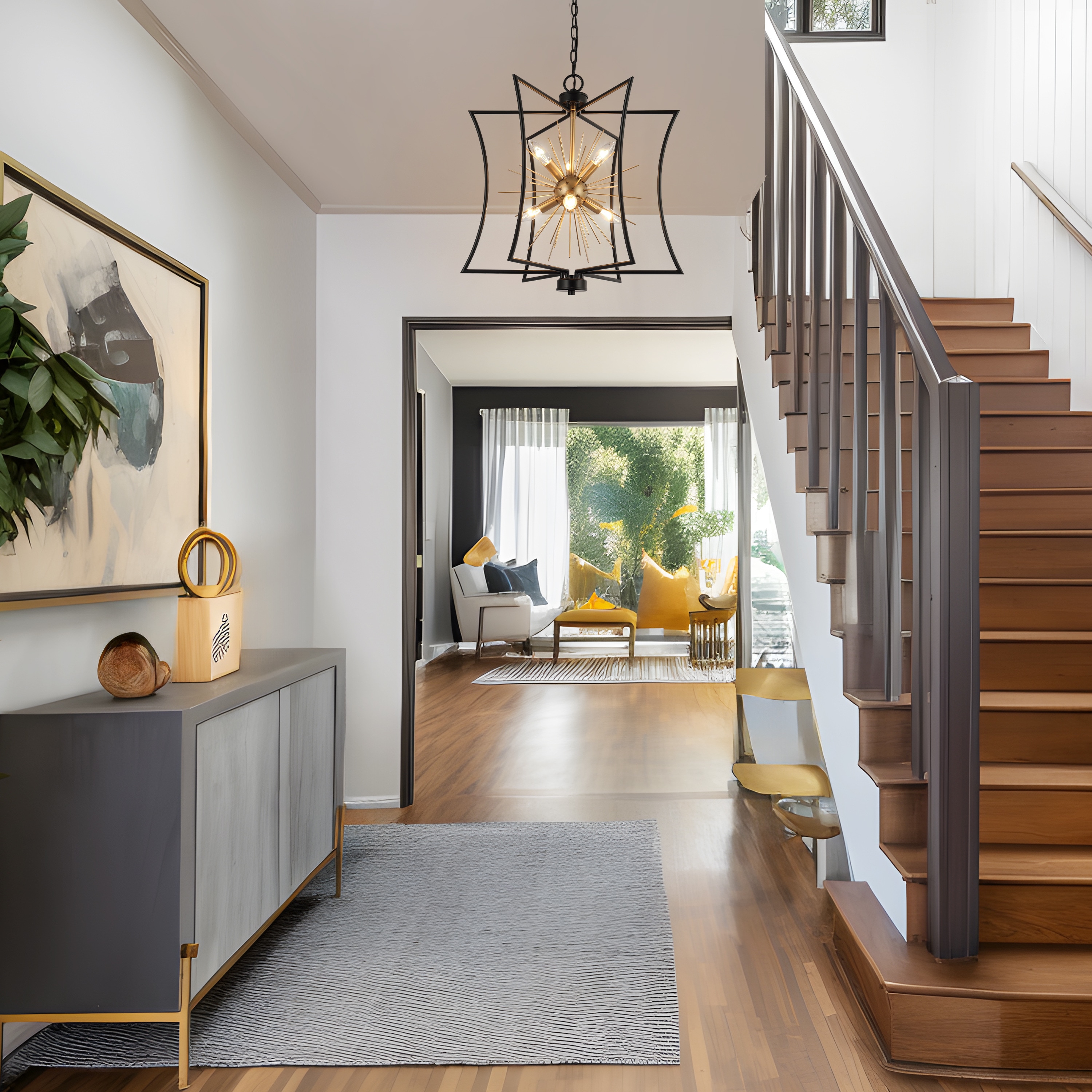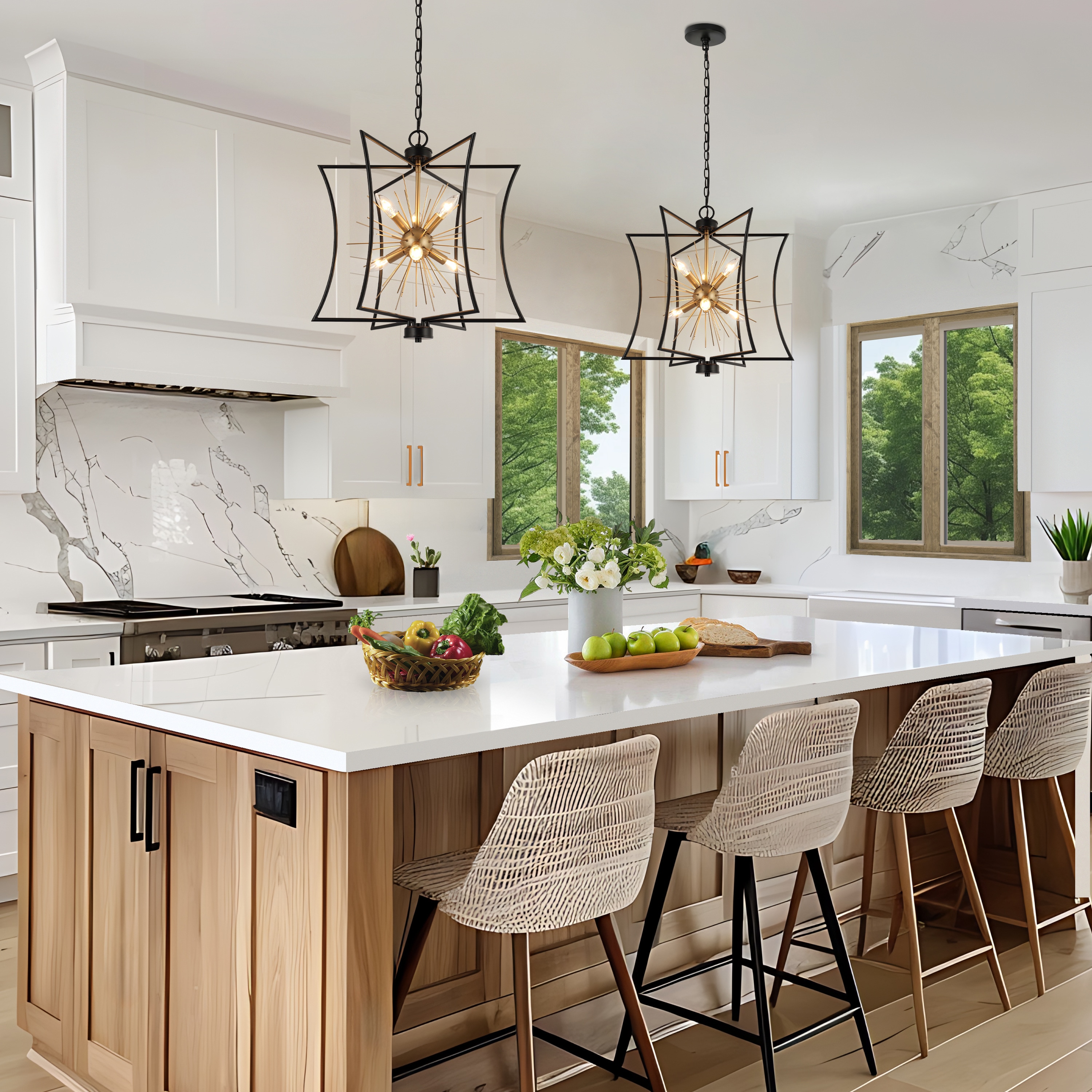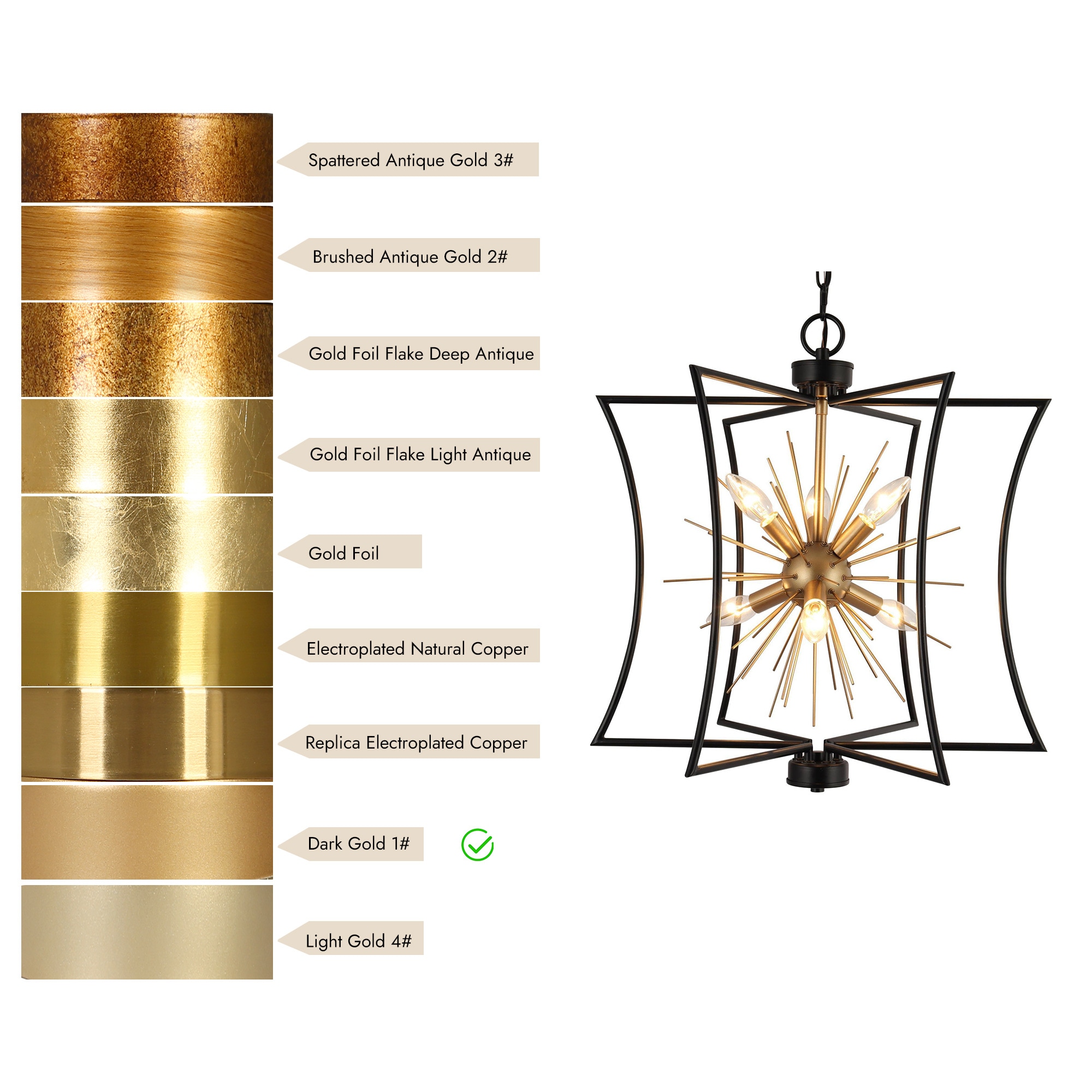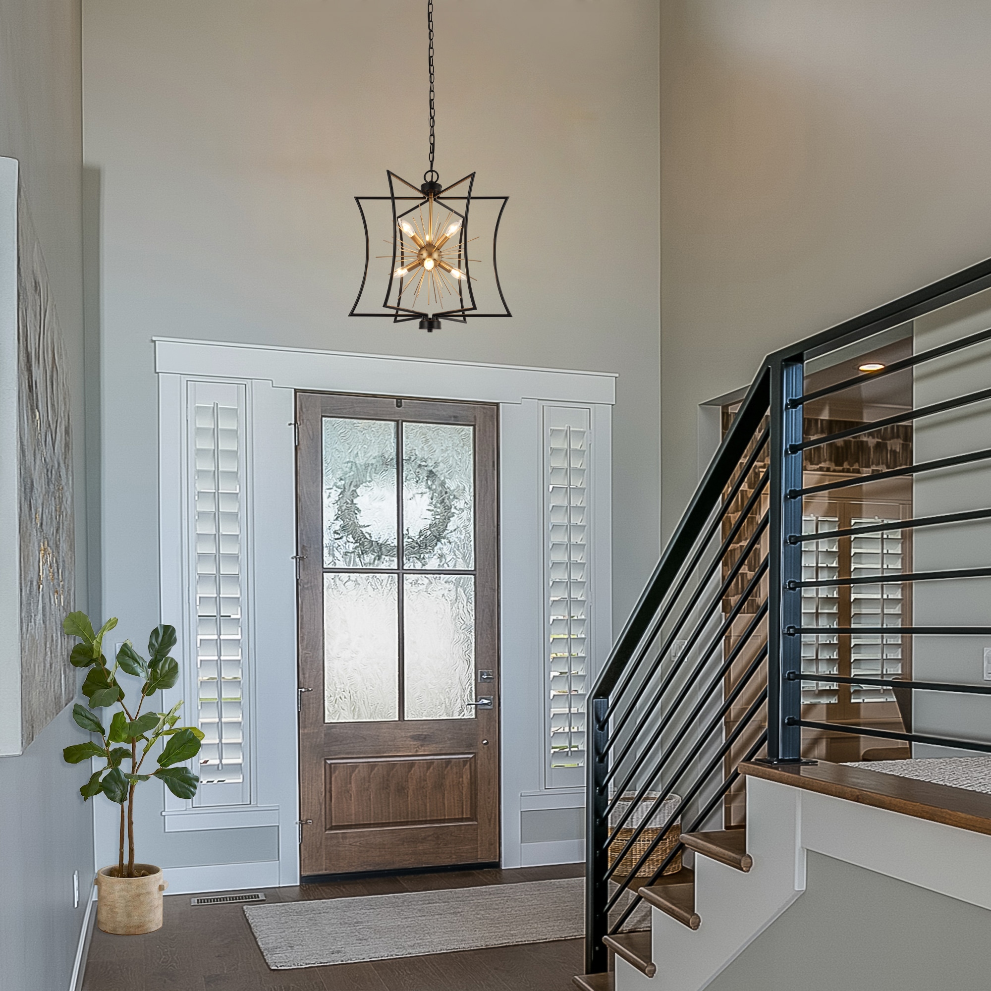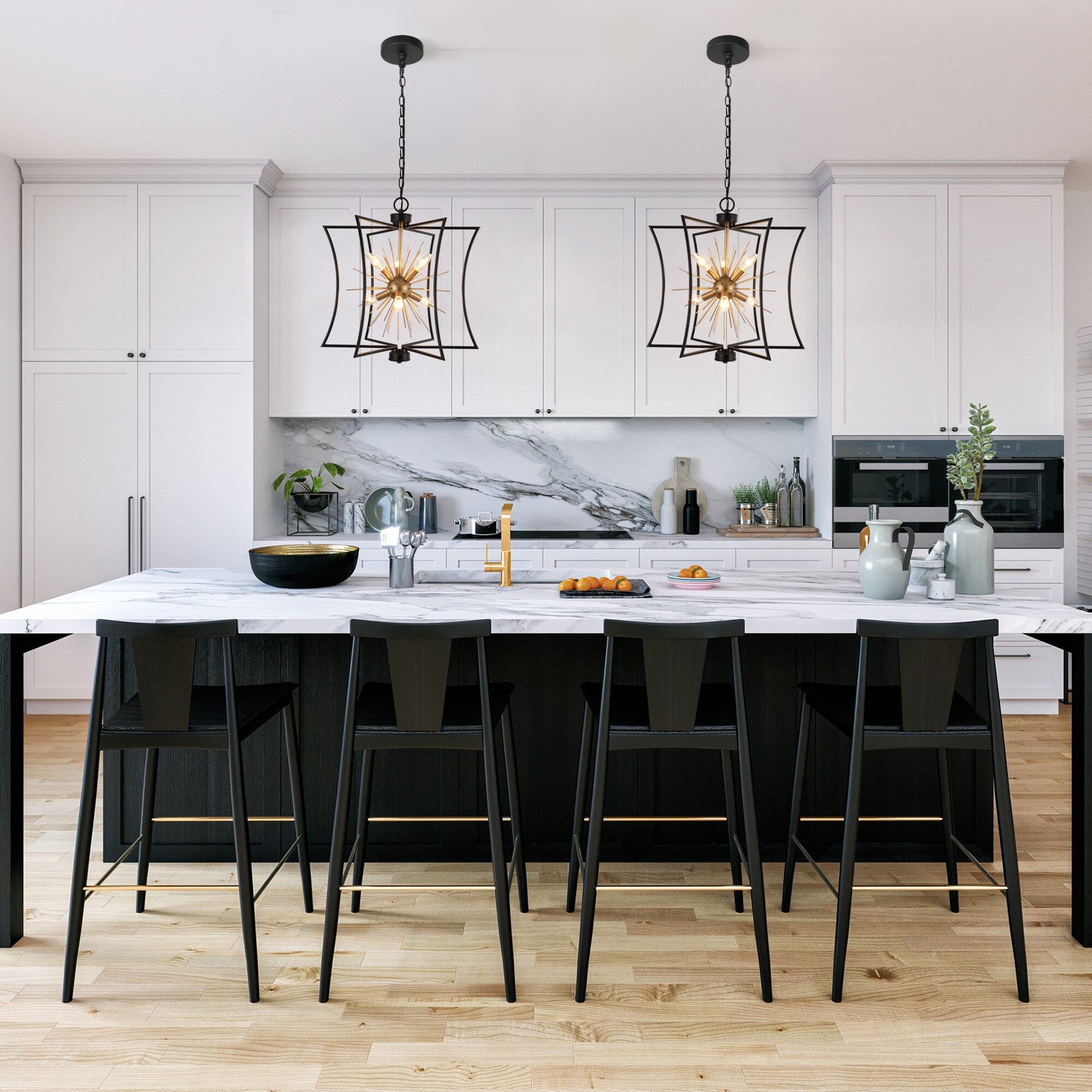 Illuminate your home with the epitome of style and function—the 6-light chandelier from . Designed with a unique geometric shape and a mesmerizing starburst pattern, this eye-catching piece isn’t just a chandelier; it’s an art form. Engineered with a chic matte black and gold finish, it perfectly blends modern sophistication with timeless elegance, making it ideal as a dining room chandelier over your table, a striking black and gold pendant light for your kitchen island, or even a stylish entryway chandelier for high ceilings. But it’s not just about the aesthetics. It features advanced dimmable functionality, working seamlessly with dimmers and dimming bulbs to give you the exact ambiance you desire—be it for cozy family dinners, or vibrant dinner parties. Have a space with variable ceiling heights? No problem. This marvel is height adjustable from 25″ to a dramatic 82.5″, catering to both compact apartments and sprawling estates. From farmhouse chandeliers for your dining room, modern chandeliers for your living spaces, or even bedroom chandeliers that add a touch of glamour, this versatile piece checks all the boxes. It’s more than just a light; it’s a centerpiece that commands attention. Whether you’re revamping your dining room lighting fixtures, seeking the perfect pendant lighting for your kitchen island, or simply desiring a black chandelier that is a modern masterpiece, this chandelier transcends its role as a mere light fixture to become a statement piece for any room. So why settle for ordinary when you can elevate your home with this one-of-a-kind piece? Switch on to timeless elegance, and illuminate your lifestyle today!