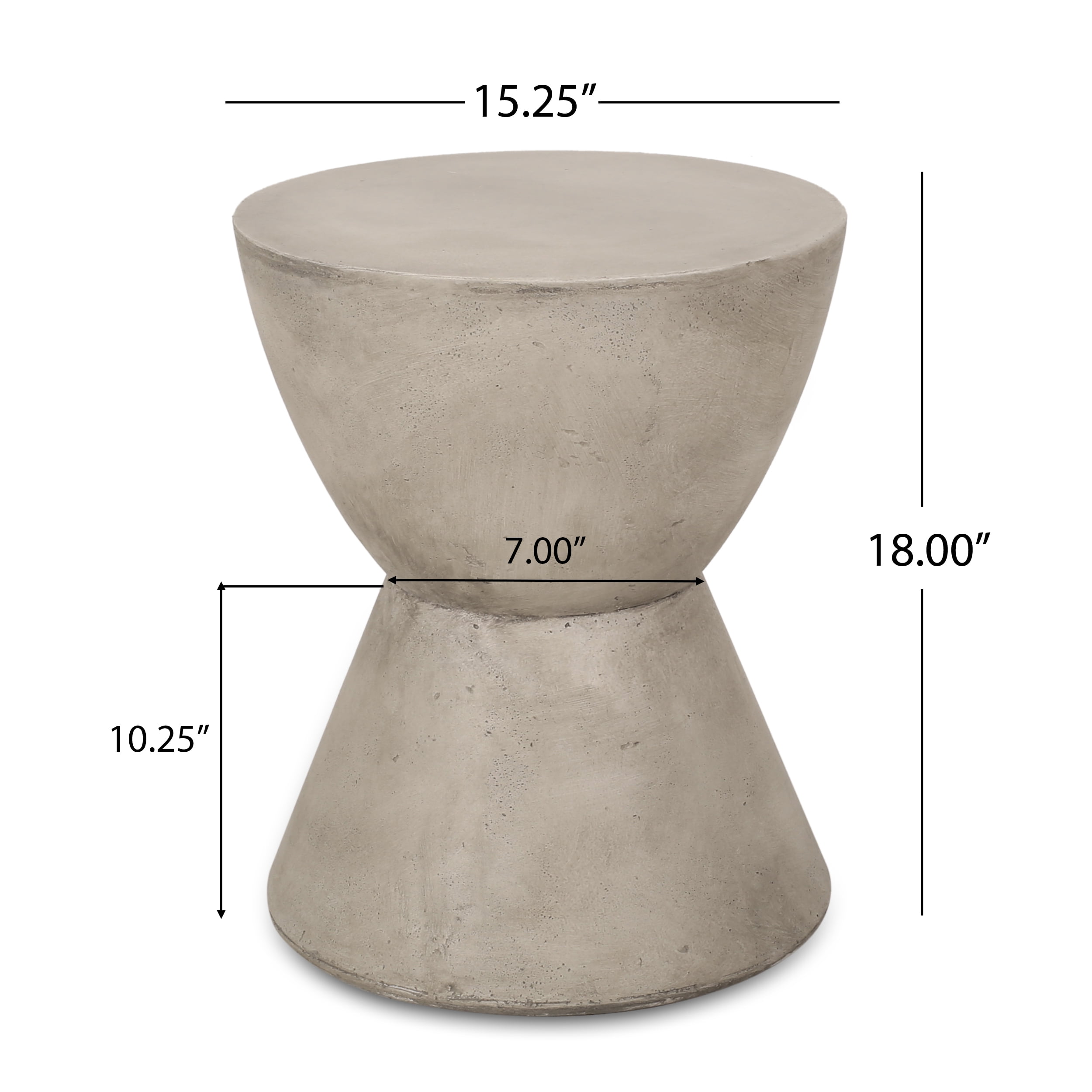 Set your outdoor space up for immediate success with a perfect accent to your seating ensemble. With a smooth lightweight concrete structure and modern design, this side table offers high durability and stunning looks for your backyard or patio. Perfect as an end table next to your chat set or sectional, this piece will hold any snacks or chilled drinks in sophisticated grace. Finished with an hourglass shape and pedestal structure, this table is a seamless addition to any space. A TOUCH OF PERSONALITY: Bring your outdoor space to life with our end table that features a solid structure with a smooth hourglass design. With charming aesthetics, this side table will be sure to enliven any backyard or patio. CONTEMPORARY DESIGN: Featuring a simple pedestal shape, this side table offers the look, feel, and design of a truly contemporary piece. With a minimalistic yet refined structure, this table brings out a simplistic style that emphasizes functionality. LIGHTWEIGHT CONCRETE: This side table is constructed with lightweight concrete for a smooth look. This provides a highly durable structure that can hold a substantial amount of weight. DIMENSIONS: Choose an accessory that is the perfect size for you and your furniture. This accent table is 15.25″W x 15.25″D x 18.00″H. You will love how much your space can transform with the simple addition of this charming table. NO ASSEMBLY: This side table comes ready to use straight out of the box. No assembly is required.