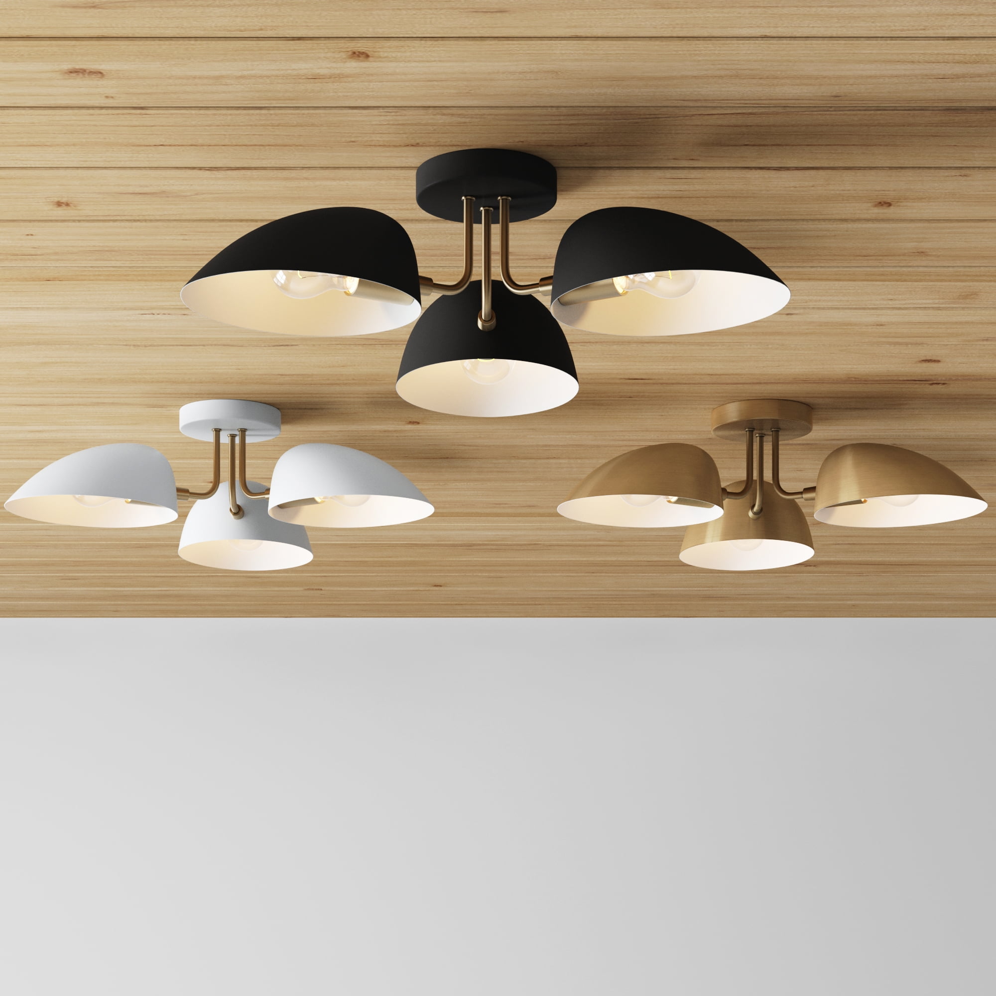 Nathan James Argo Semi Mount Flush Ceiling Light, 3-Lights Modern Retro Lighting with Black Rounded Shades for Hallway, Dining Room and Bedroom, Vintaged Brass