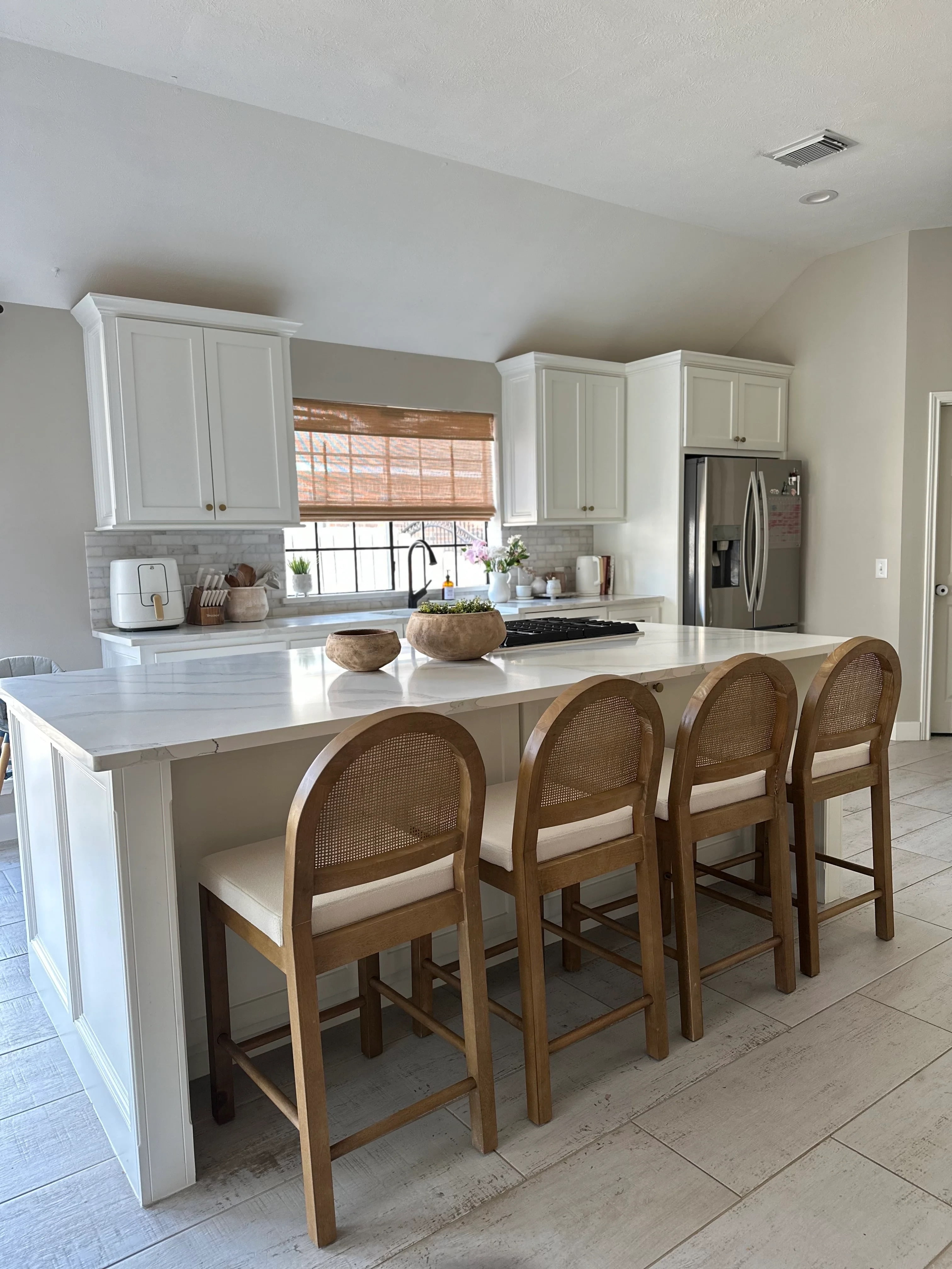 Our rattan bar stool, Bailey, is the perfect addition to your bohemian kitchen space. The upholstered seat is the perfect height for your kitchen island, and is generously cushioned with natural textured linen weave for your comfort. The contrast between the bright boucle upholstery and brown frame gives it a classic feel that will blend with many color palettes. Bailey also features a beautiful 15″” backrest with its natural rattan accent weaves a basket-like look on a charming curved silhouette. Nathan James is the furniture company built for this generation. You don’t need to spend a fortune to get quality design-first furniture, and when we say easy assembly, we mean it. Our guarantee is our word. Your purchase is backed by a 100% money-back guarantee. If you have any quality issues, contact us, and we will send you a replacement immediately—no questions asked. This product is not recommended for commercial use. Materials: – Natural Cane – Boucle Upholstery Fabric – Rubberwood – Plywood – Foam Seat Assembly Must-Haves: – Packaging carton as working surface Weight Limit: – 300 lbs