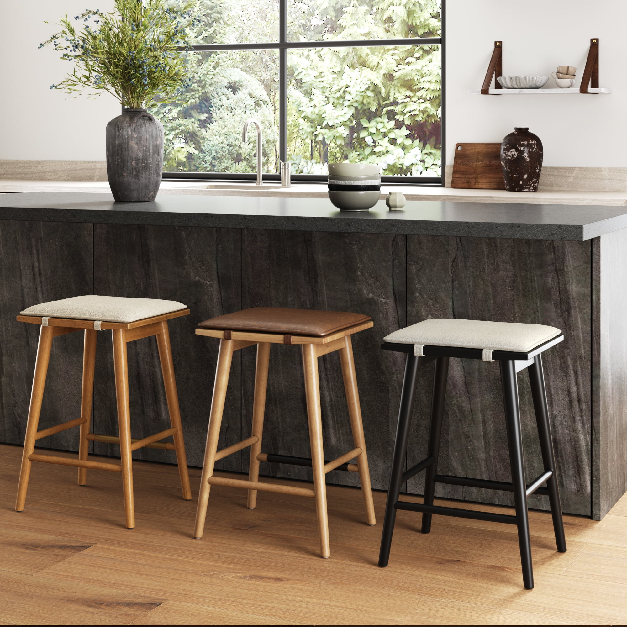 Barker is a classic backless bar stool featuring a padded removable cushion to sit comfortably for hours. The classic mid-century kitchen stool is made of a solid wood frame in brushed finish to match any decor. Ideal 24″ counter-height barstool is perfect to tuck & hide under surfaces such as kitchen islands, work tables, and home bars.