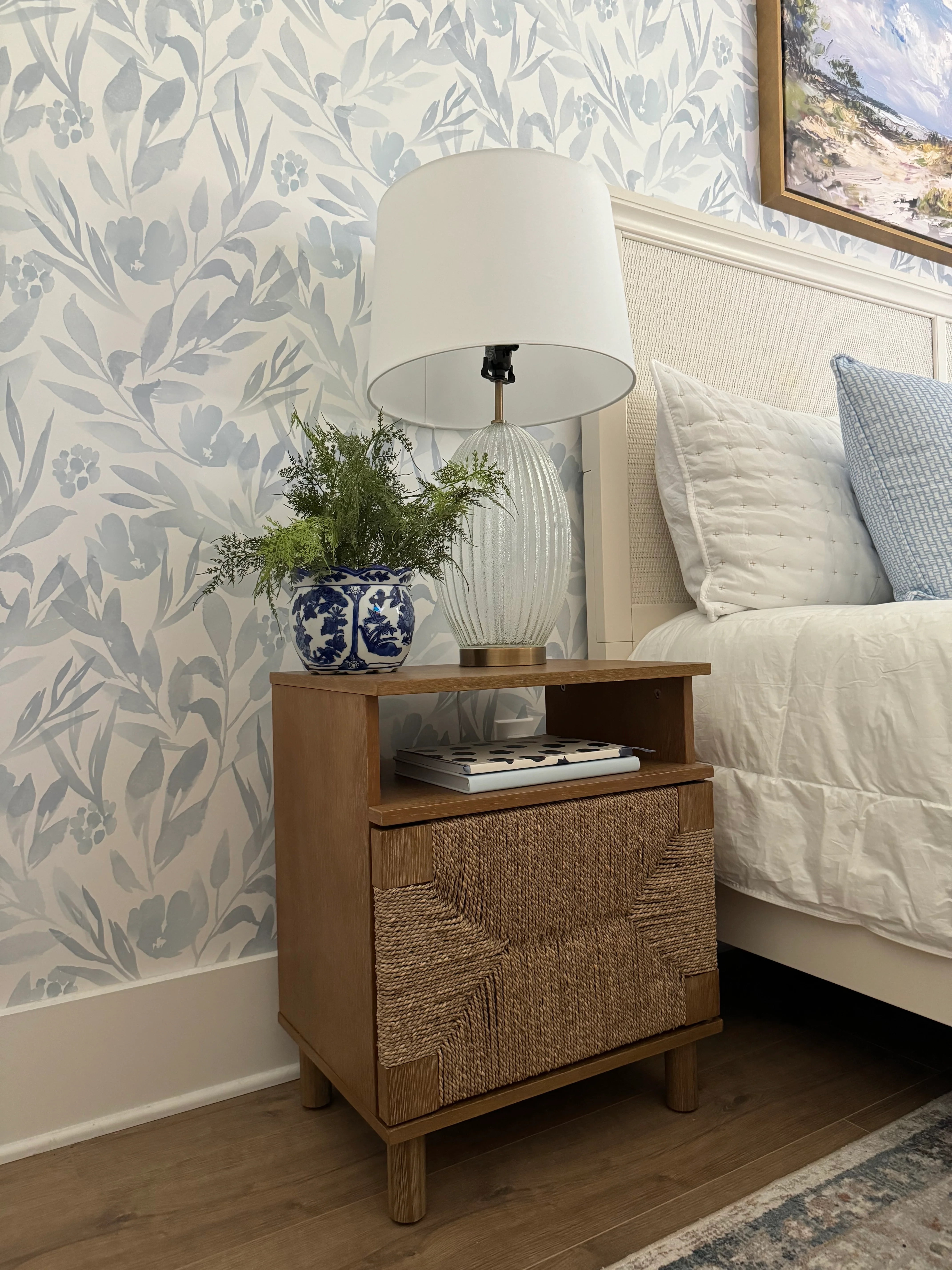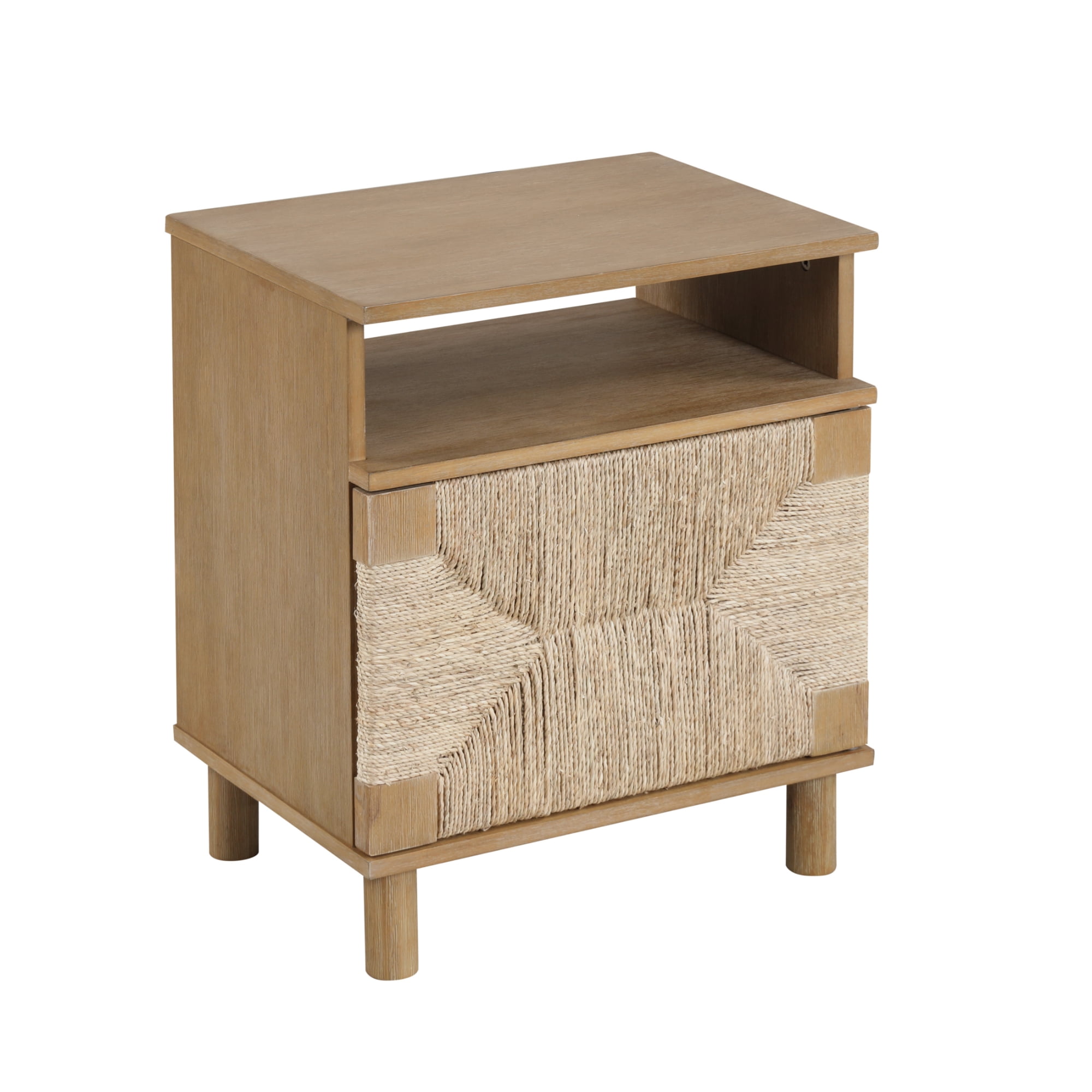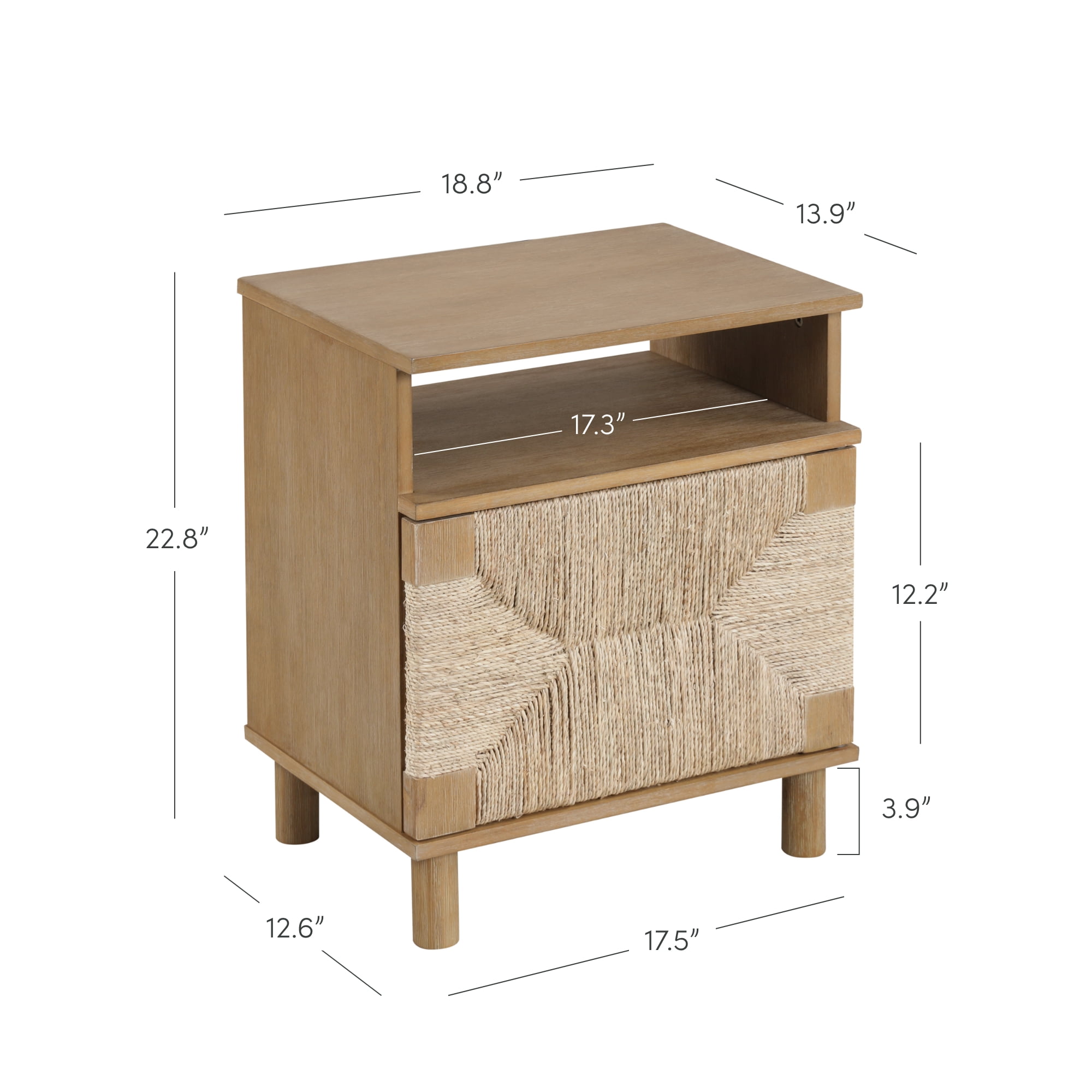 Meet the Beacon seagrass nightstand where eclectic bohemian style meets functionality. This wooden accent table highlights solid wood legs in wire-brushed light brown finish that effortlessly adds a touch of rustic elegance to your bedroom or living room. It also features a solid wood door frame, adorned with natural woven seagrass accent for that boho vibe. Open it up and you have a roomy shelved space for your bedside essentials. We also thoughtfully added an open storage shelf to keep the important stuff within reach at all times. Beacon wood nightstand is as natural as it gets – no exposed hardware as it has a small, cleverly carved handhold detail on the door for quick access. Nathan James is the furniture company built for this generation. You don’t need to spend a fortune to get quality design-first furniture, and when we say easy assembly, we mean it. Our guarantee is our word. Your purchase is backed by a 100% money-back guarantee. If you have any quality issues, contact us, and we will send you a replacement immediately—no questions asked. This product is not recommended for commercial use. Materials: – Wire Brushed Light Brown Rubberwood Legs and Door Frame – Natural Woven Seagrass – MDF – Wood veneer Assembly Must-Haves: – Phillips head screwdriver – Packaging carton as working surface Weight Limit: – Table top: 50 lbs – Open cubby: 20 lbs – Top inner shelf: 20 lbs – Bottom inner shelf: 20 lbs
