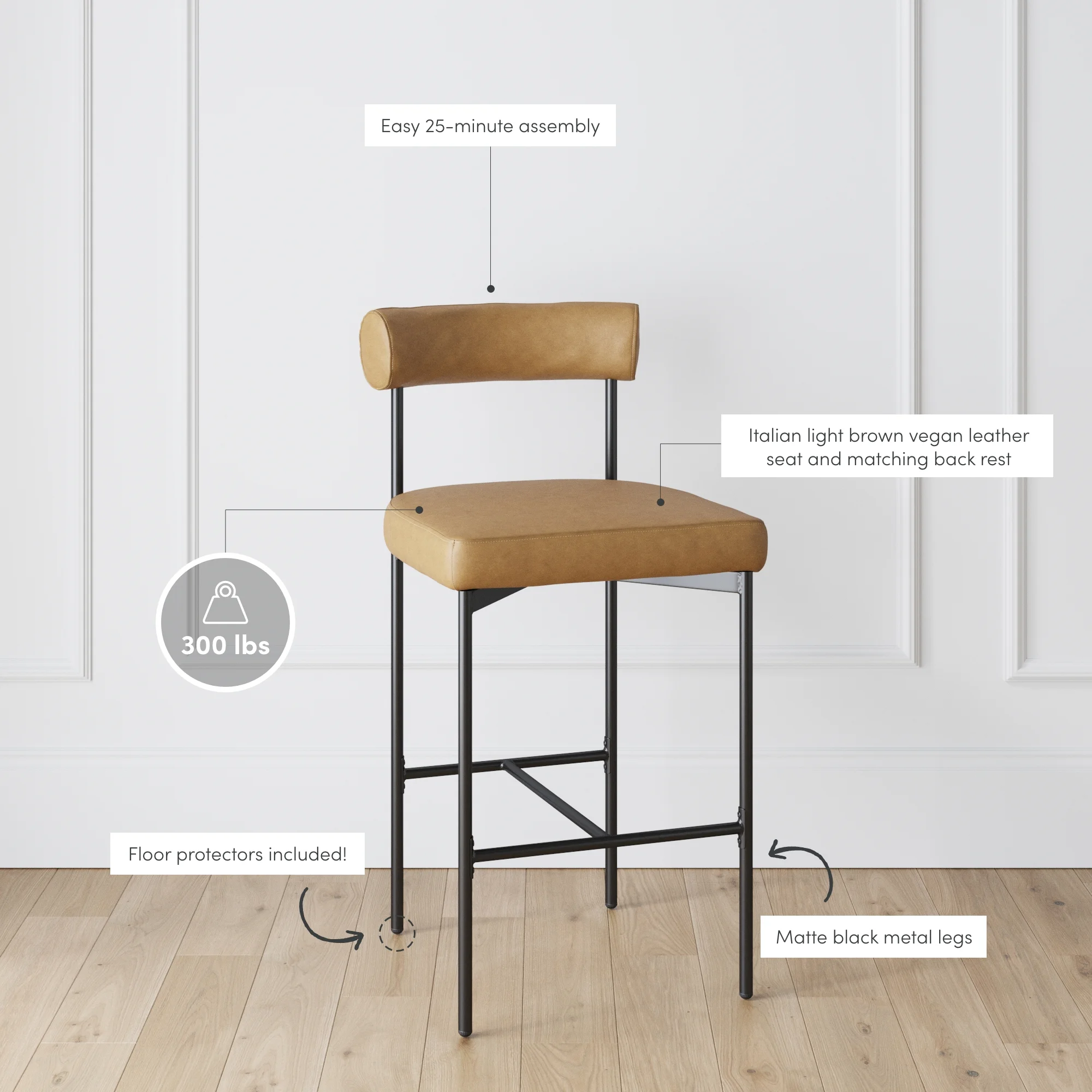 Dahlia kitchen barstool has comfortable cushions seats and backs covered in Italian vegan leather that’ll ensure you sit comfortably for extended periods of time. This 36 inch bar stool has sleek design thanks to a sturdy black matte metal frame. This mid-century modern design will seamlessly blend in with a lot of decor styles while drawing attention with its bold yet slim lines.