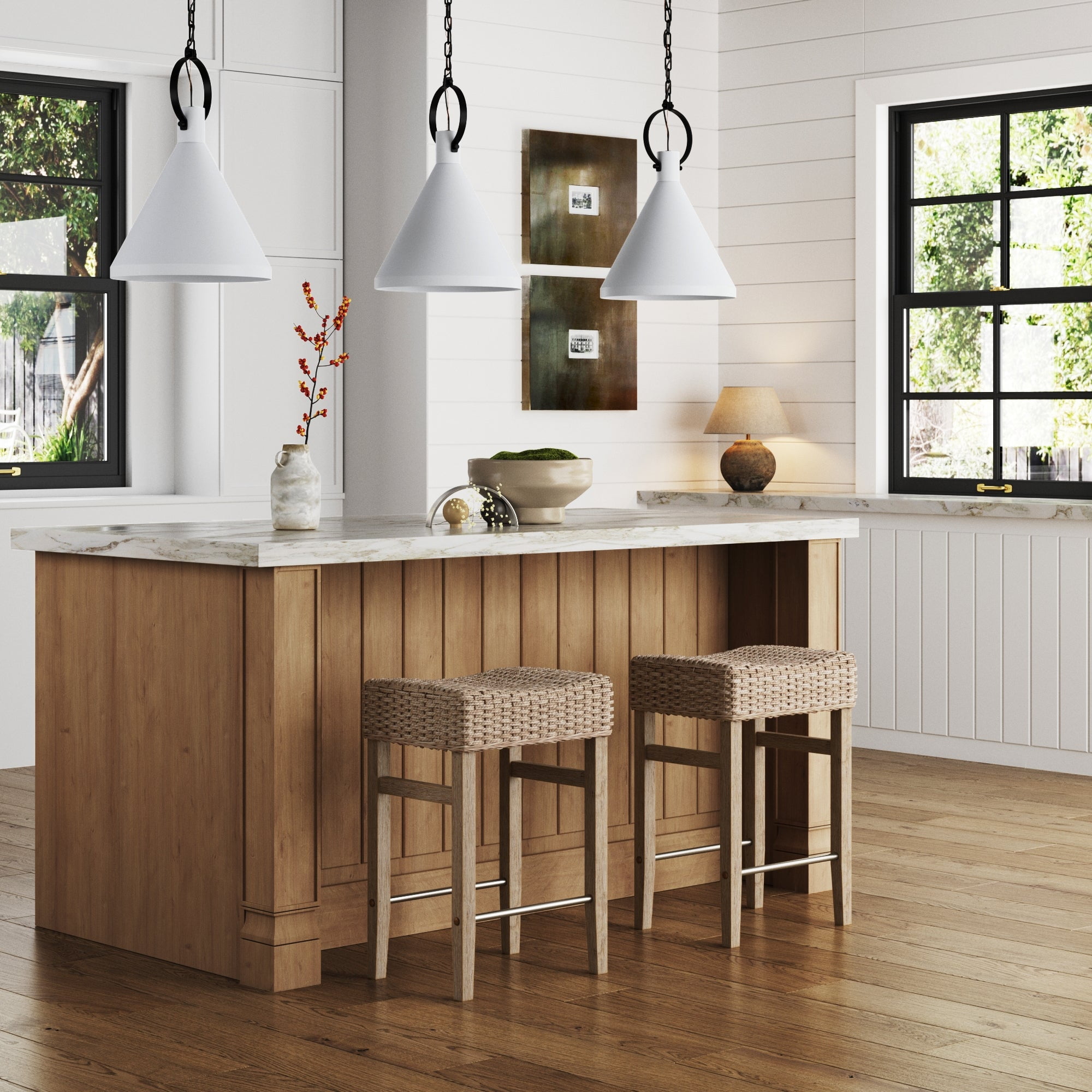 Add a bohemian flair to your kitchen and home bar with the Harvey counter height stool! This chic and cozy upholstered stool combines modern aesthetics with coastal appeal, making it a surefire conversation starter on a casual dining with family and friends. The Harvey upholstered stool has a unique saddle-shaped seat crafted from high-quality woven rattan that beautifully contrasts with its solid wood legs and chrome-polished metal foot rests. The mixed materials add a touch of sophisticated beauty but also ensures comfort and durability, giving you a sturdy and stylish seating solution for your morning coffee, when you have guests over, or when you simple want to unwind after a long day of work. The Harvey bar stool’s thoughtful design is sure to give an effortlessly stylish and comfortable seating experience. Nathan James is the furniture company built for this generation. You don’t need to spend a fortune to get quality design-first furniture and when we say easy assembly, we mean it. Our guarantee is our word. Your purchase is backed by a 100% money-back guarantee. If you have any quality issues just contact us and we will send you a replacement immediately, no questions asked. This product is not recommended for commercial use Materials: – Natural Woven Seagrass Seat – Solid Rubberwood Legs – Polished Chrome Metal Foot Rests Assembly Must-Haves: – Scissors – Phillips screwdriver – Electric screwdriver or drill (optional) Weight Limit: 250 lbs.