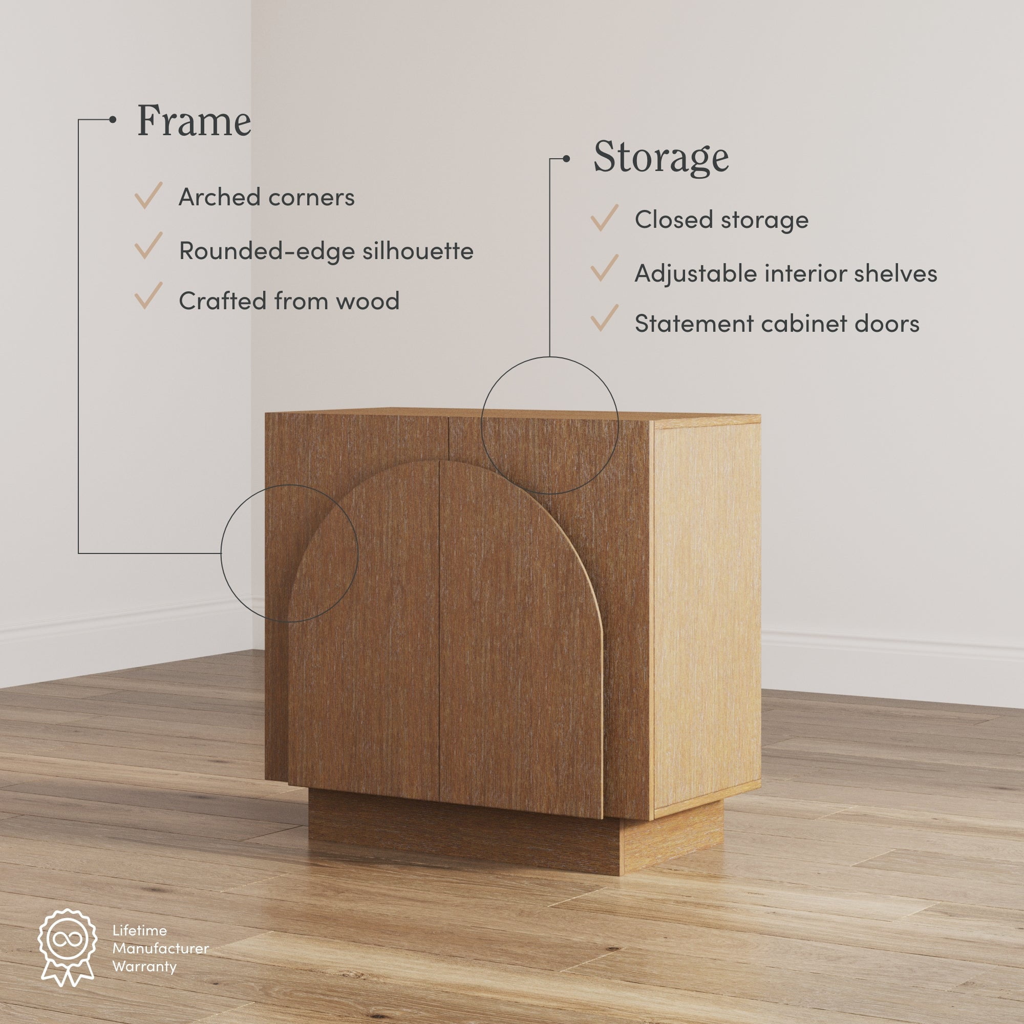Introducing Iris, an exquisite storage cabinet with a blend of design and practicality. Iris features arched corners and rounded-edge silhouette, creating a sophisticated focal point in your living space. Beyond the aesthetics, this wooden accent cabinet is a treasure trove of storage solutions. Discover ample storage space to stow away your essentials, and adjust the interior shelf to accommodate up to 30 lbs of weight, depending on your needs. The Iris sideboard is crafted from high-quality wood, thus brings natural warmth to your home, while also making each one a unique piece due to the natural wood grain. Nathan James is the furniture company built for this generation. You don’t need to spend a fortune to get quality design-first furniture and when we say easy assembly, we mean it. Our guarantee is our word. Your purchase is backed by a 100% money-back guarantee. If you have any quality issues just contact us and we will send you a replacement immediately—no questions asked. This product is not recommended for commercial use. Materials: – Rubberwood – Wood Veneer – MDF – Particleboard Assembly Must-Haves: – Scissors – Phillips-head screwdriver – Drill – 1/4″ Drill Bit Weight Limit: – Top: 70 lbs – Interior adjustable shelf: 30 lbs – Interior bottom shelf: 50 lbs