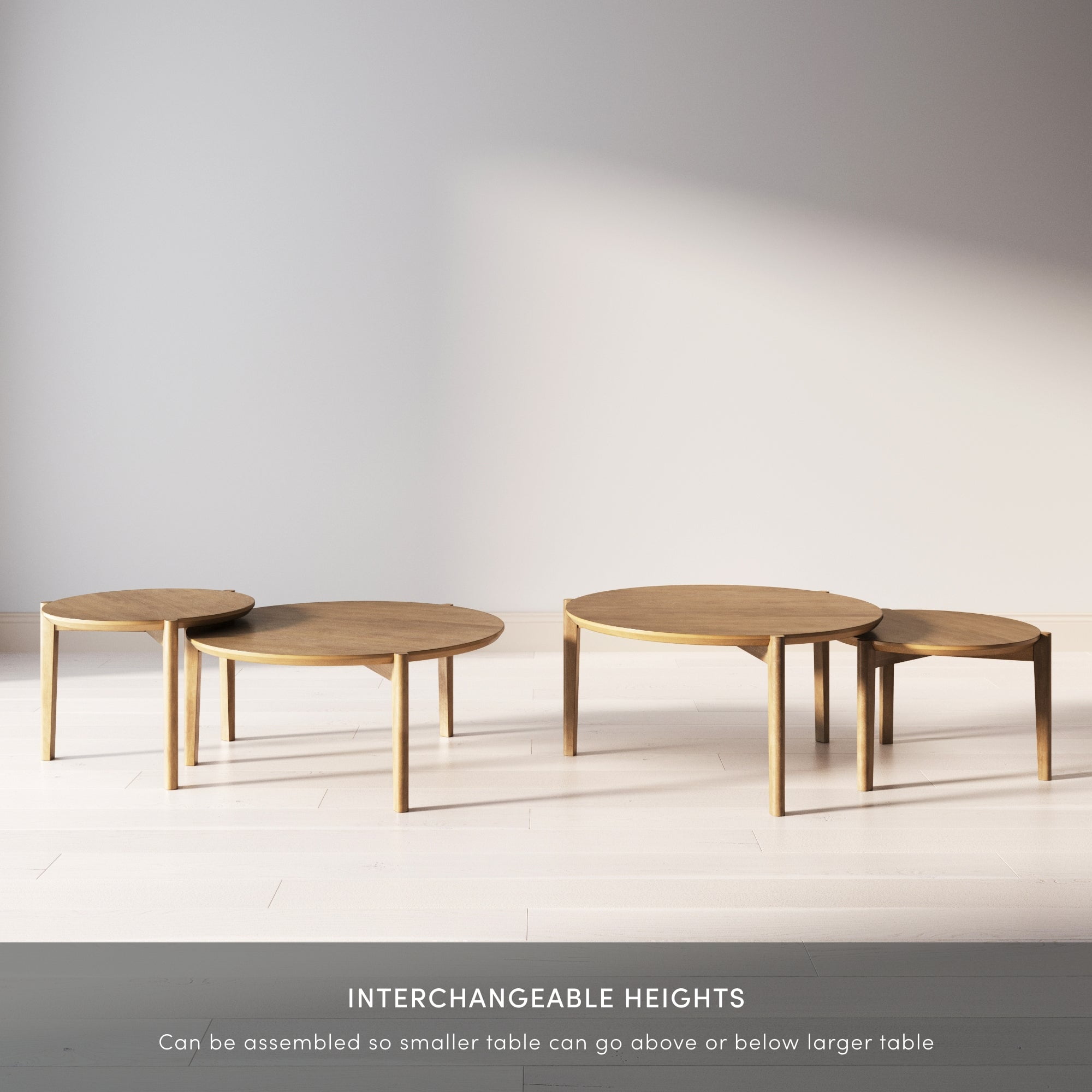 Kendall is a wooden round coffee table with wire-brushed finish for that mid-century modern look. This nesting coffee table features clean, tapered legs made from rubberwood. The wire-brushed finish and light brown color makes it perfect for your contemporary or farmhouse-style home. The set includes a smaller table and a larger one with interchangeable heights. Place the smaller piece under or over the larger table to create a dynamic and functional piece in your living room. You can also use them as separate living room tables. Kendall includes floor protectors — no need to worry about scratching your wooden floors or ruining your rugs. Easy 20-minute assembly