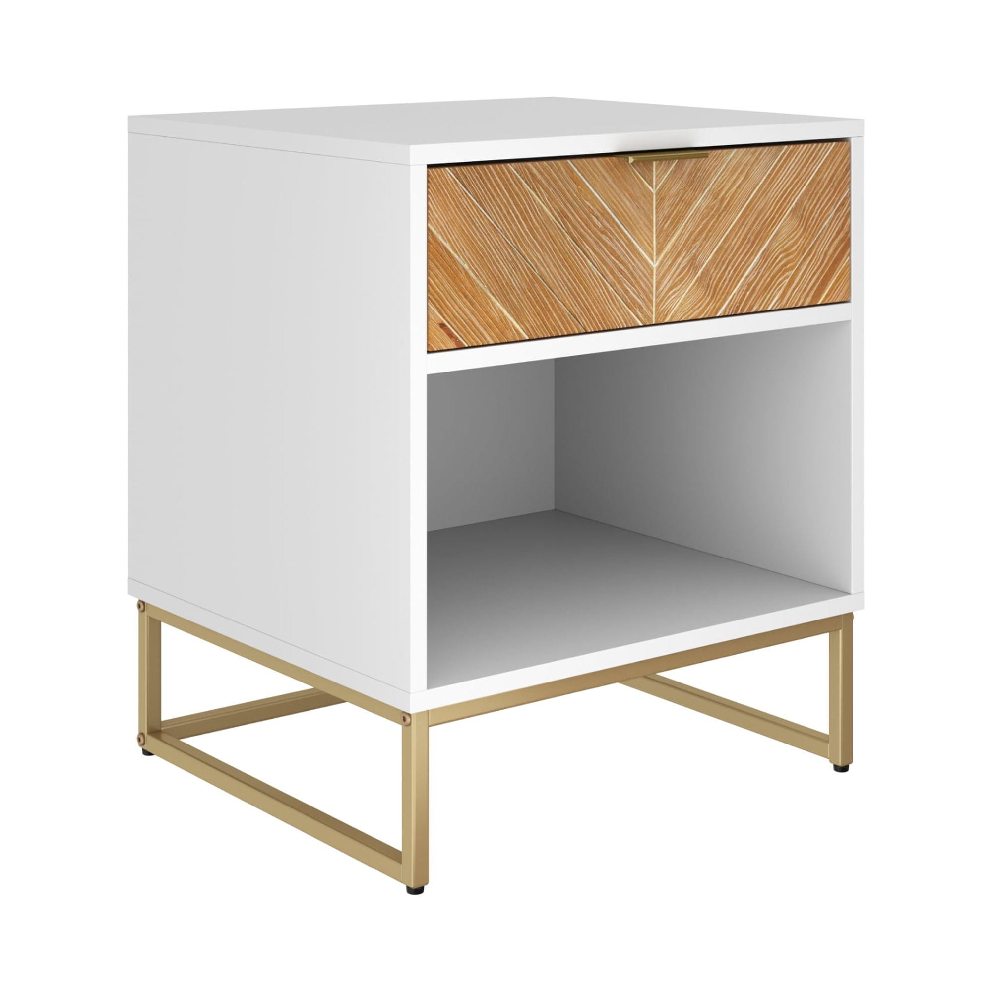 Nathan James Kensi White Nightstand Gold Metal Base with Open Cubby for Storage and Drawer