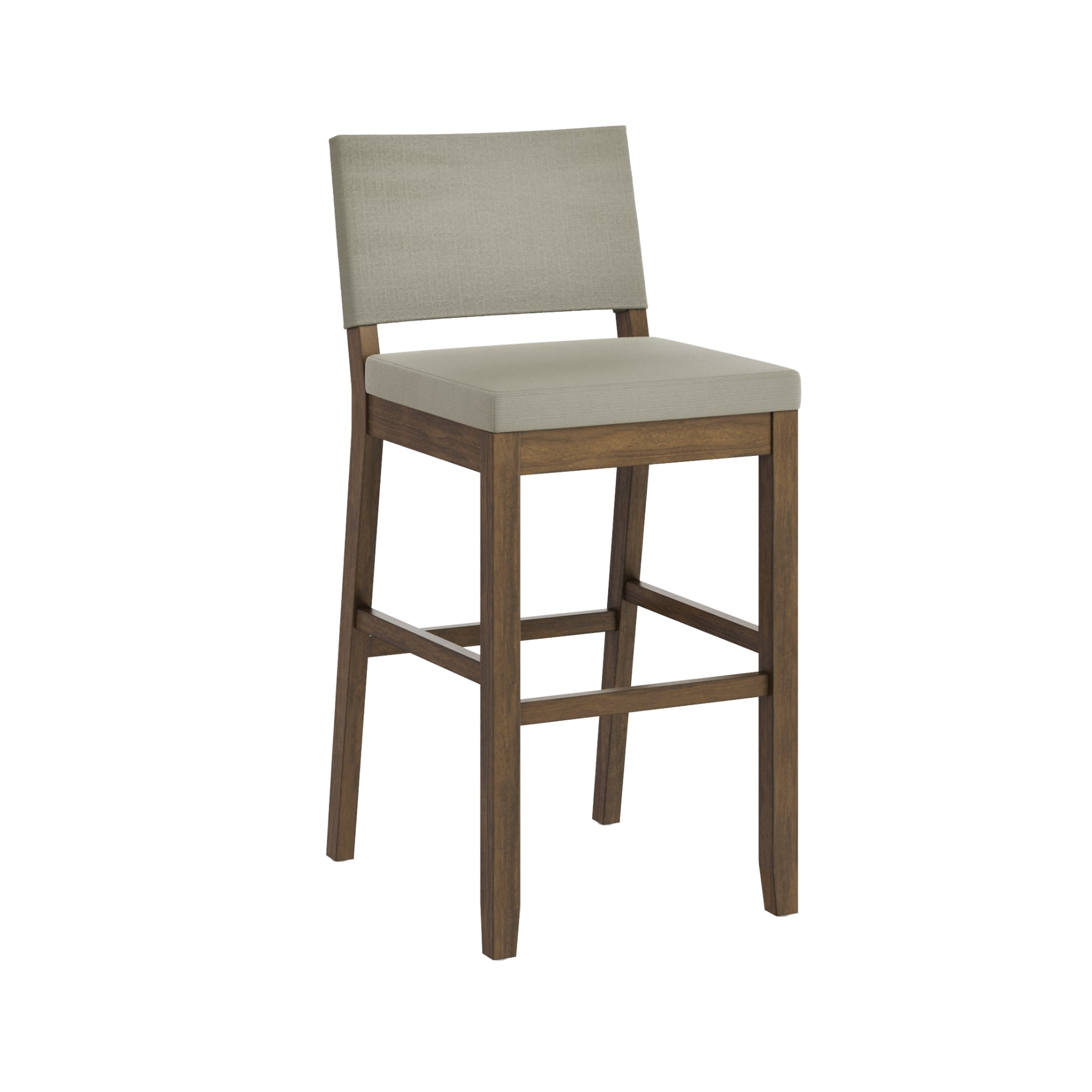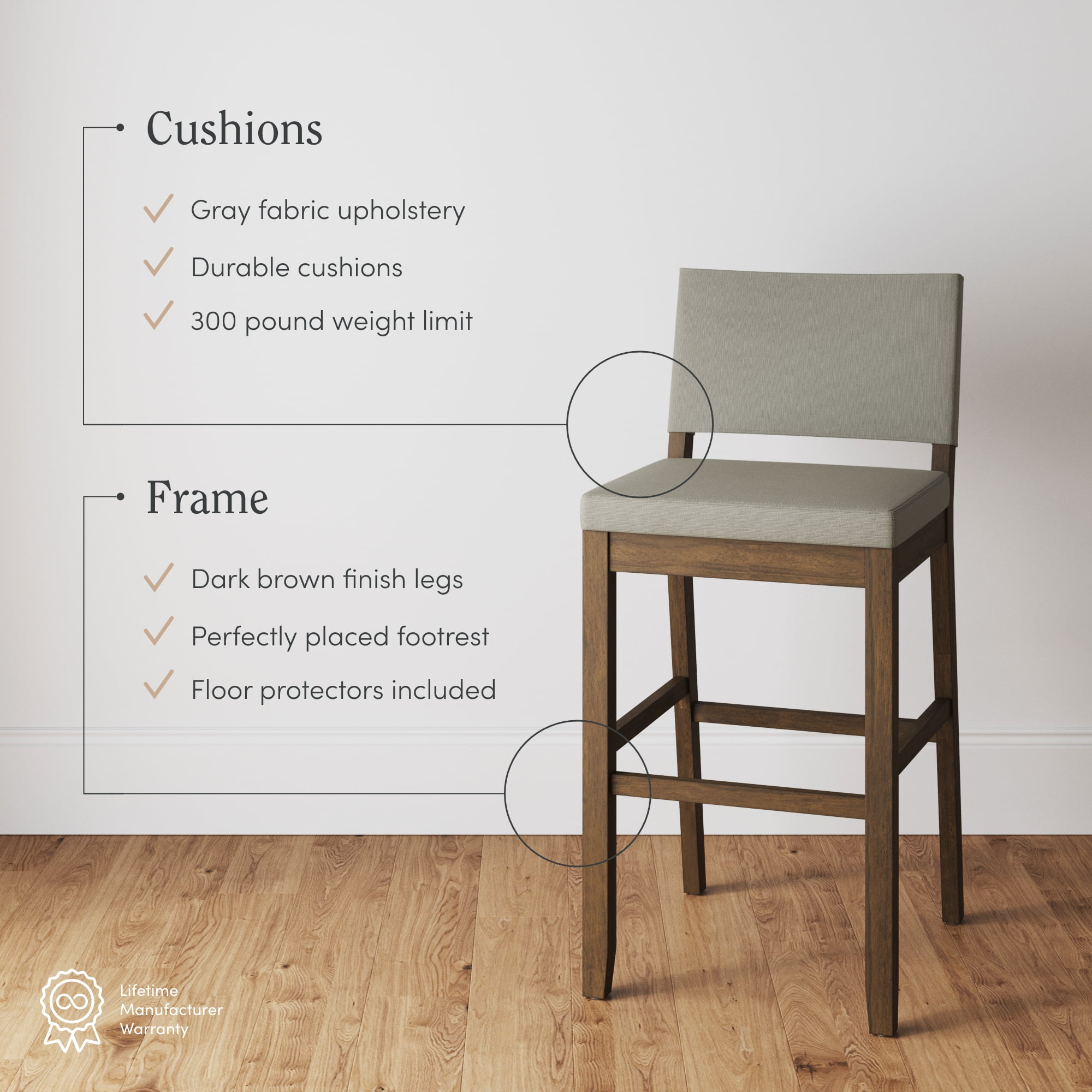 Nathan James Linus Bar Stool, Light Gray/Dark Brown Modern farmhouse design with a comfortable cushioned seat Constructed with solid wire-brushed rubberwood legs for durability High-quality polyester fabric upholstery for a stylish look; Thick, durable cushion ensures comfort for extended sitting Neutral color blends seamlessly with various decor styles; Built-in footrest for added comfort while enjoying snacks Easy assembly in just 15 minutes; Weight limit of 300 lbs, suitable for everyday use