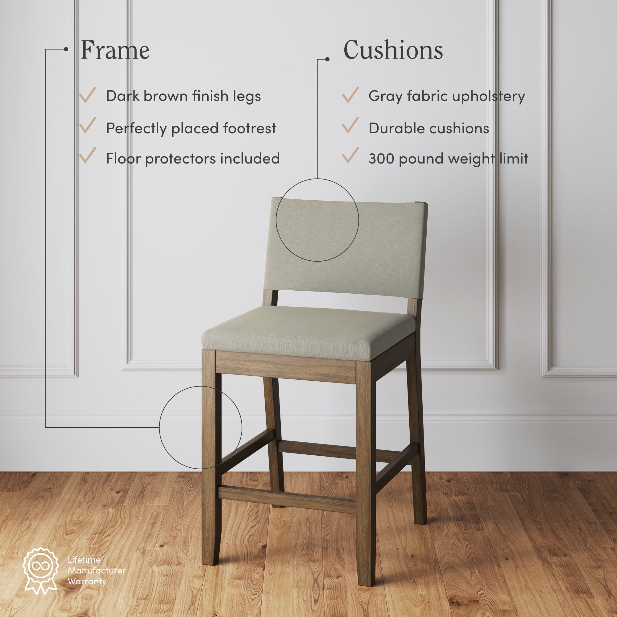Nathan James Linus Modern Upholstered Counter Height Bar Stool with Back and Solid Rubberwood Legs in a Wire-Brushed BrownFinish, Light Grey/Brown