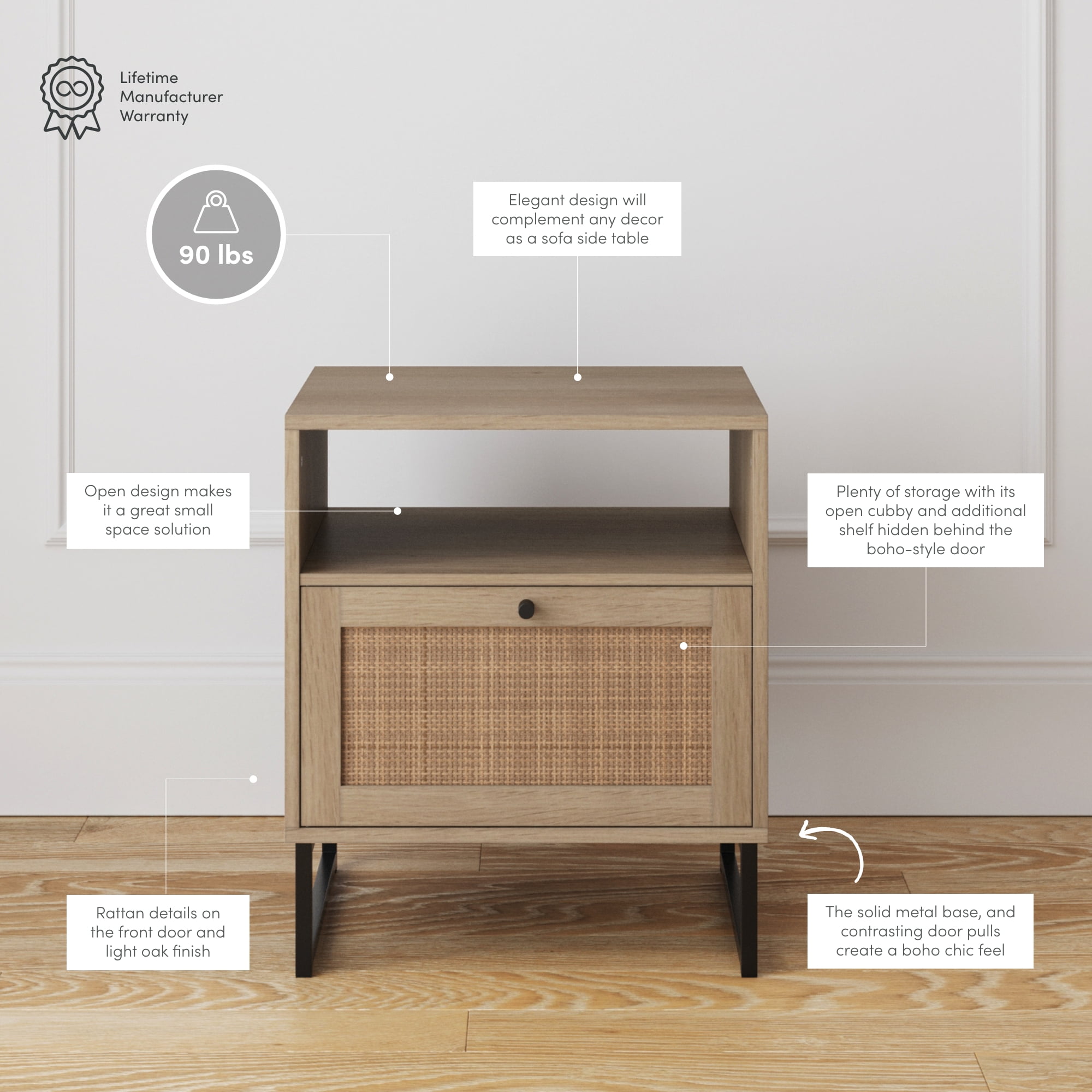 The Mina side or end table is small but offers plenty of storage with its open cubby and additional shelf hidden behind the boho-style door. The open design of the Mina side table makes it a great small space solution. Lifetime manufacturer warranty: try for 100 days. Easy 40-minute assembly. Mina’s simple yet elegant design will complement any decor as a sofa side table or nightstand and add the matching Mina TV Stand to your living room. Length: 19″ x Width: 17″ x Height: 22″ accent table.