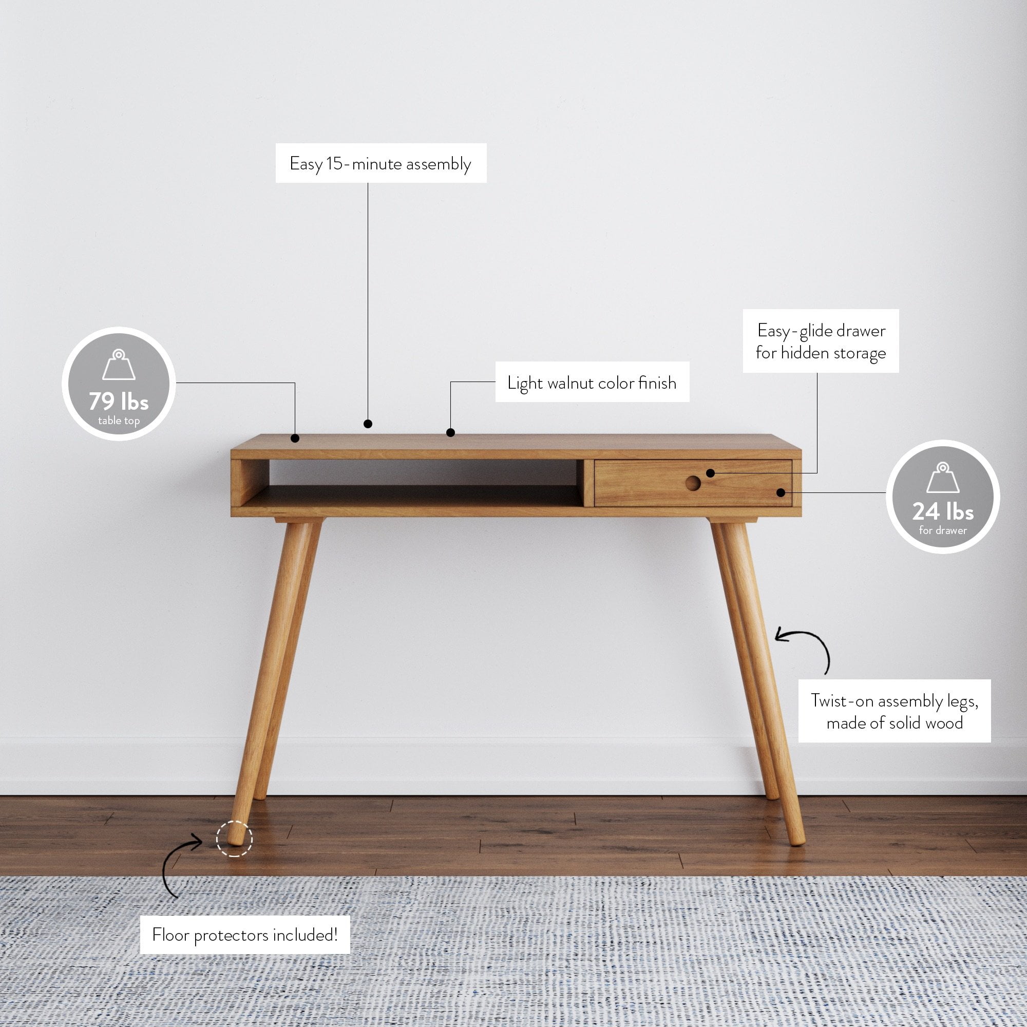 Parker is a mid-century home office desk or a small writing desk. It is crafted from MDF table top and solid wood round tapered twist-in legs with a finished back panel that allows you to place in a command position in any room for Feng Shui. Parker has an open storage cubby and closed drawer, allowing plenty of room to tuck away a laptop at the end of the day, store magazines, or hide odds and ends. Nathan James is the furniture company built for this generation. You don’t need to spend a fortune to get quality design-first furniture and when we say easy assembly, we mean it. Our guarantee is our word. Your purchase is backed by a 100% money-back guarantee. If you have any quality issues just contact us and we will send you a replacement immediately, no questions asked. This product is not recommended for commercial use