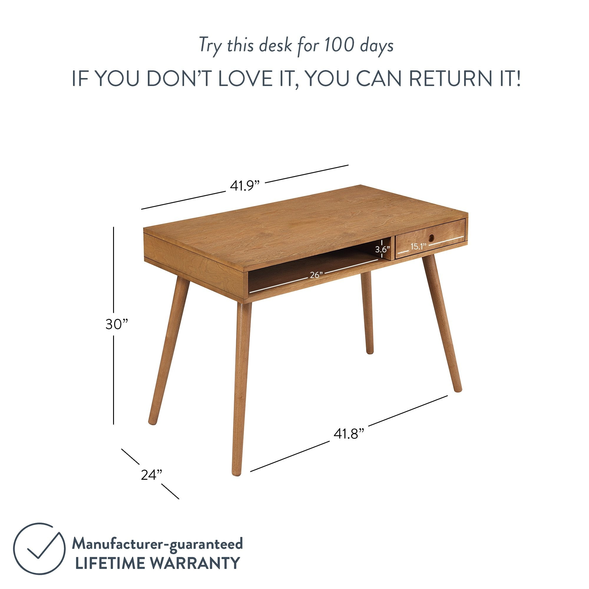 Parker is a small home office desk made of MDF table top and solid rubberwood legs in an Acacia or light walnut finish with sleek lines front to back, allowing you to position in just the right spot. Length: 42” x Width: 24” x Height: 30” modern home office desk. Lifetime manufacturer warranty: try for 90 days. This small wooden computer desk has an open cubby and closed drawer for your storage needs. The Parker desk has an easy 15-minute assembly with twist-in-leg construction that will have you working from home in no time. This minimalist style desk with round tapered legs gives a modern twist with Scandinavian flair that will demand attention in any room.