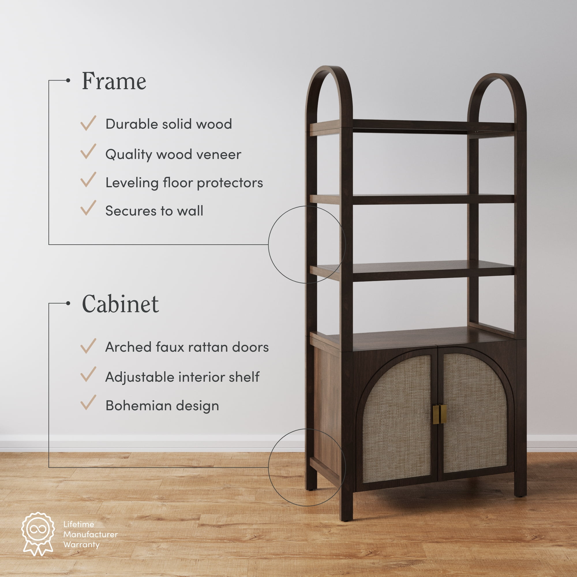 Paxton is a bohemian style bookshelf with cabinet base featuring its beautiful arched cabinet doors and solid wood frame. It features a 3-tier shelf paired with an enclosed storage to store your favorite books, decor, and other essentials. This bookcase cabinet highlights its unique arched frame and faux rattan door details for that unique and warm vibe. The cabinet base has adjustable interior shelves to match your storage needs.