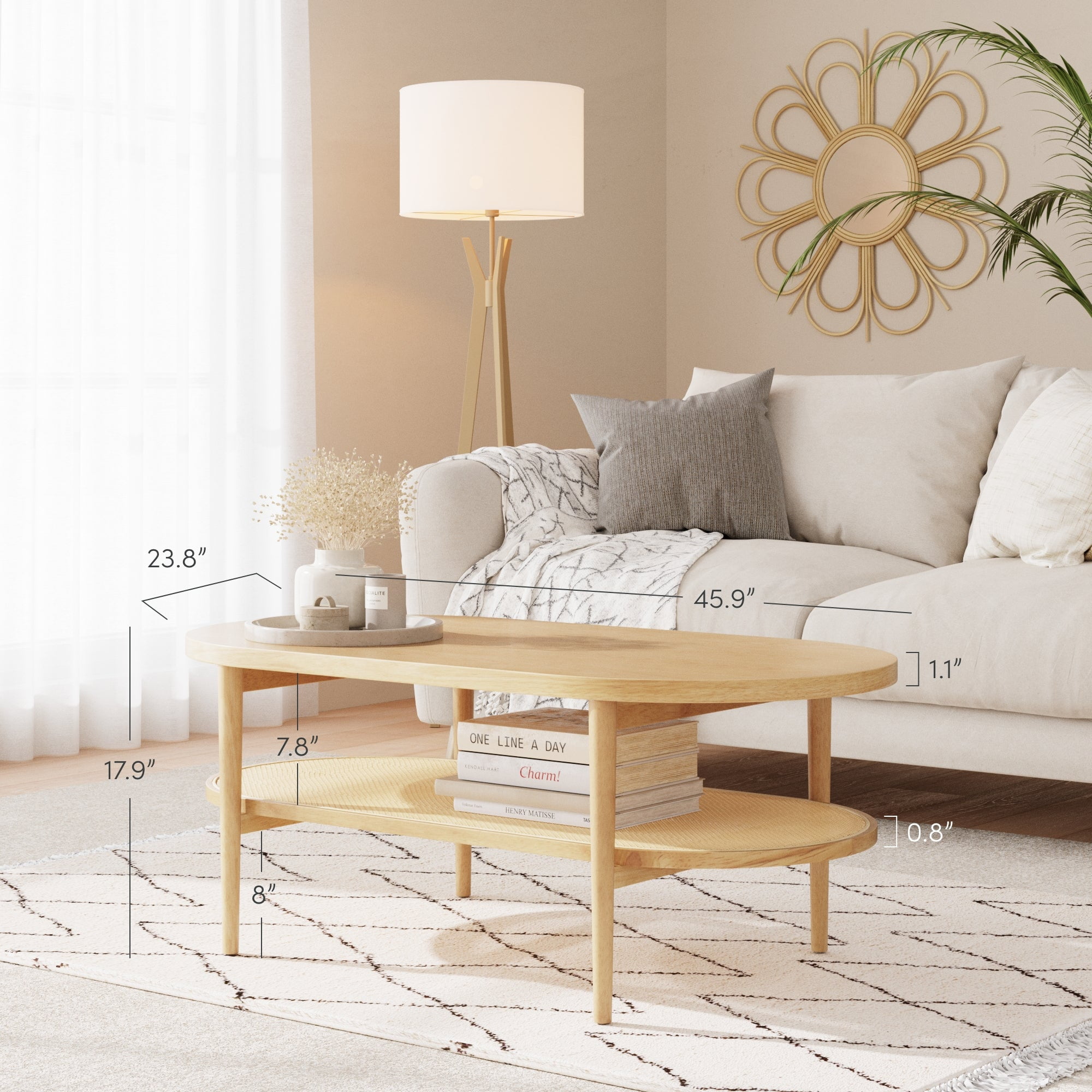 Sonia is a light wood living room table with tapered legs and pill shaped design for that classic yet modern style. This modern coffee table offers spacious table top plus a sturdy bottom tier for extra storage. The boho coffee table has rounded wood details and rattan accents, giving it a high-end feel while complementing almost any home decor style. Dress up your living room with this mid-century coffee table and complete the boho-rustic look with its matching side table! Easy 20-minute assembly and lifetime manufacturer warranty: try for 100 days.