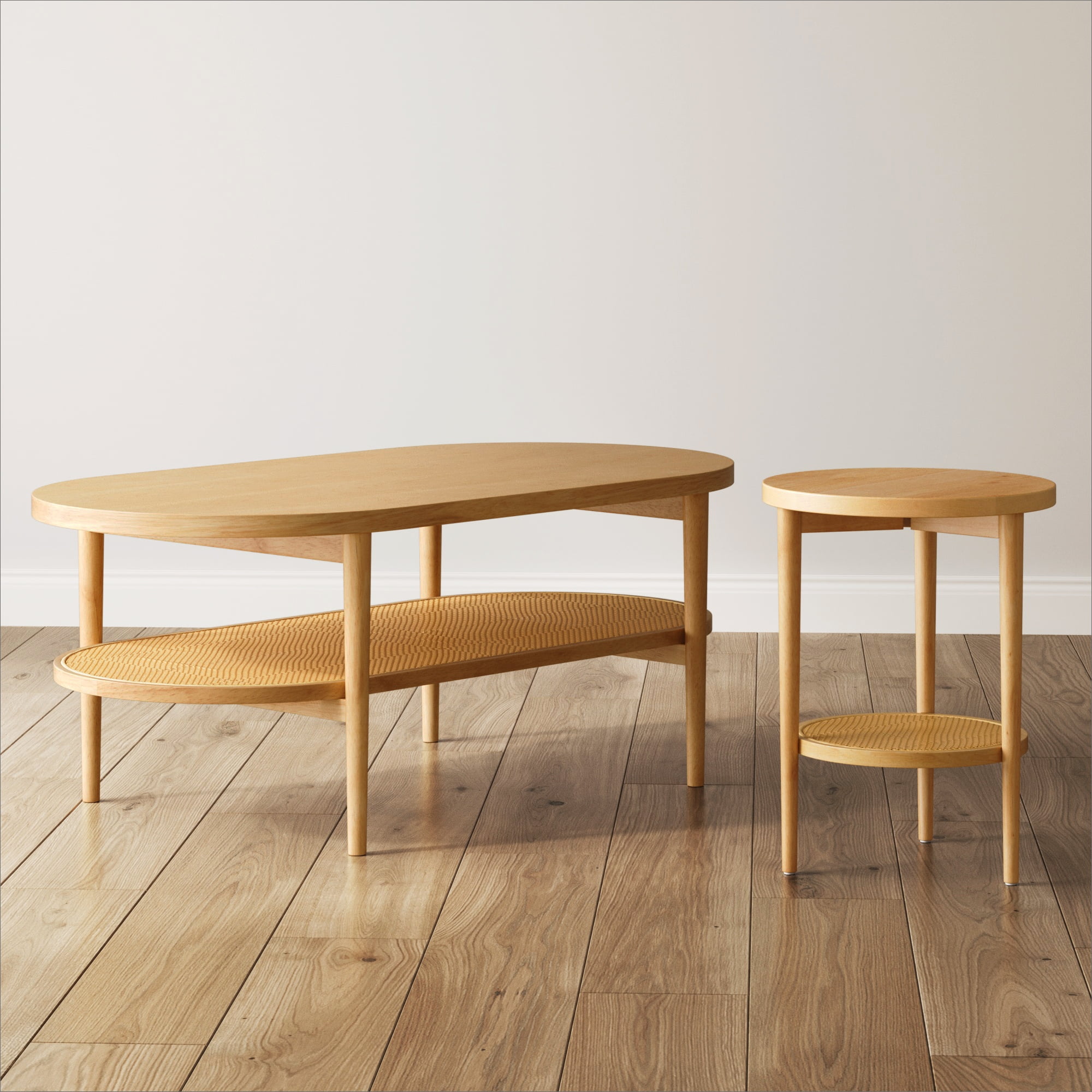Sonia is a light wood side table with tapered legs and pill shaped design for that classic yet modern style. This round accent table offers spacious table top plus a sturdy bottom tier for extra storage. The boho end table has rounded wooden details and rattan accents, giving it a high-end feel while complementing almost any home decor style.