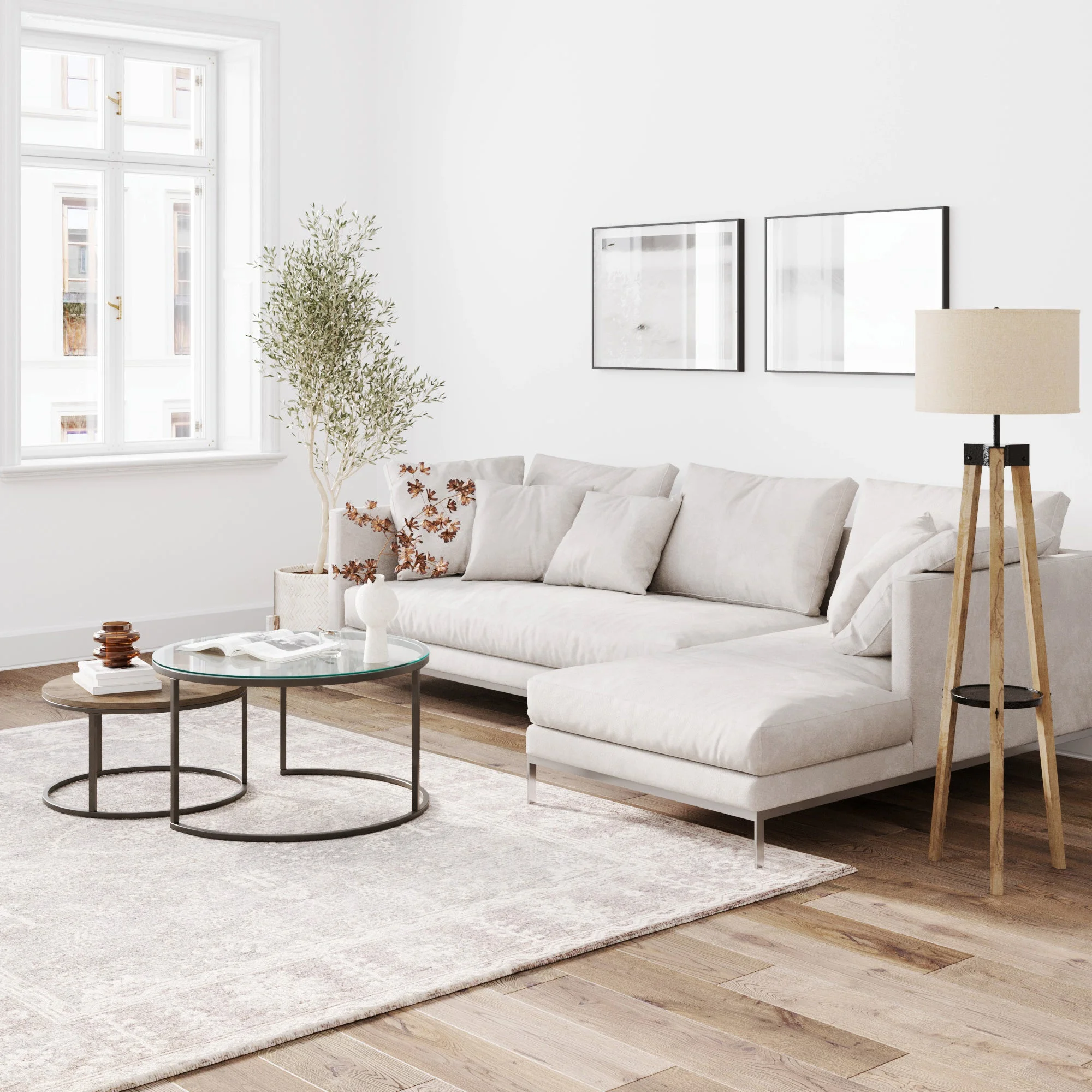 Nathan James Stella Modern Round Metal/Wood/Glass Coffee Tables, Rustic Oak/Black Unique set of two round nesting tables designed for modern space-saving in your living room Luxurious accent piece with a tempered glass tabletop on the taller table and a rustic oak finish on the smaller table Sturdy design featuring a powder-coated black matte metal base for a clean and minimal aesthetic Versatile design allows for flexible arrangement, with the smaller table nesting inside the larger one or used separately Perfect for adding additional tabletop space while maintaining a sleek, contemporary look