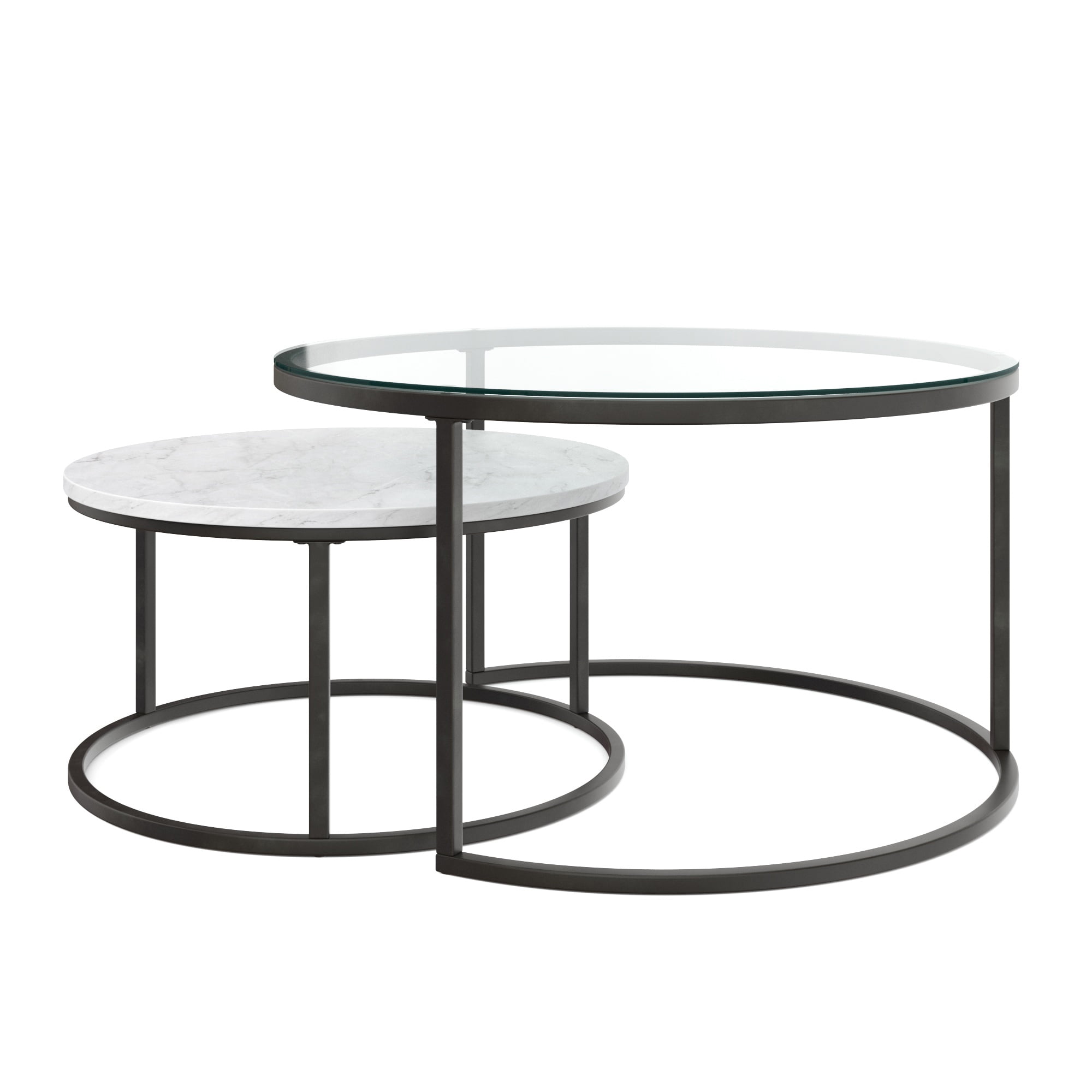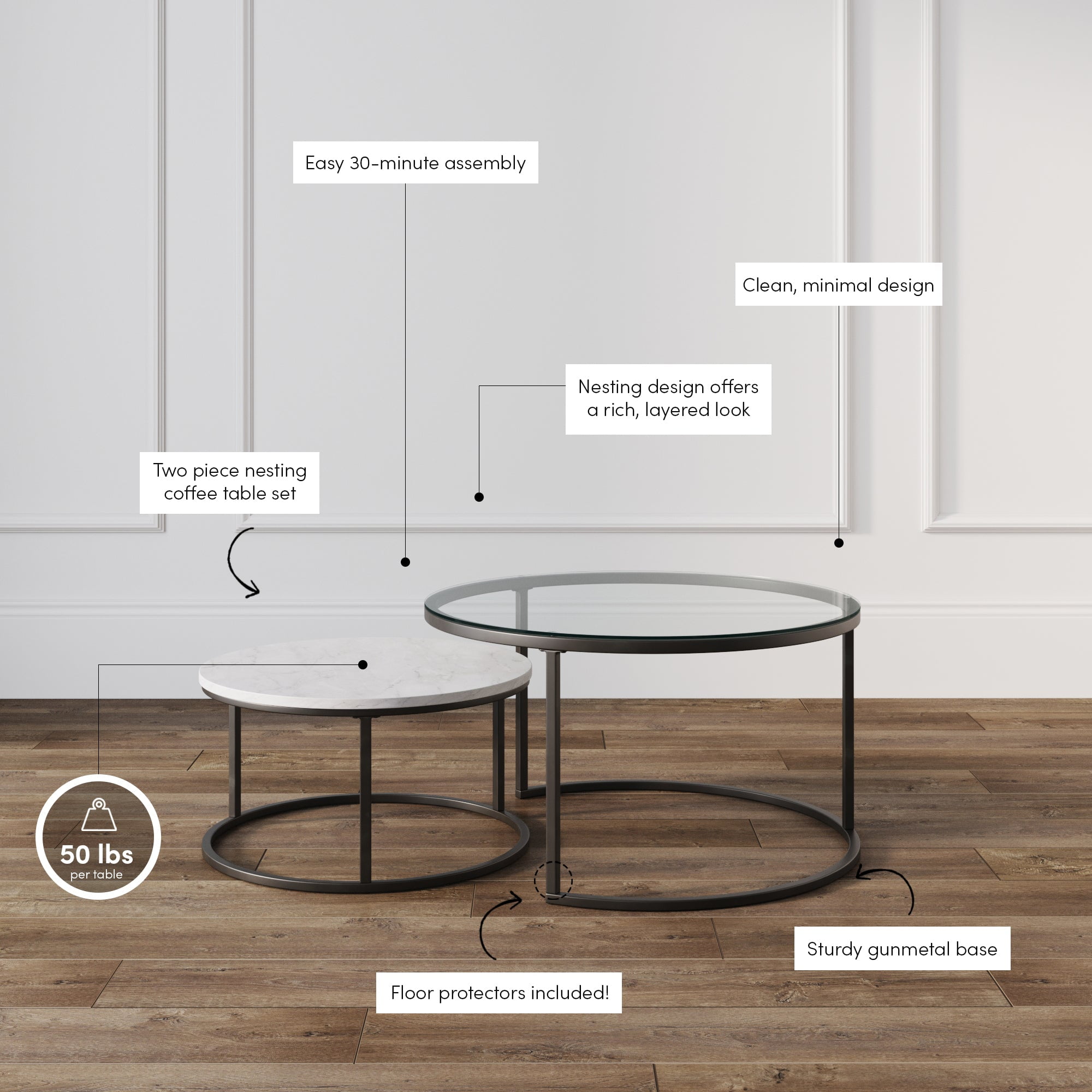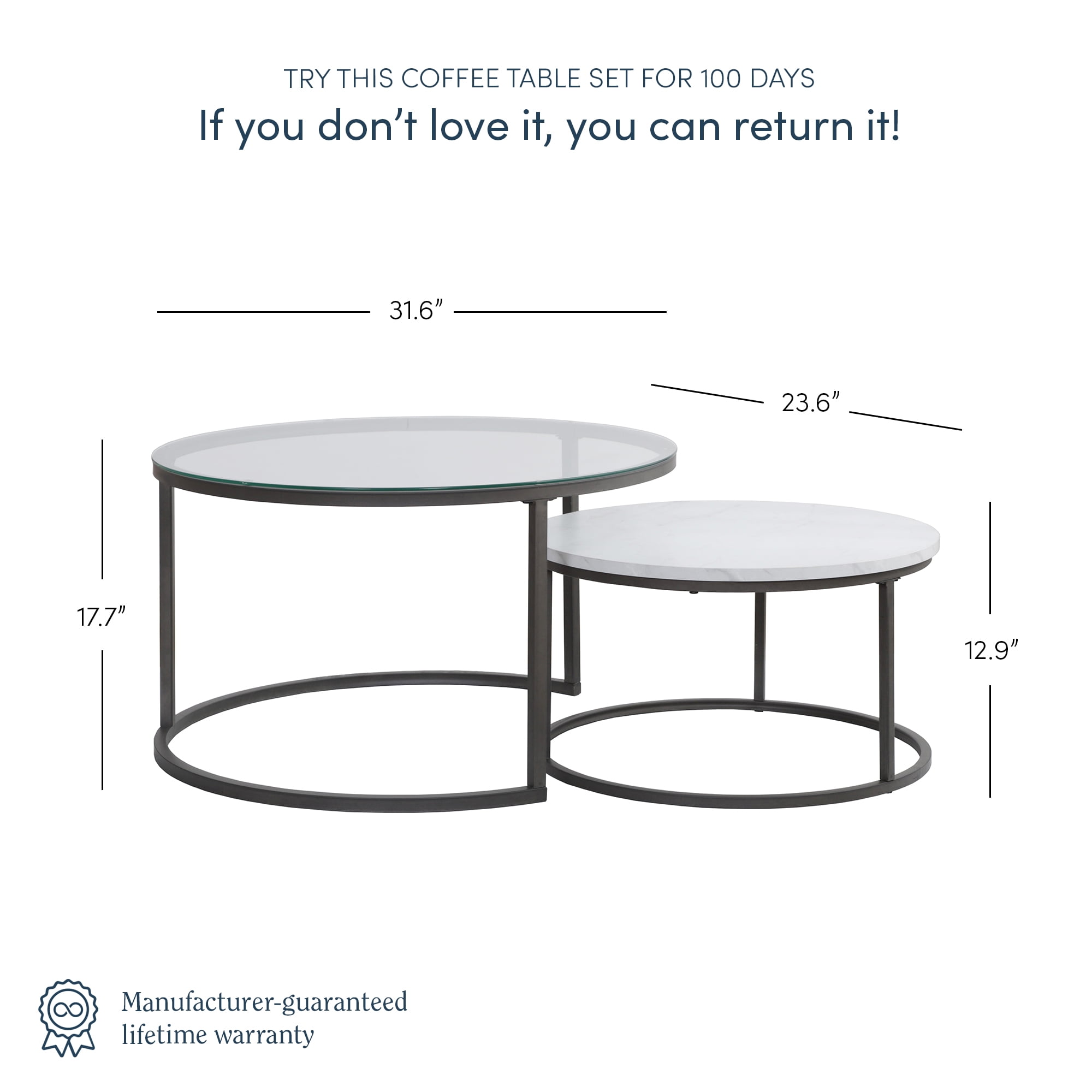 Nathan James Stella Round Nesting Coffee Table Set of 2 Glass, Marble Finish and Metal Frame, Marble/Glass/Black