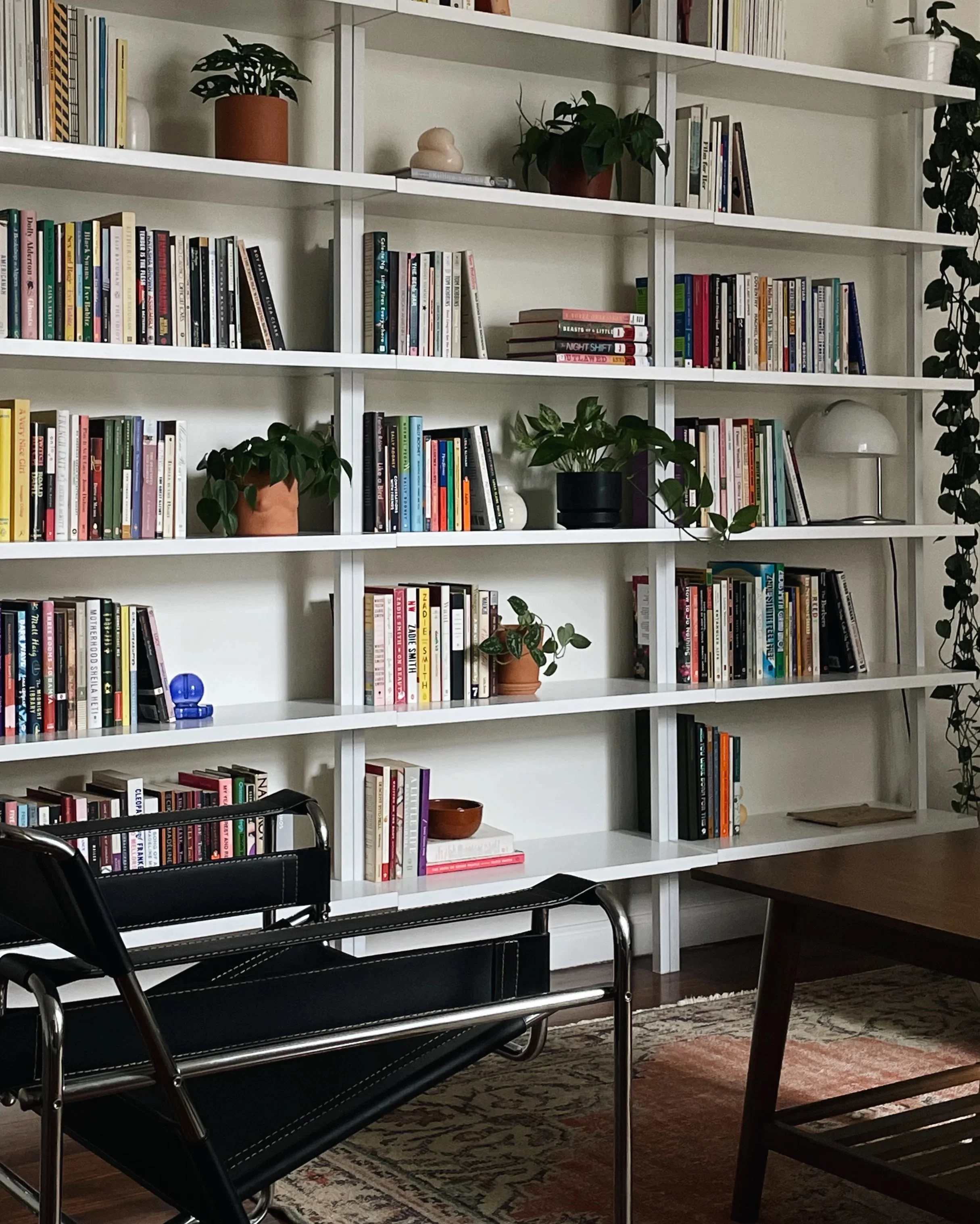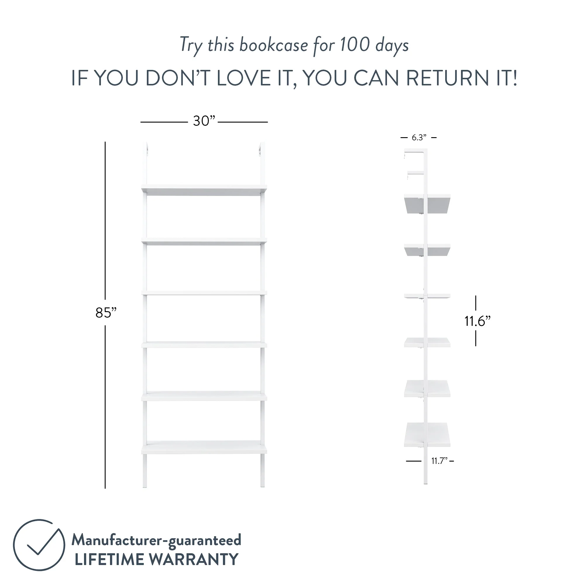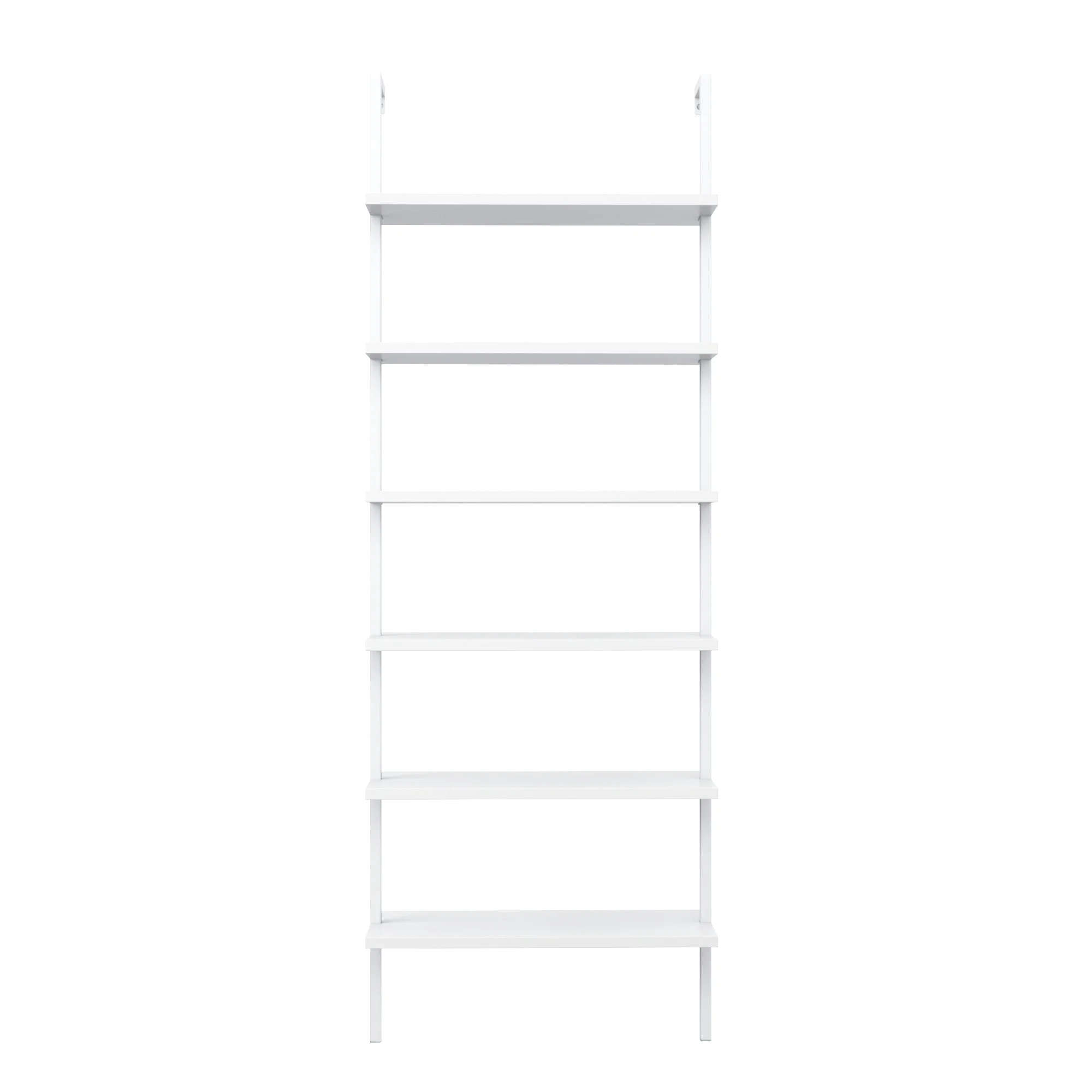 This 6-tier tall, modern wall mount bookcase or shelving wall unit for shelving up any space with its industrial and modern style of white wood and metal. With wider shelves, this tall ladder bookshelf offers substantial storage with open shelves to display decor, collectibles, or books. Has a sleek and space-saving style with open shelves you can use for your home office, kitchen, or living room. Create the perfect space thanks to the modular design of Theo’s 6-shelf wood and metal ladder etagere bookcase by lining several bookcases up together on a wall. The Theo Tall Bookshelf, with its sturdy metal wall-mounted frame, has an easy 40-minute assembly. Lifetime manufacturer warranty: try for 100 days.