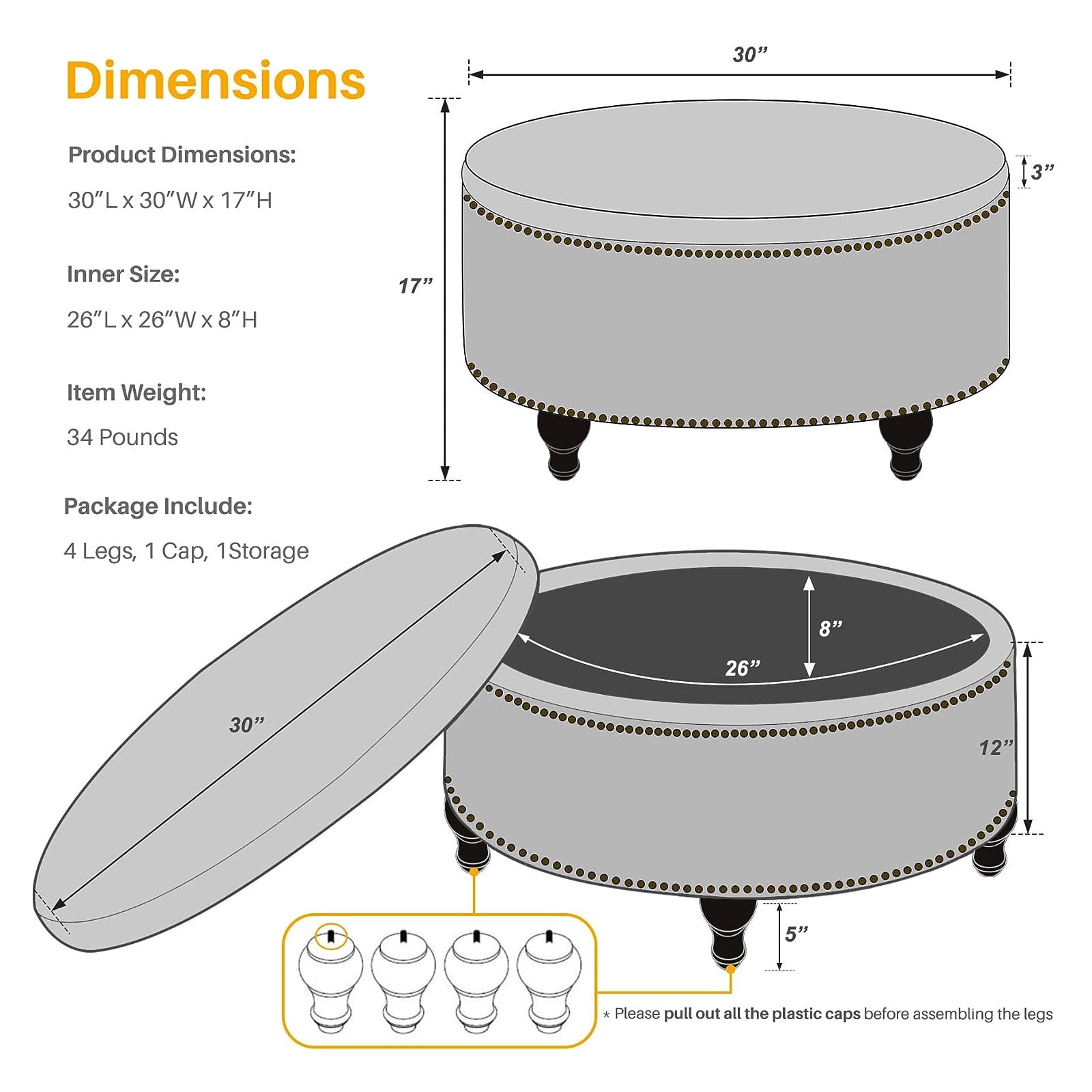 ★★ The top of soft, breathable, and elastic cushion, suitable for the sitting design of the human. ★★ Round design & nailhead trim, enhance your room and bring a touch of luxury to your decor. ★★ Sturdy frame ensures our entryway bench can support the weight of 1-2 adults easily. ★★ Can be placed at the foot of the bed to sit on/dress, storing, providing additional sitting on parties and family gatherings. ★★ Spacious storage area, can store books, magazines, clothes, blankets, shoes, toys or other sundries Specifications: Base Type: Legs Assembly Required: Yes Base Material: Plywood Top Material Type: Linen cloth Fabric Type: Fabric Recommended Uses For Product: Relaxing, Reading Surface Recommendation: Indoor Exquisite Design: The large round storage ottoman features an eye-catching velvet style with a round design and button tufted nailhead trim, perfect for enhancing your room with this great cocktail ottoman, and bringing a touch of luxury to home decor. Large Storage Capacity: The functional flip-open lid reveals a spacious storage area. The ottoman with storage can store books, magazines, clothes, blankets, shoes, toys, or other sundries in the bedroom, living room, hallway or guest room, etc. Stable Construction: The design of the stable plywood feet can better reduce contact with the bottom of the ottoman, reduce the wear and tear on the ottoman, and the product will be more durable. Versatile Uses: The velvet look footstool can be used as a shoe stool in the entryway, placed at the foot of the bed for sitting/dressing, storage, extra sitting at parties and family gatherings, or simply as a coffee table. Perfect for a housewarming gift, wedding gift, birthday gift, or memorial gift. Easy to Assemble: Comes with installation instructions so that you can easily install it in a few minutes. Maintenance measures: Do not use strong acid and alkali detergents for cleaning. The ottoman with storage for the bedroom for the living room is recommended to use clean water for cleaning wipe it. Pay attention to avoid prolonged direct sunlight and keep away from fire.