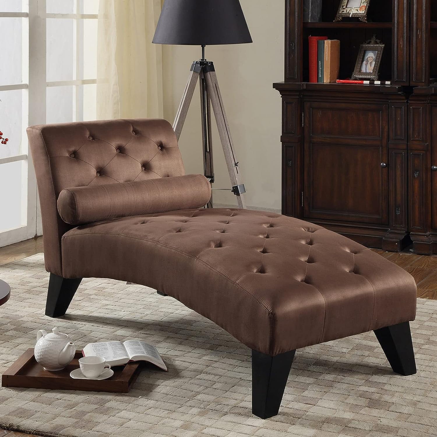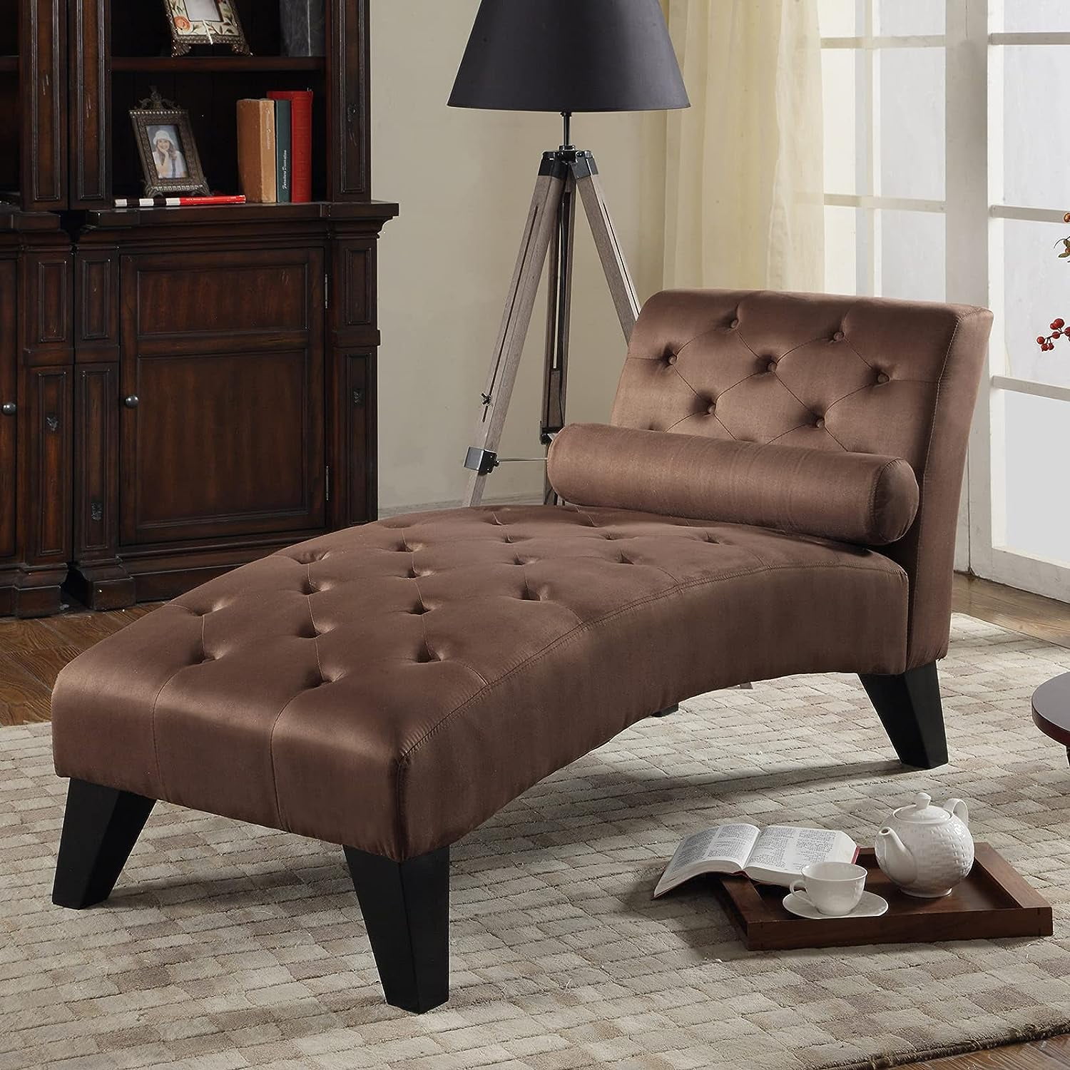 ★Tufted Buttons Back★ ★Pillow for Lumber Support★ ★Wood Legs★ ★Comfortable Seating★ ★Affordable★ This modern with a touch of elegance Mila chaise lounge will complete your room for that private oasis you dream about. Microfiber material with tufted buttons feel luxurious. Comes with a pillow to accentuate the overall look, but also provide support when sitting for a long period of time. Specification: Brand: Nathaniel Home Color: Coffee Material Microfiber Size: 61 x 26.5 x 32″ Item Weight: 58 Pounds Back Style: Tufted Back Seat Material Type: Polyester Style: Contemporary Pattern: Solid Room Type: Living Room Age Range (Description): Adult Shape: L-Shaped Surface Recommendation: Indoor Model Name: Mila Contemporary Chaise Lounge Product Dimensions: 61″D x 32″W x 26″H Recommended Uses For Product: Living Room,Lounge,Bedroom