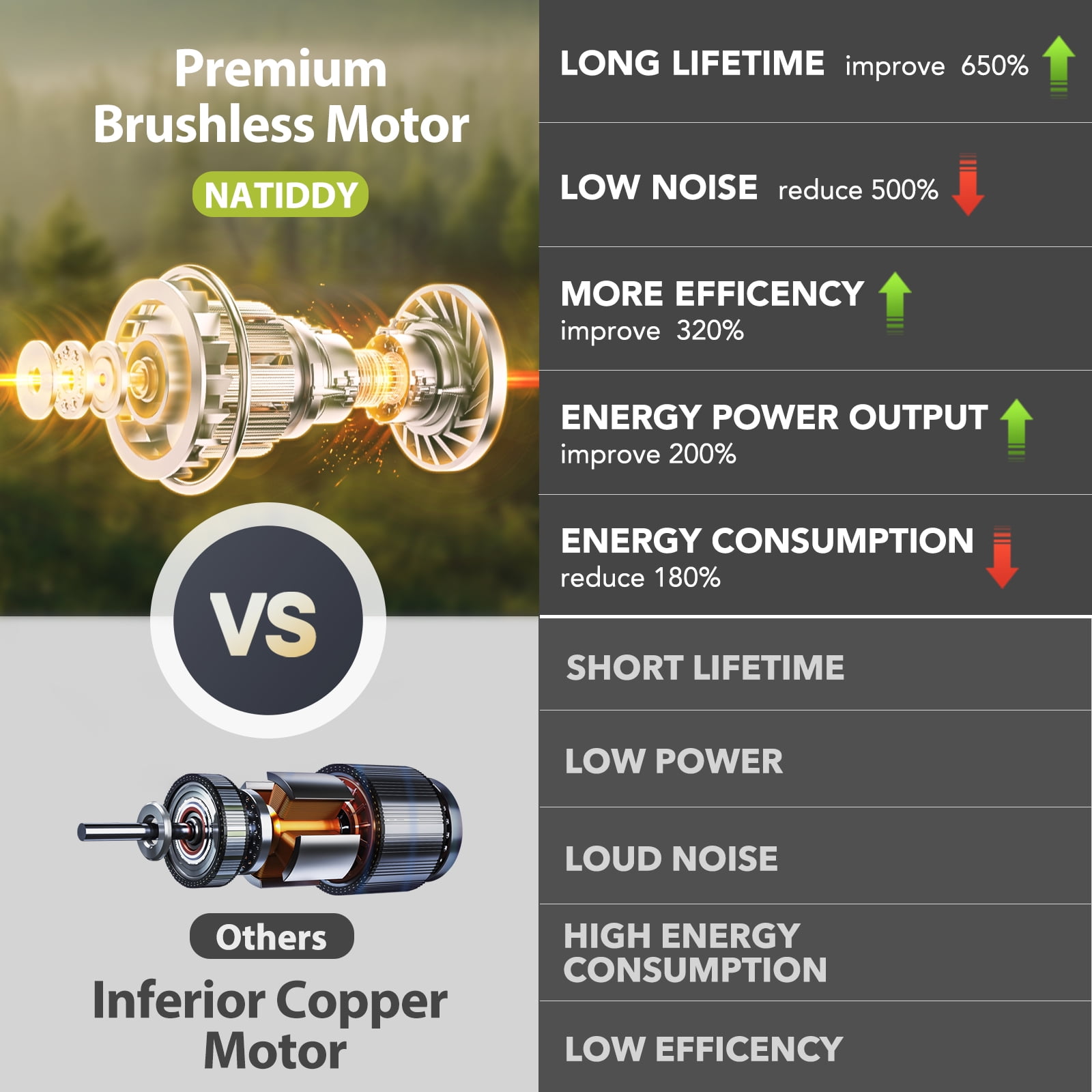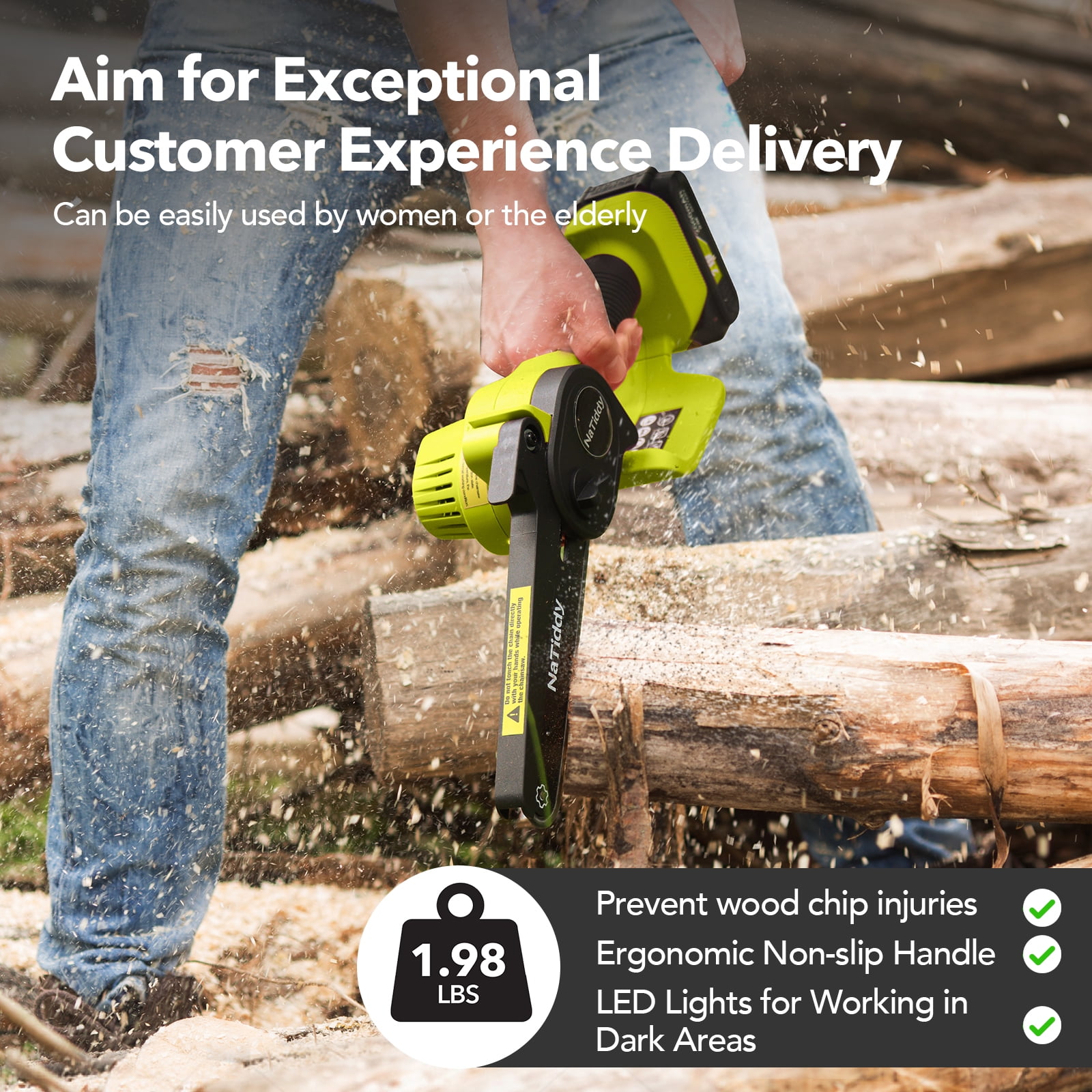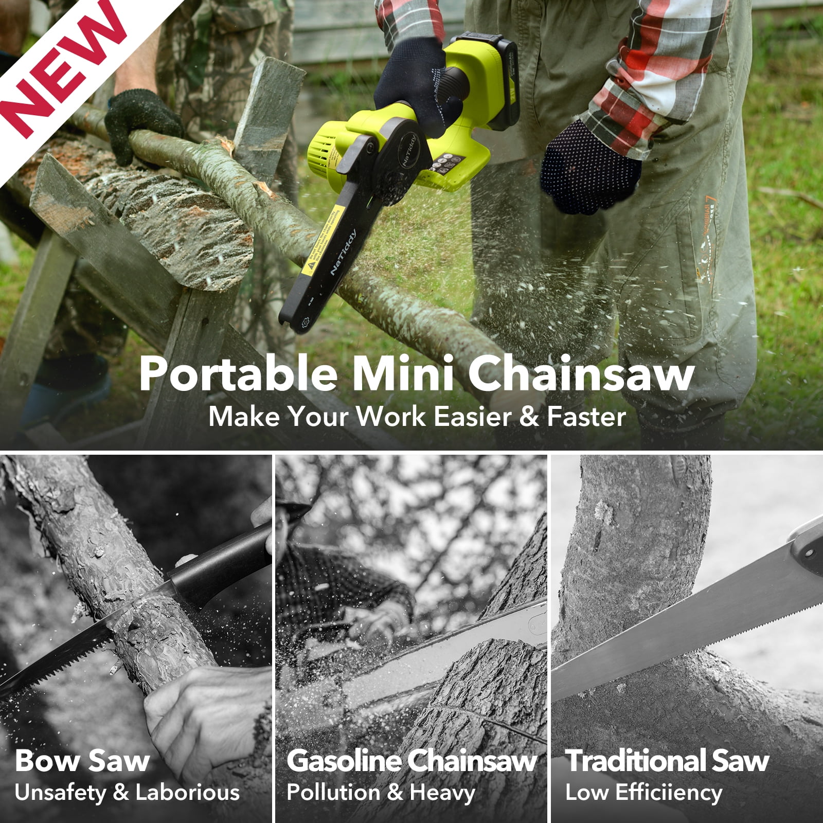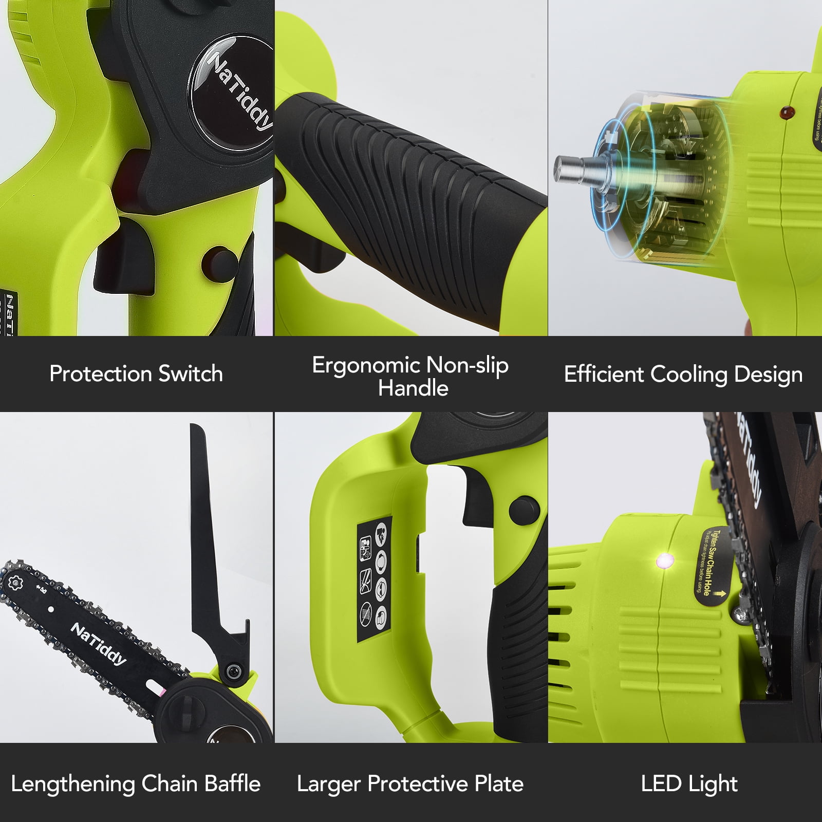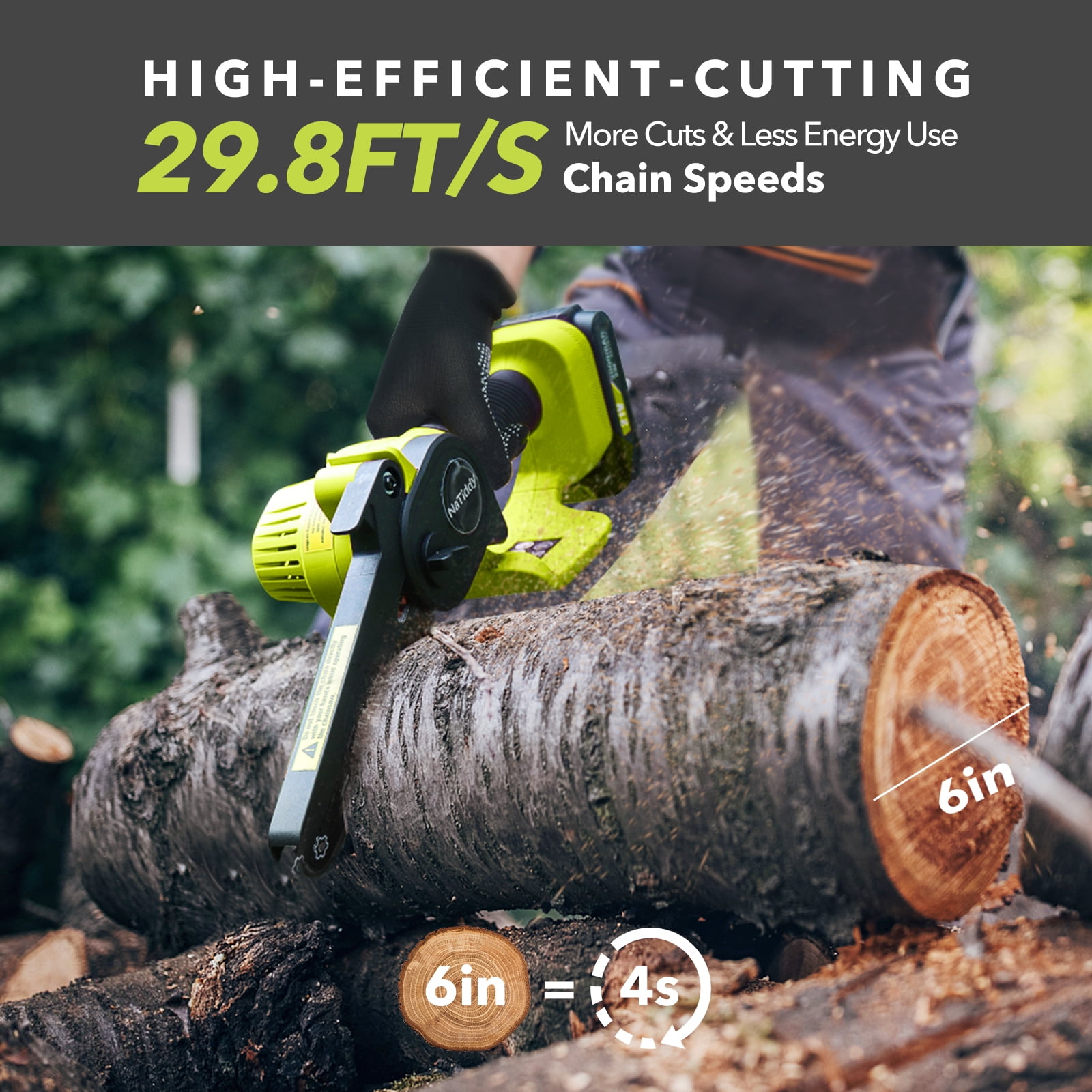 【Powerful and efficient cutting】This mini chainsaw is equipped with a 21V high-power battery and a powerful brushless motor, combined with a high-temperature hardened chain, making the cutting smoother and more efficient. It has ample power and higher cutting efficiency, with a speed of 20.8 feet/second, it can cut a 6-inch diameter log in just 6 seconds, like cutting through butter! It makes your yard work so easy. They are more portable than wired chainsaws, faster than reciprocating saws, and lighter than gasoline saws. (Specific values vary depending on the actual size and hardness of the wood). 【2* high-capacity batteries and 2* chains】 We know that battery life is your biggest concern when it comes to mini chainsaws. Our rechargeable mini chainsaw comes with 2 packs of 2.0 batteries and a fast charger. When one battery runs out of power, you can replace it with a spare battery. Two batteries are enough to meet your daily use. In addition, the Natiddy mini chainsaw comes with 2 chains, using high-quality guide chains, which have undergone deep quenching treatment to ensure smoother and more wear-resistant cutting. Enjoy your cutting work with low energy consumption, low noise, and high efficiency. 【One-handed use chainsaw】This portable battery chainsaw weighs only 1.98 pounds, with a length of only about 12 inches, small in size, comfortable to grip, and lightweight. This is an ergonomic design that can be operated with one hand, even for beginners. The biggest feature of this cordless mini chainsaw is its portability, making it easy to work anywhere, even in narrow spaces. At the same time, it is very suitable for women and the elderly to operate with one hand, and it is not easy to fatigue even after long-term use. It is user-friendly for those with weak wrists or arthritis! 【Ready to Use with Tool-Free Installation & Tensioning】This cordless mini chainsaw with a 6-inch bar is almost ready to use out of the box. You don’t need to worry about using tools, the chain and saw can be easily installed and replaced, easy to install and operate. The wireless mini chainsaw is already assembled, you just need to use the included screwdriver to adjust the tightness of the chain by turning the screw, and then tighten the screw and insert the battery to use it. There is a detailed English manual with pictures to illustrate the steps. For safety reasons, please remove the battery pack of the electric chainsaw when not in use. 【safety first! Upgraded version of mini chainsaw】This battery-powered chainsaw has 6 safety designs to make the mini chainsaw safe enough: ① Gloves. Prevents branches from hurting your hands; ② Widened splash guard. Prevents debris from splashing; ③ Safety lock. The saw can only be started by pressing the safety lock and trigger at the same time, preventing accidental start-up and causing injury; ④ Anti-slip handle. Prevents the mini wood cutting chainsaw from slipping off your hand; ⑤ Goggles. Prevents debris from splashing and hurting your eyes during cutting; ⑥ An LED light has been added, which can be used for lighting in dark forests.