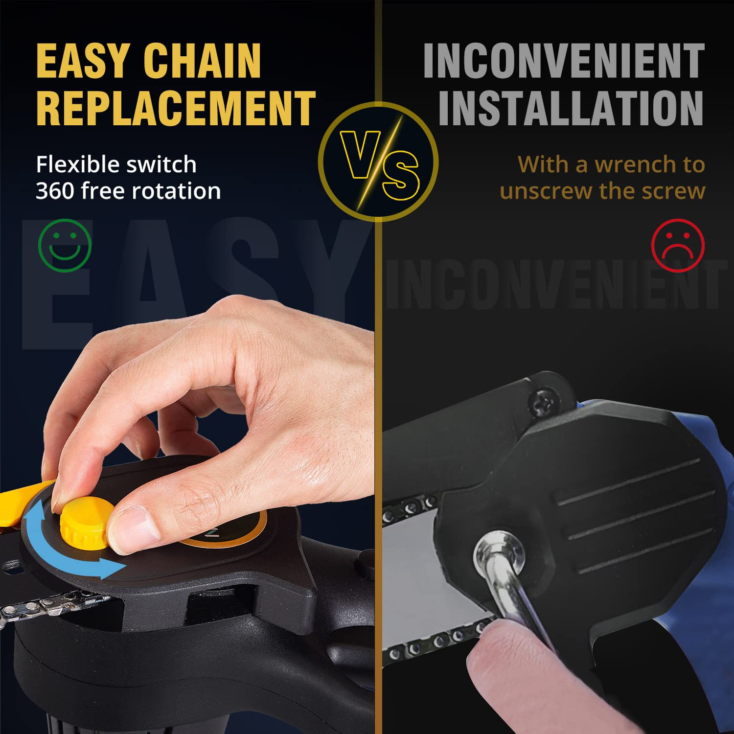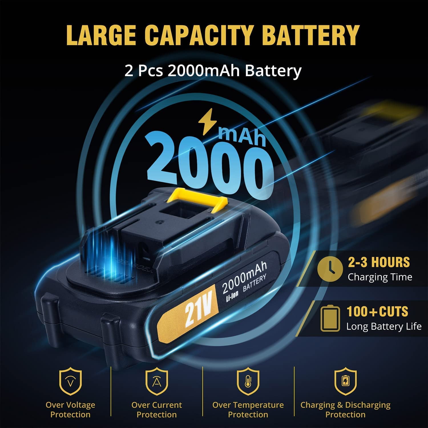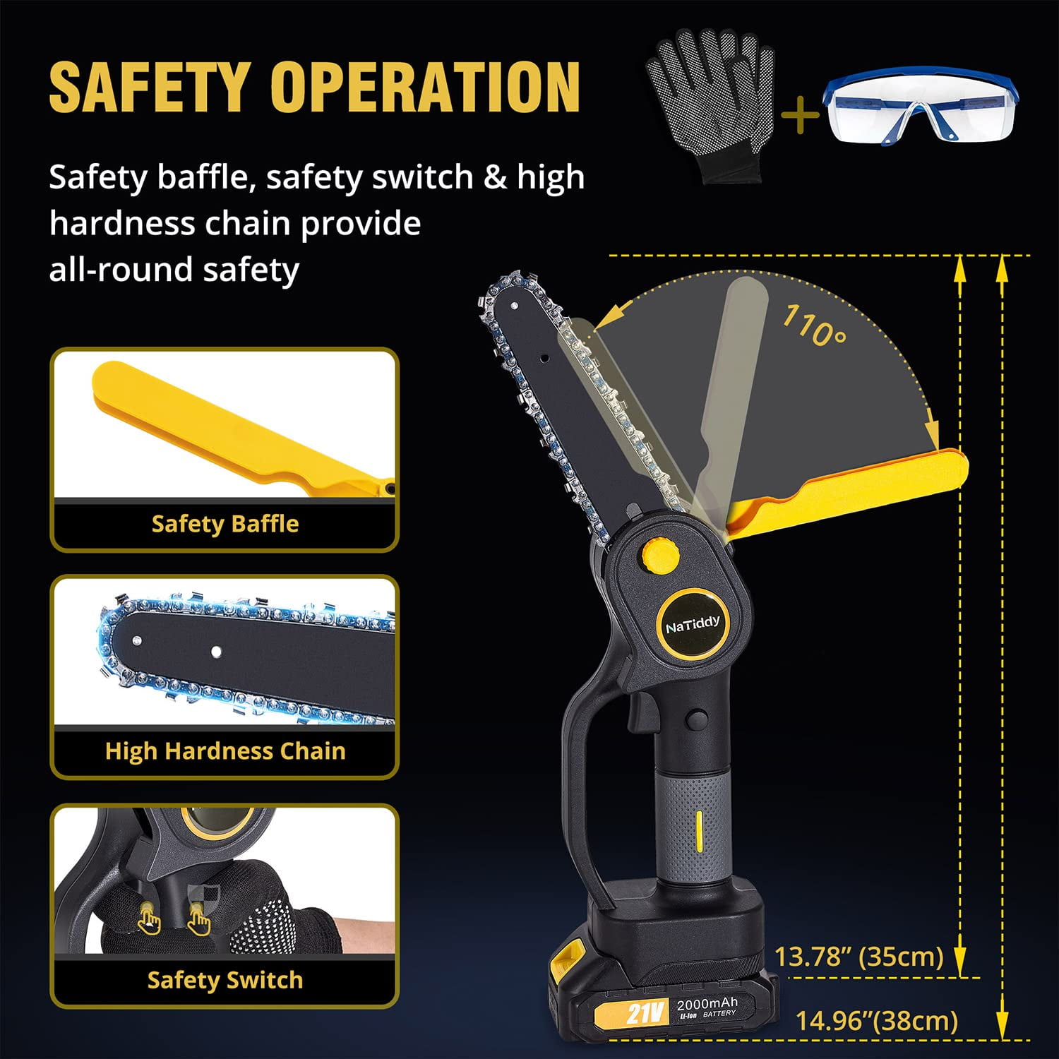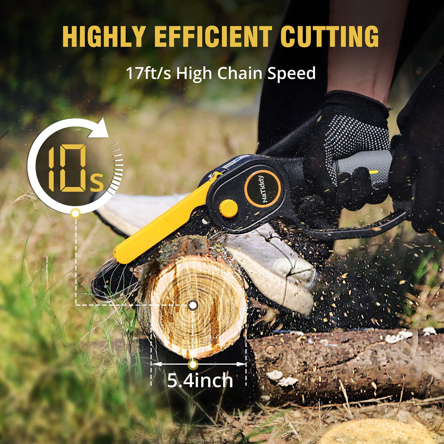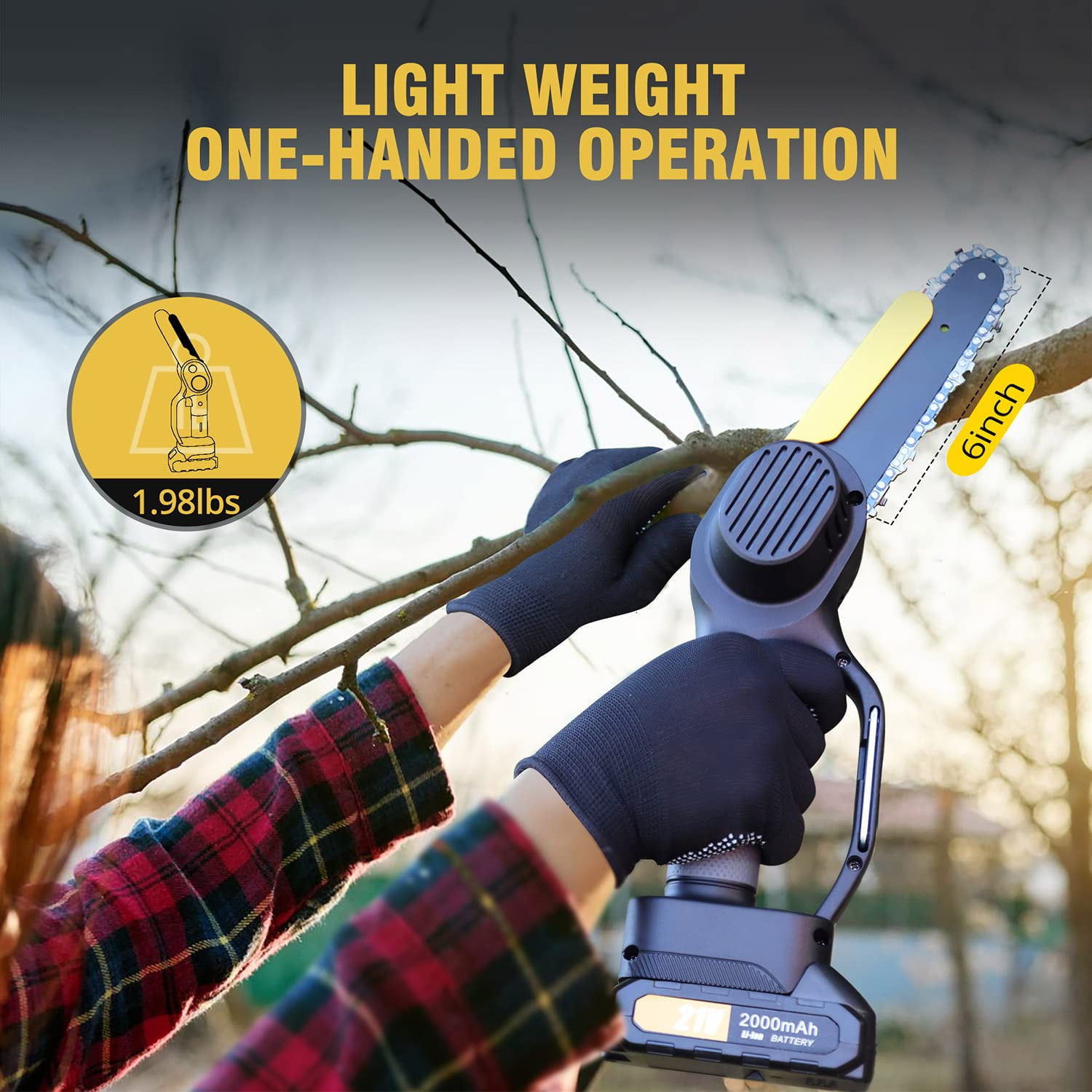 【Advanced Brushless Motor】This mini chainsaw adopts brushless motor to control battery energy flow. Compared with traditional pure copper motor, the advanced brushless motor is more powerful. It runs faster and more stably but with less wear and lower noise and temperature. By virtue of 24.8ft/s high chain speed, cutting 5.4 inch wood just takes 10s (The value varies with the size and hardness of wood). With it, the chainsaw can get efficient energy use, longer lifetime and less battery charging 【Rechargeable Large-capacity Batteries】This battery powered chainsaw is equipped with 2pcs 21V 2000mAh removable and rechargeable lithium-ion batteries with self-overload and temperature protection, which have fast charging speed, slow power consumption and easy installation.thus providing the chainsaw much longer run-time and more power. thereby reducing wear and extending the life of the saw.you can use the NaTiddy Mini Chainsaw outside without any worries, portable and low energy consumption 【One Hand Operated】This 6 inch handheld mini chainsaw just about 1.98lbs,It is ergonomically designed for easy control and comfortable grip. Furthermore, it is equipped with professional work gloves for your comfortable and safe use. It is easy to use for women and the elderly, and will not feel tired after a long time of use. This mini electric chainsaw is very suitable for wood cutting, tree trimming, an ideal tool for gardening!Comes with a portable tool case for easy storage and portability. 【Safe and Reliable】5 security measures to ensure that the mini chainsaw has reliable safety and ensure user safety: 1.The safety lock and the switch button must be pressed at the same time to start to protect your family.2.Baffles prevent debris splash.3.Comes with goggles to protect the glasses from wood chips.4.Rubber handle improves slip resistance. 5.High-quality saw chain can provide long-lasting durability.Mini Chainsaw Rubber ergonomic handle provides maximum slip resistance and comfort. 【What you get】You can receive 1 x Mini chainsaw(has been assembled), 2 x spare chains(one was pre-installed), 1 x goggles,1X oil bottel,2 x batteries, 1 x pair of gloves, 1 x charger, 1 x screwdriver and 1 x instruction manual. We use plastic boxes OR bag to store chain saw accessories, which are firmer.Mini chain saw is the best gift for father, wife, husband, boyfriend. if you have any product questions , please contact us through , we will provide you with 100% satisfactory service. 【Wide Application】Cordless chainsaw can be used for wood cutting, forest logging, branch trimming, shrub trimming, home improvement, widely used in gardens, farms, parks, forests, pastures, orchards, indoors, for all cutting needs. 【Gift】Perfect Gift for Men, Women, Family, Friends, Gardeners, DIYers, Valentine’s Day,Halloween,Christmas
