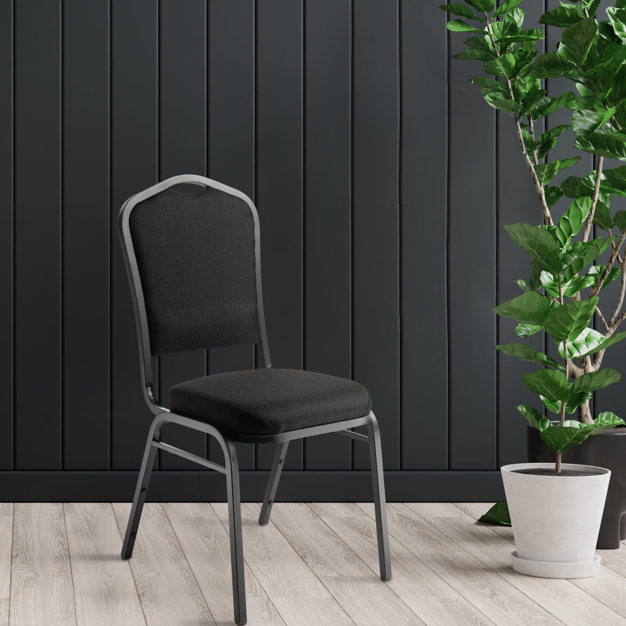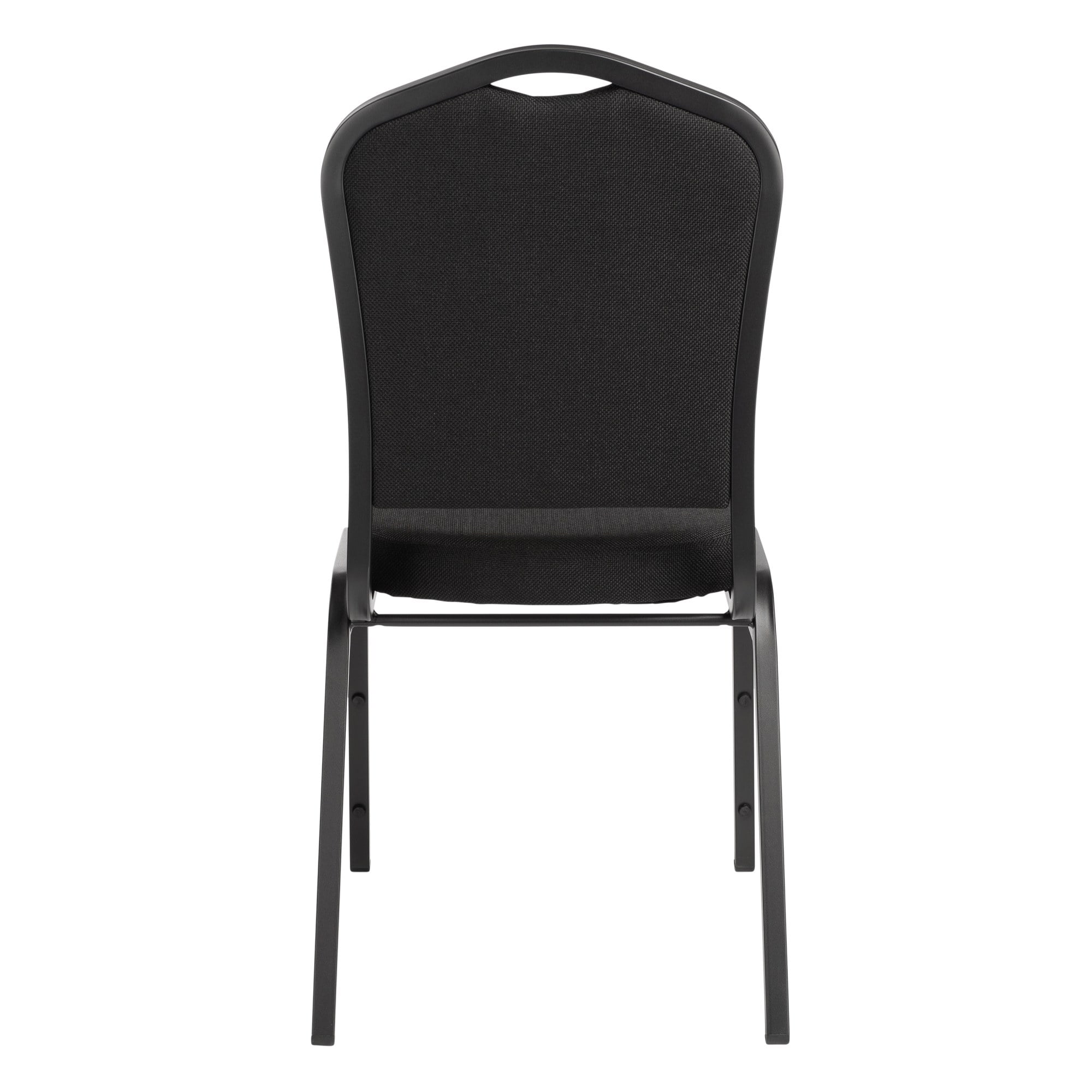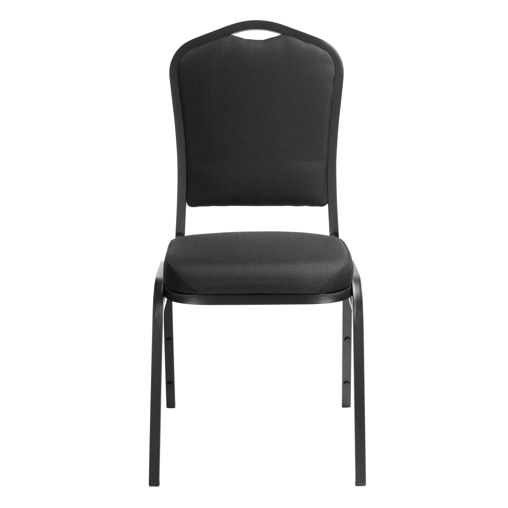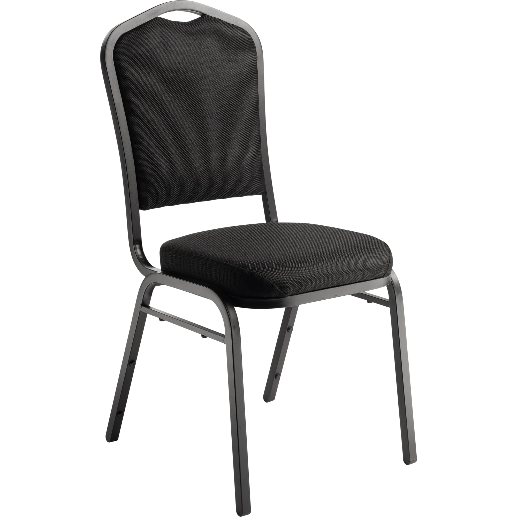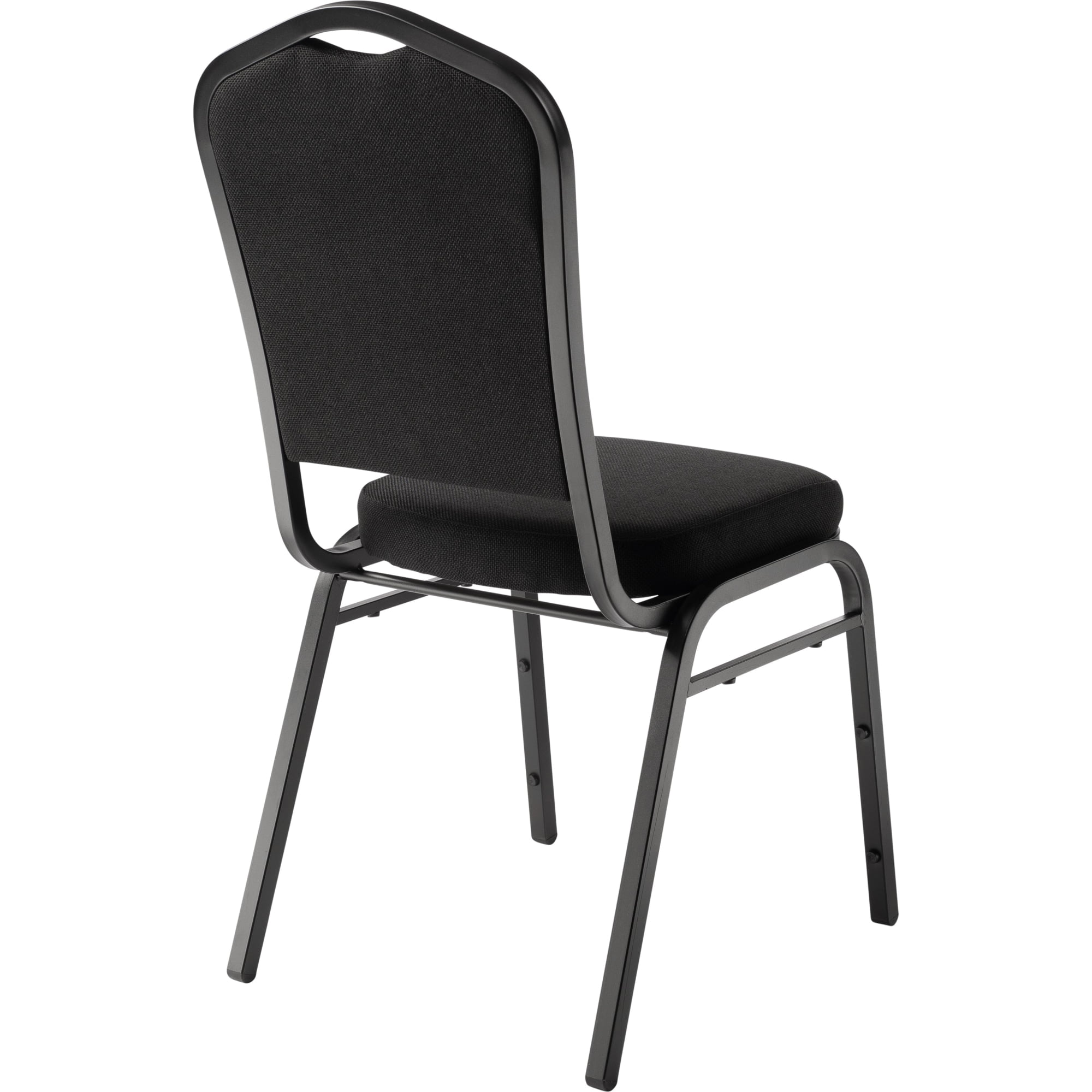 The NPS® 9300 Silhouette upholstered stack chair is durable and classy enough to use in your busiest social setting, be it a dining room or corporate banquet hall. It features a strong square 18-gauge steel frame plus an under-seat H-shaped brace for extra support. The seat features supremely comfortable and spacious 2″-thick high-density foam padding with institutional grade ebony black fabric, and a waterfall-style edge. MDF core within both the seat and crown-style backrest which has a built-in handle for easy moving and stacking. Fortifying stacking bars and twelve plastic bumpers protect the powder-coated paint finish from scratches when the chair is stacked (up to ten units high.)